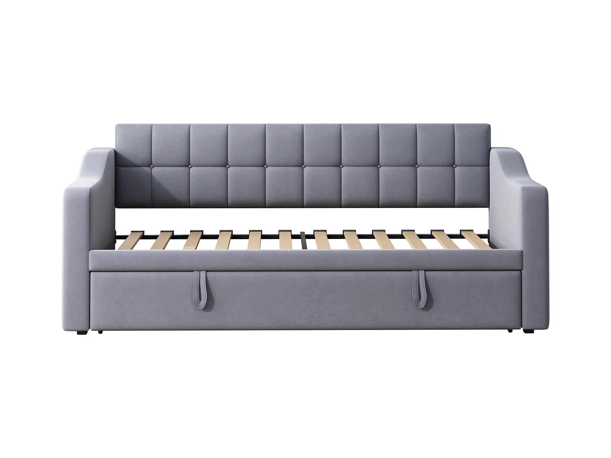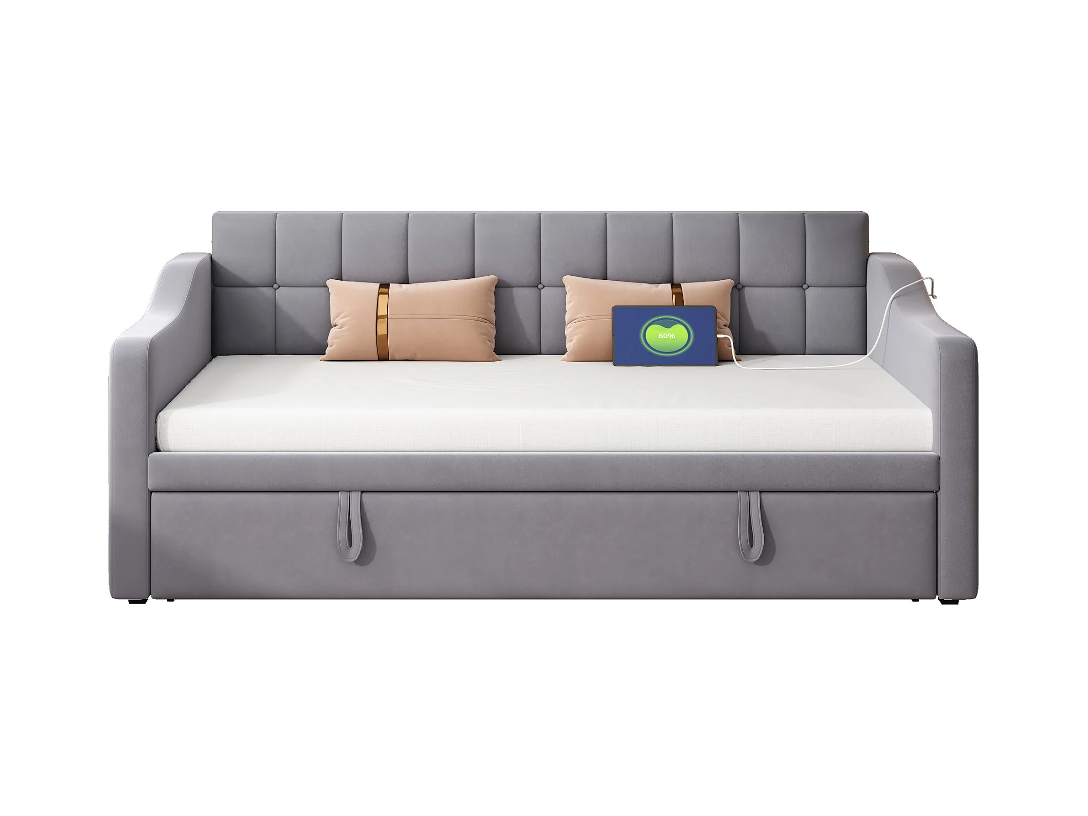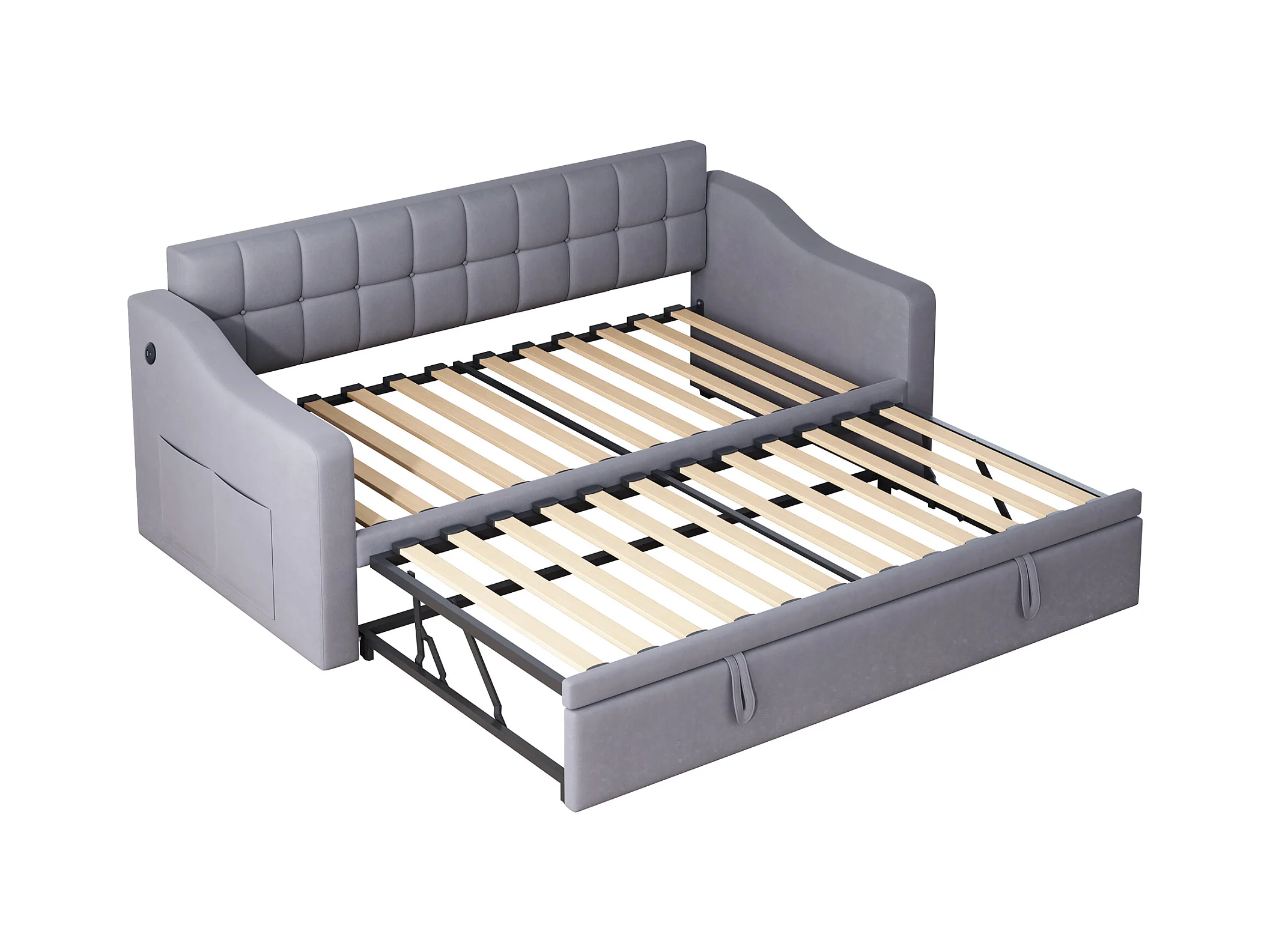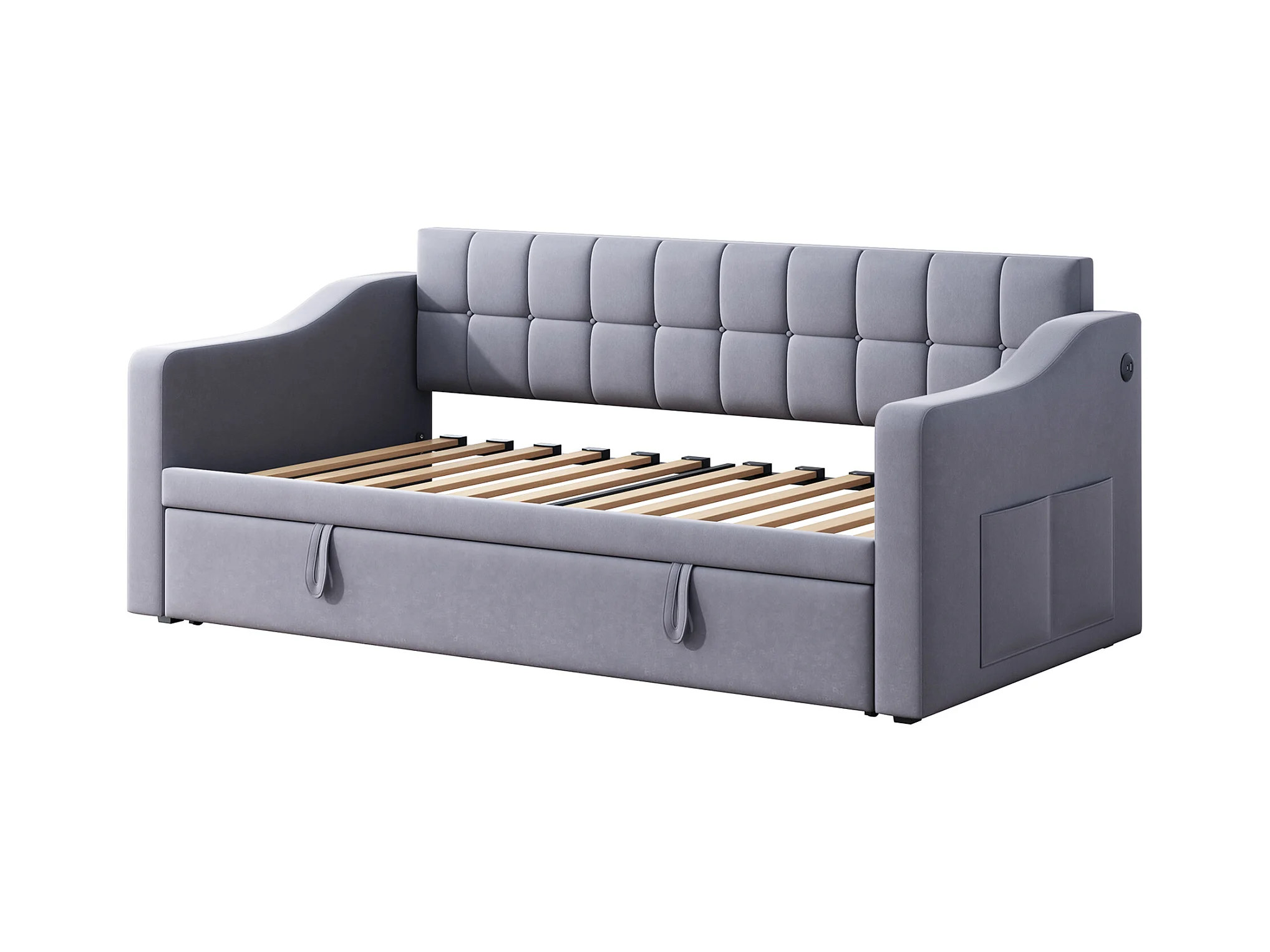 Lit banquette enfant 90x190 cm avec lit gigogne en velours gris avec prise et poche de rangement (sans matelas)