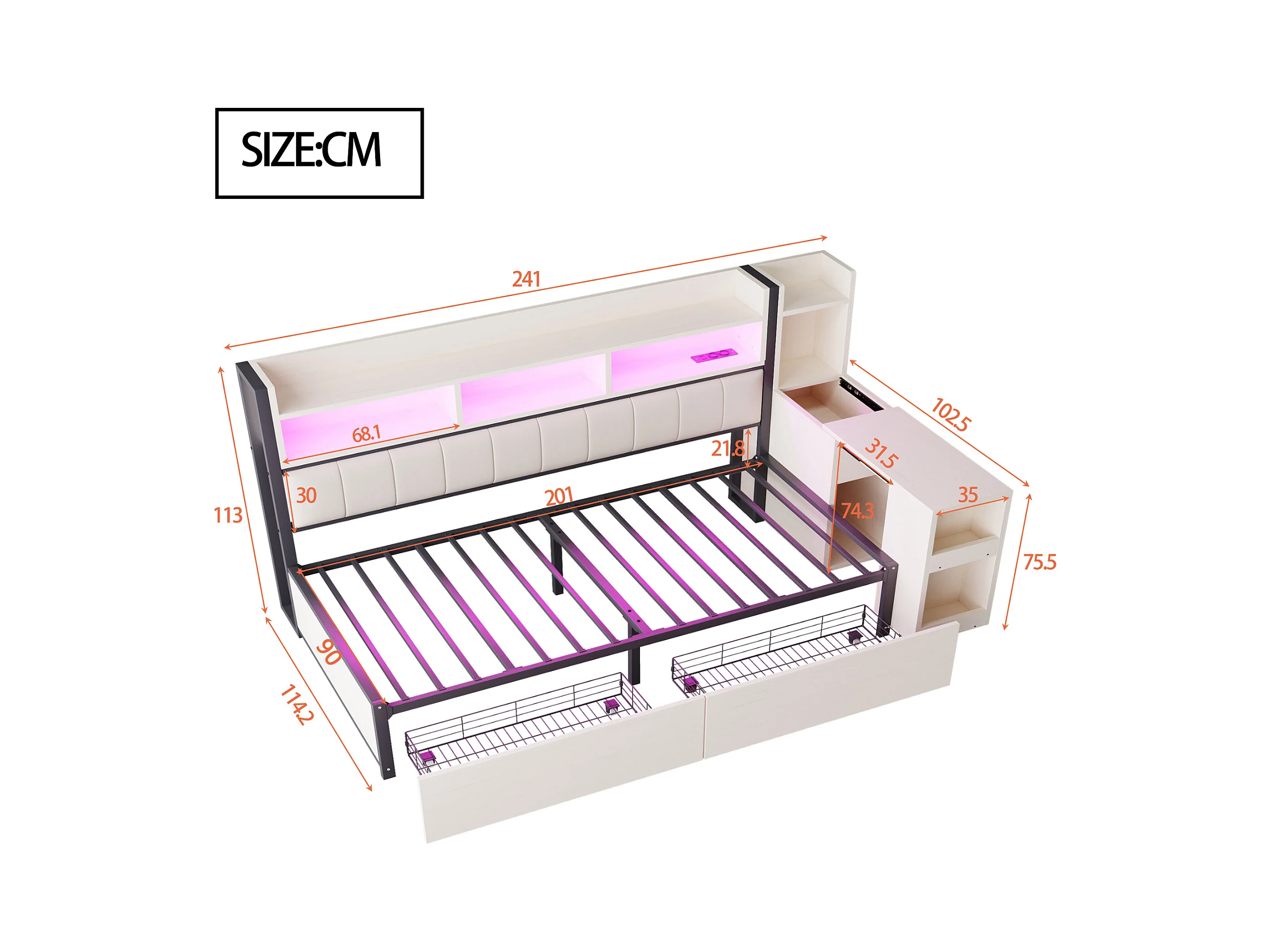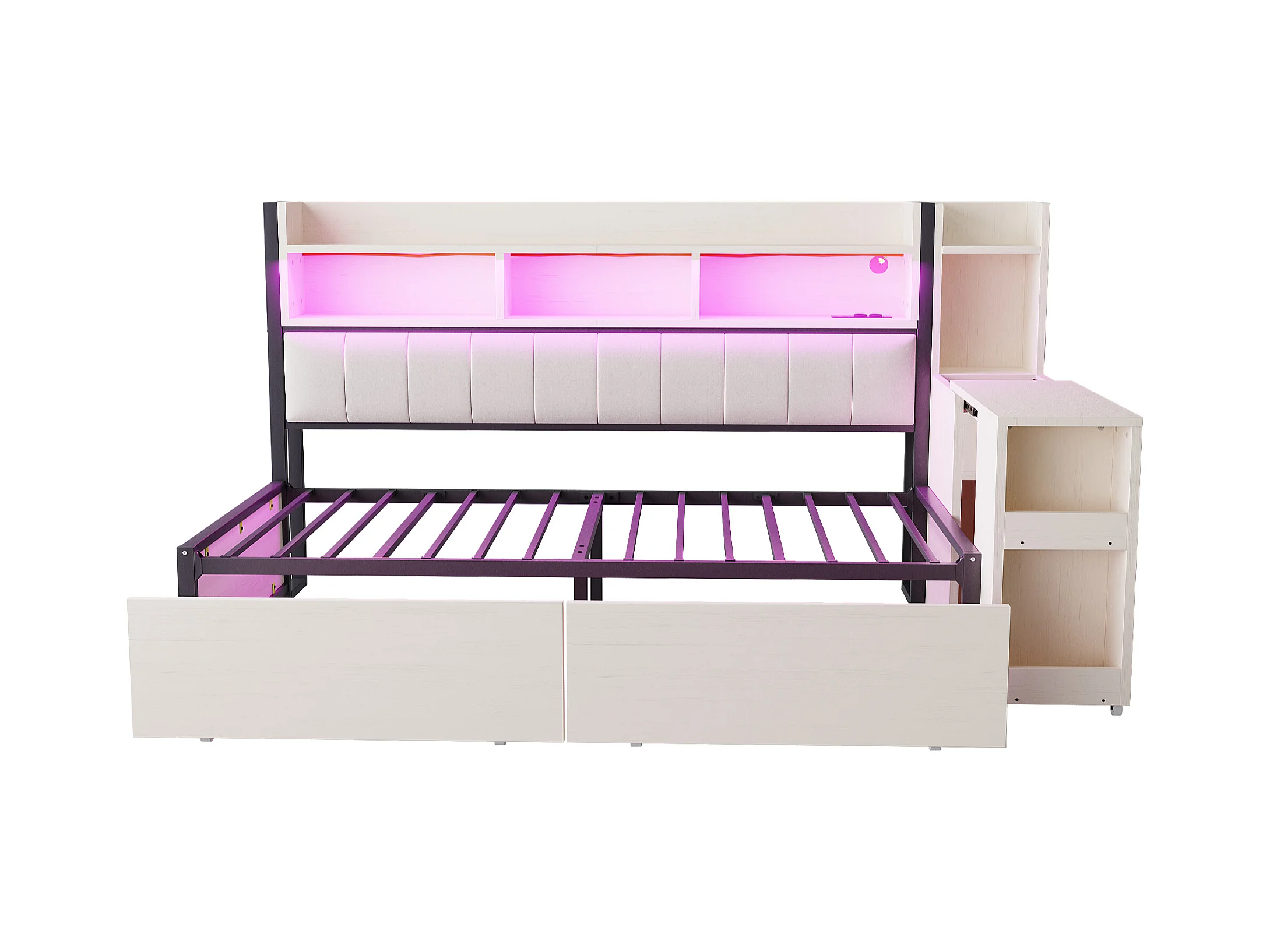 Canapé-lit 90x200 cm - avec prises - avec éclairage LED - avec 2 grands tiroirs - avec bureau coulissant - Blanc