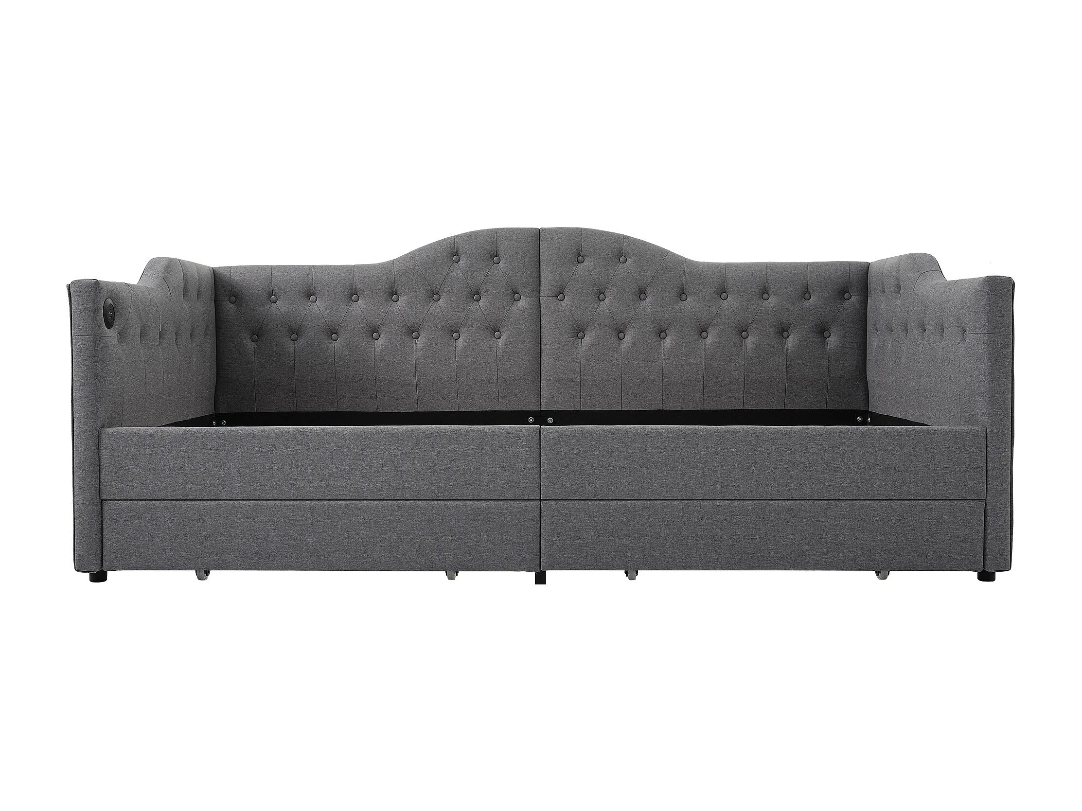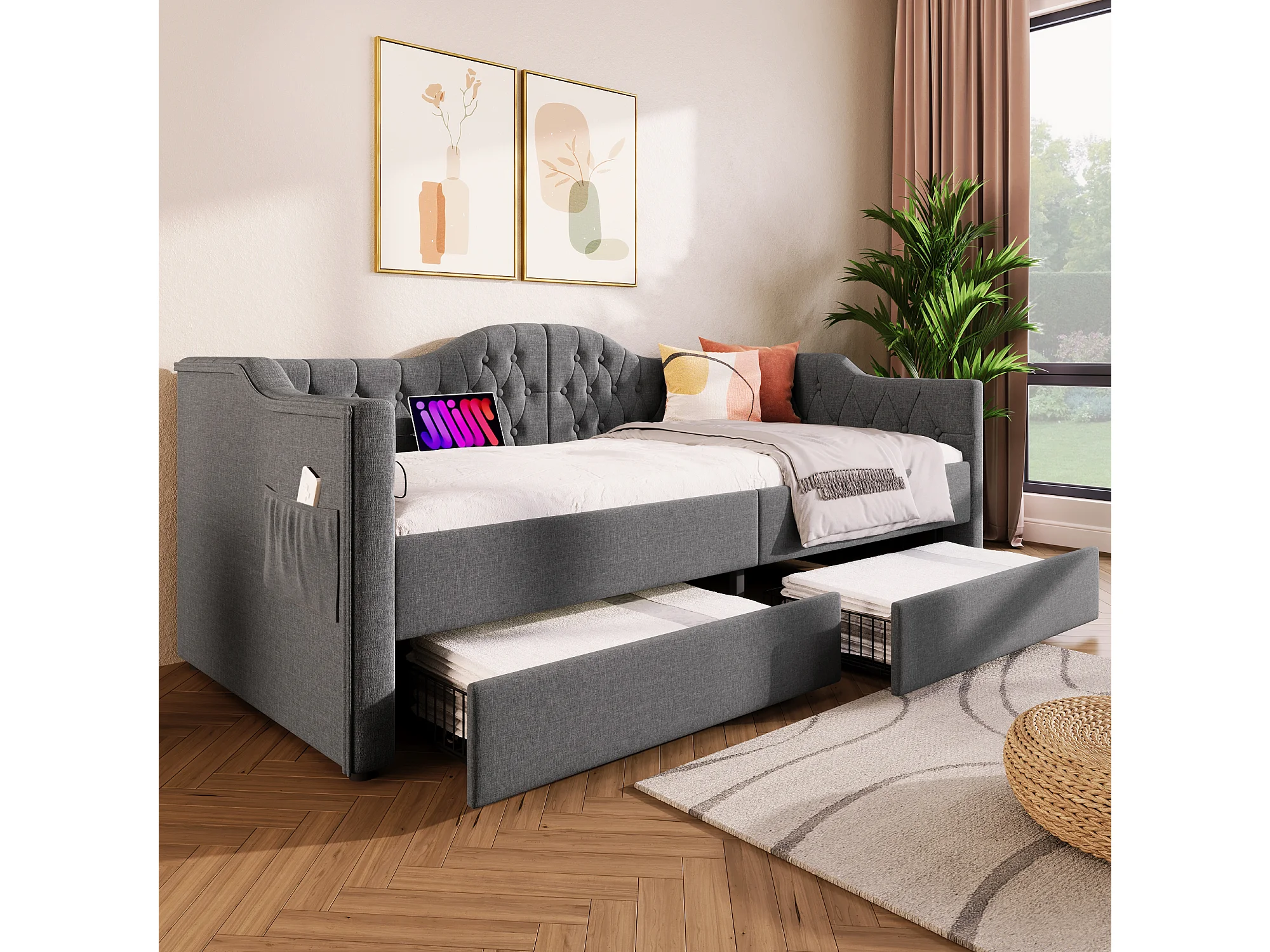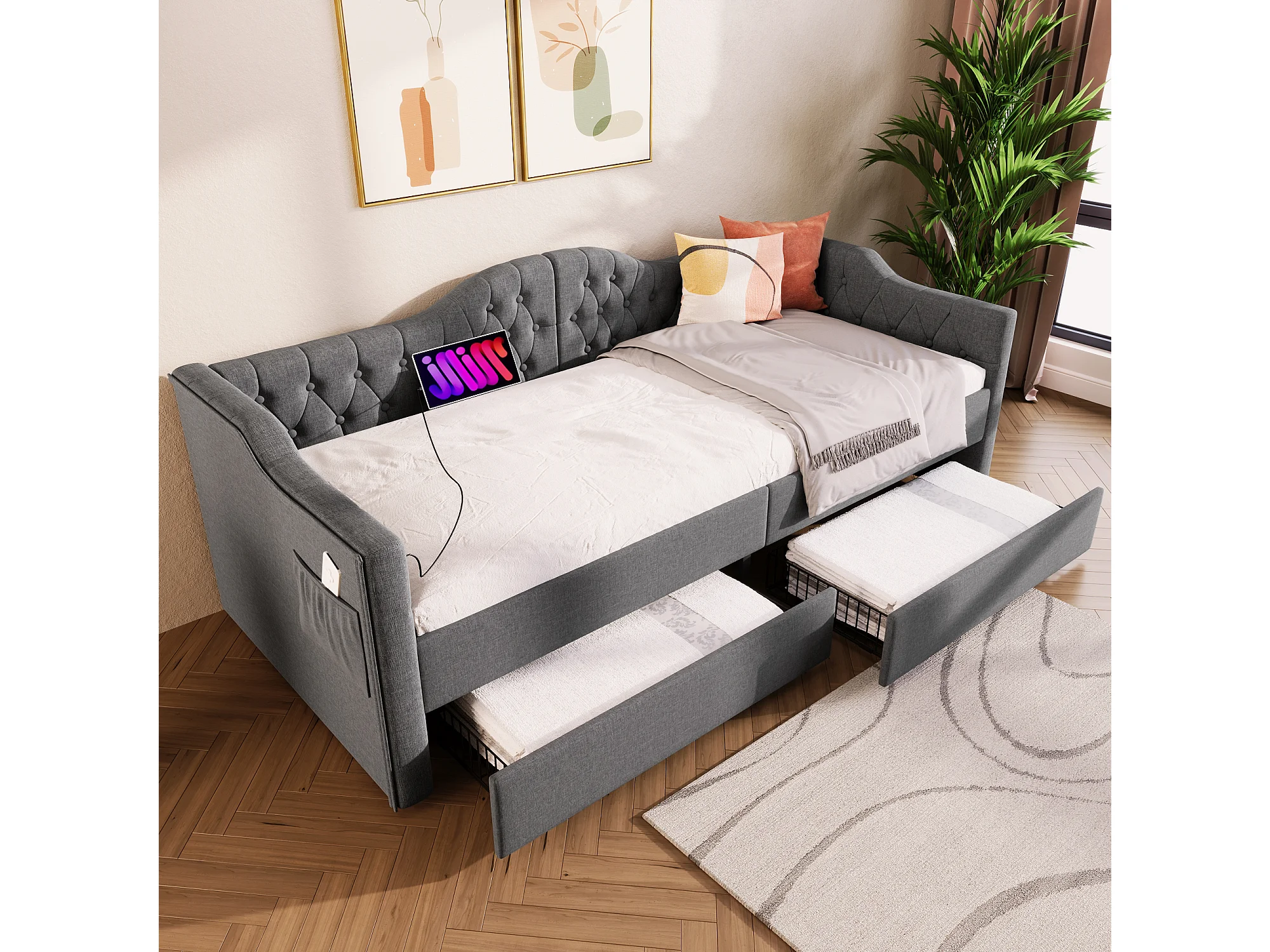 Lit enfant 90x200 cm gris avec USB Type C, en lin avec 2 tiroirs de rangement, sans matelas
