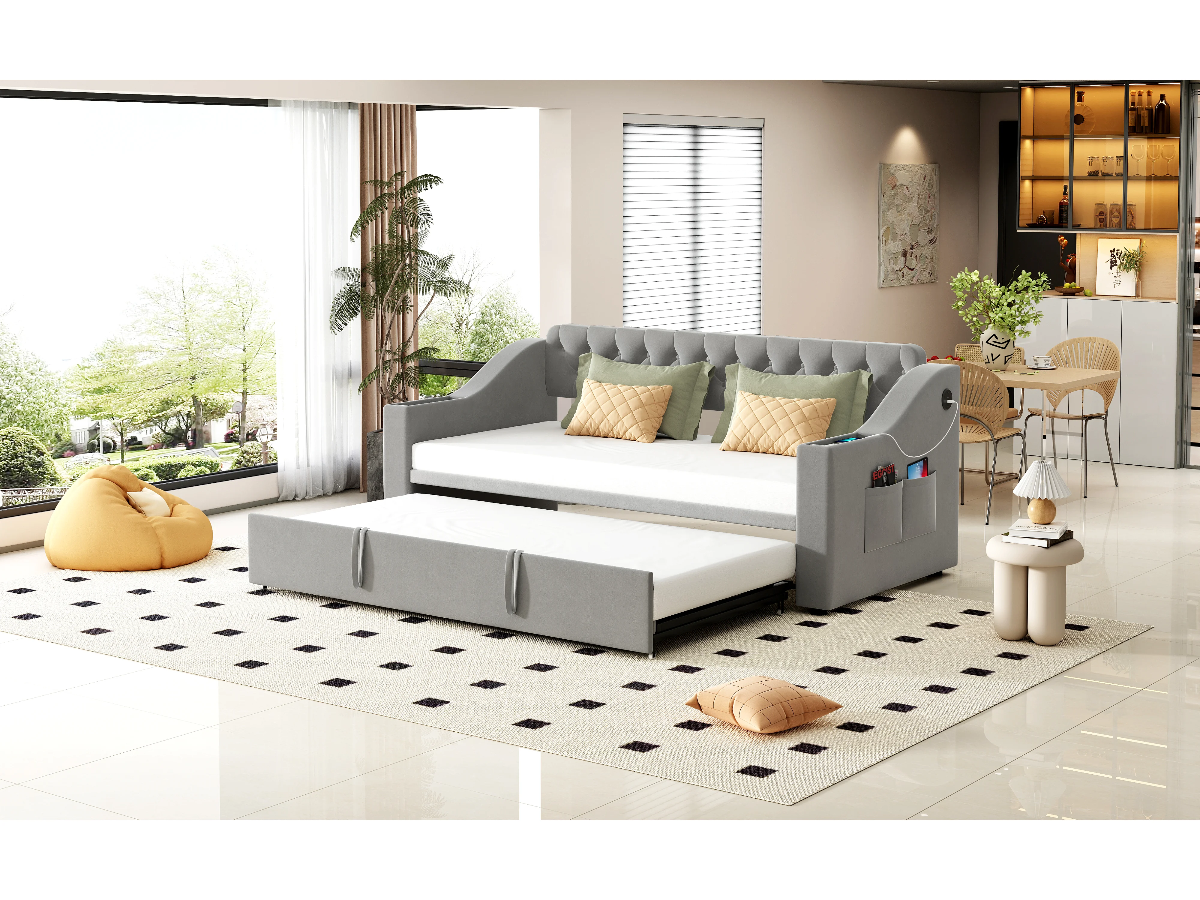 Canapé-lit avec bras larges, 90/180x190 cm, bras avec USB, rangement intégré, tissu en velours, gris (215x98.5x78.5 cm)