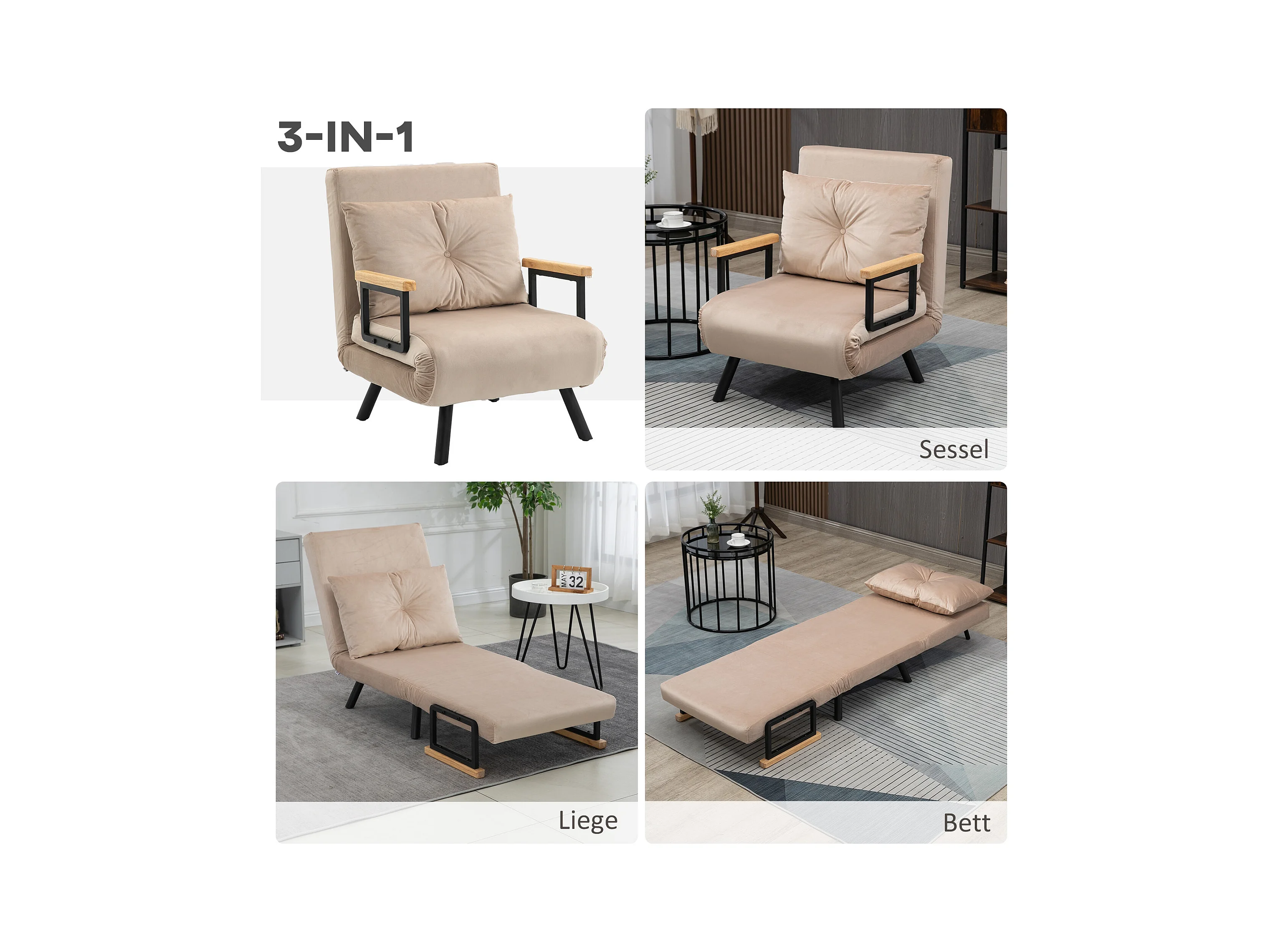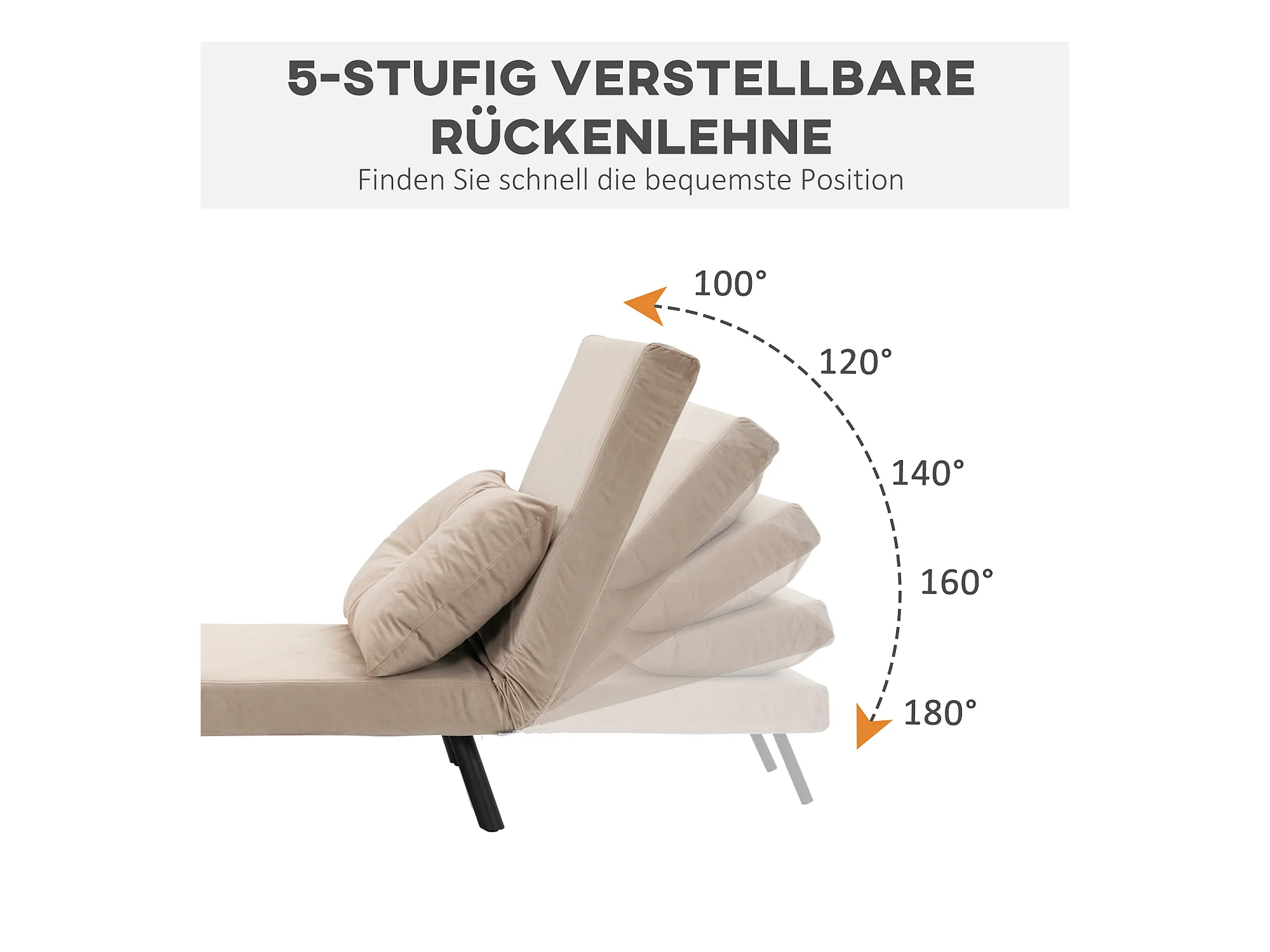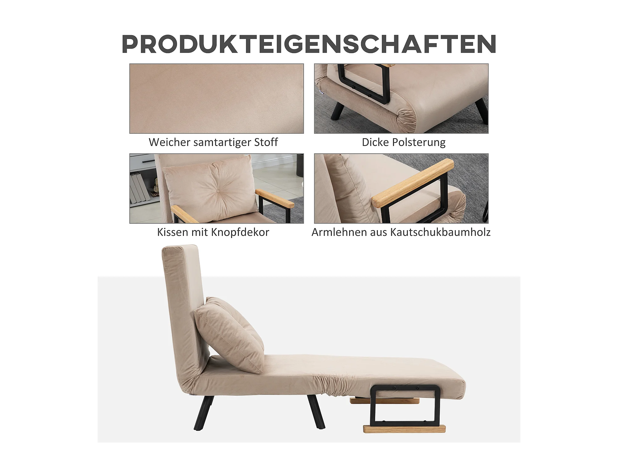 Canapé-lit convertible, 2 places, dossier réglable, Velours, Beige (63x73x81 cm)
