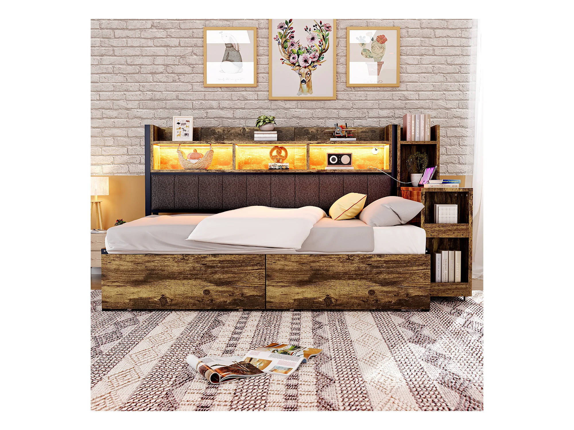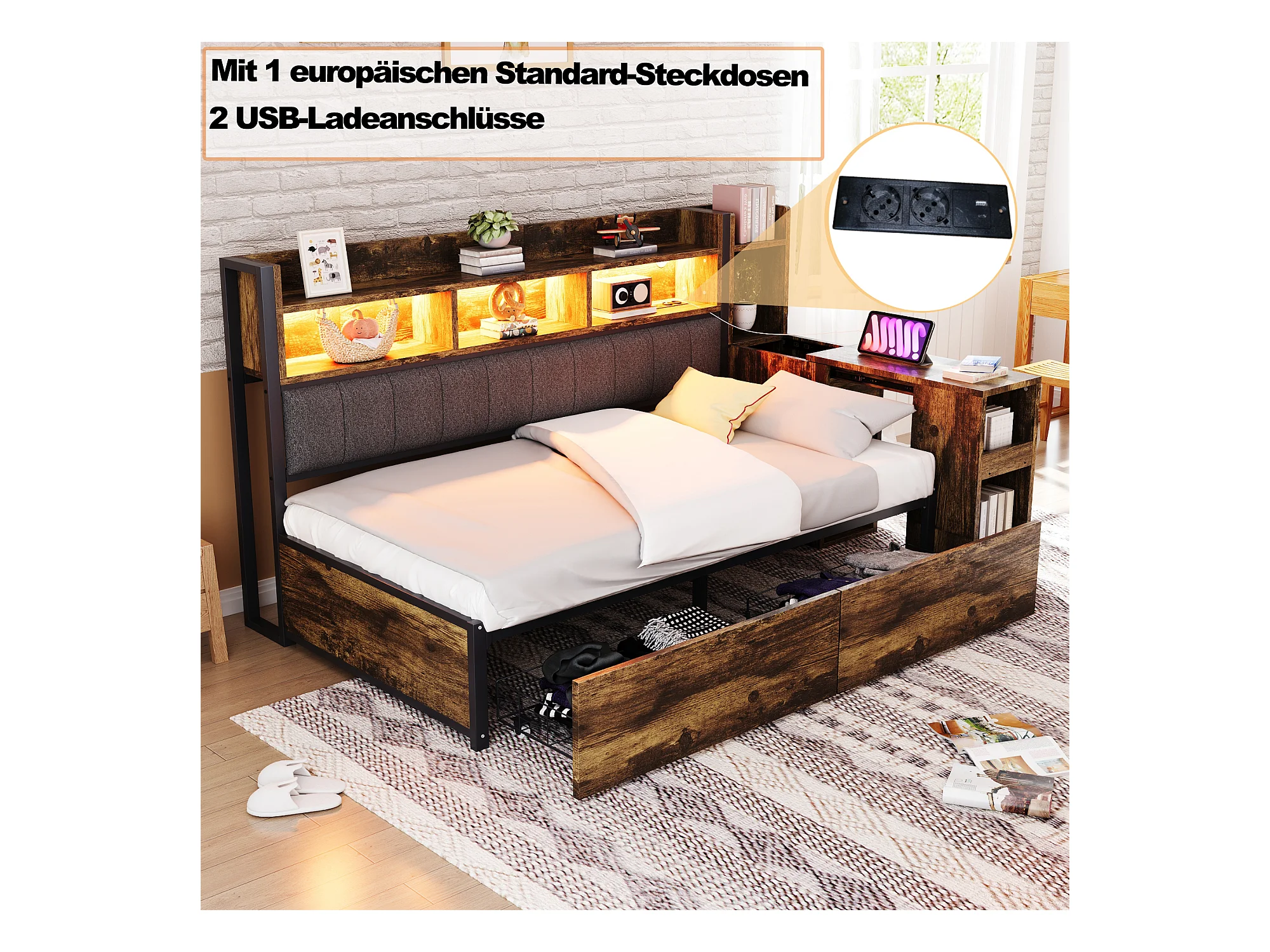 Canapé-lit en fer 90 x 200 cm - avec rangements + Leds + 2 tiroirs + bureau coulissant - MDF + méta - naturel
