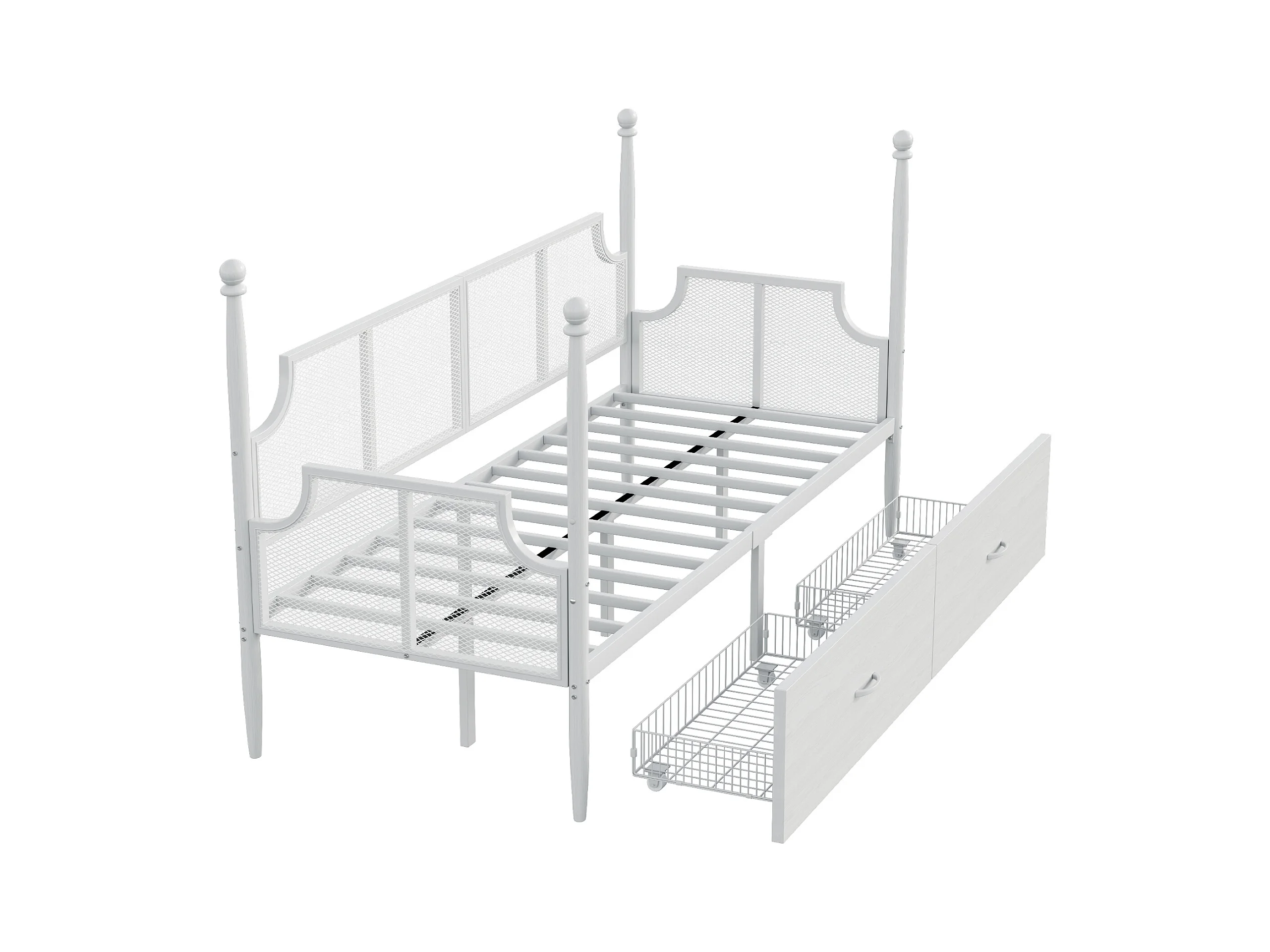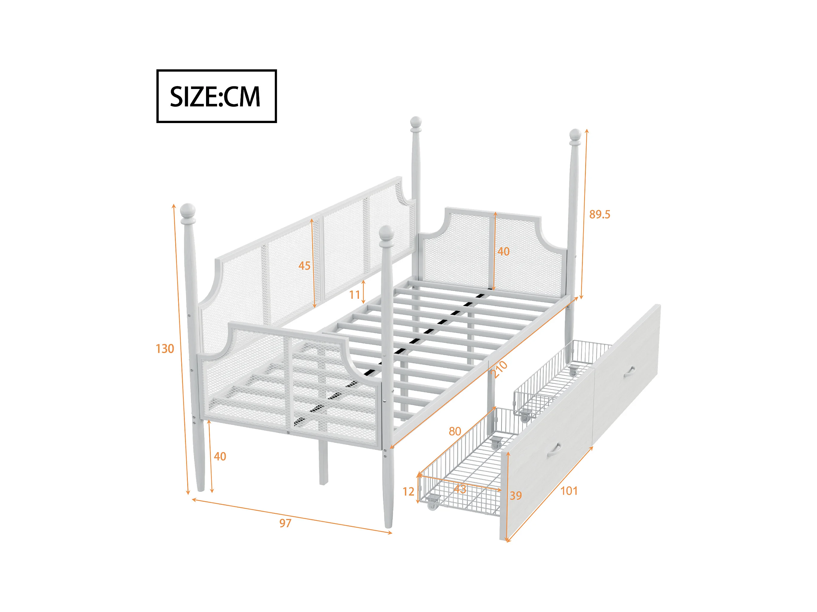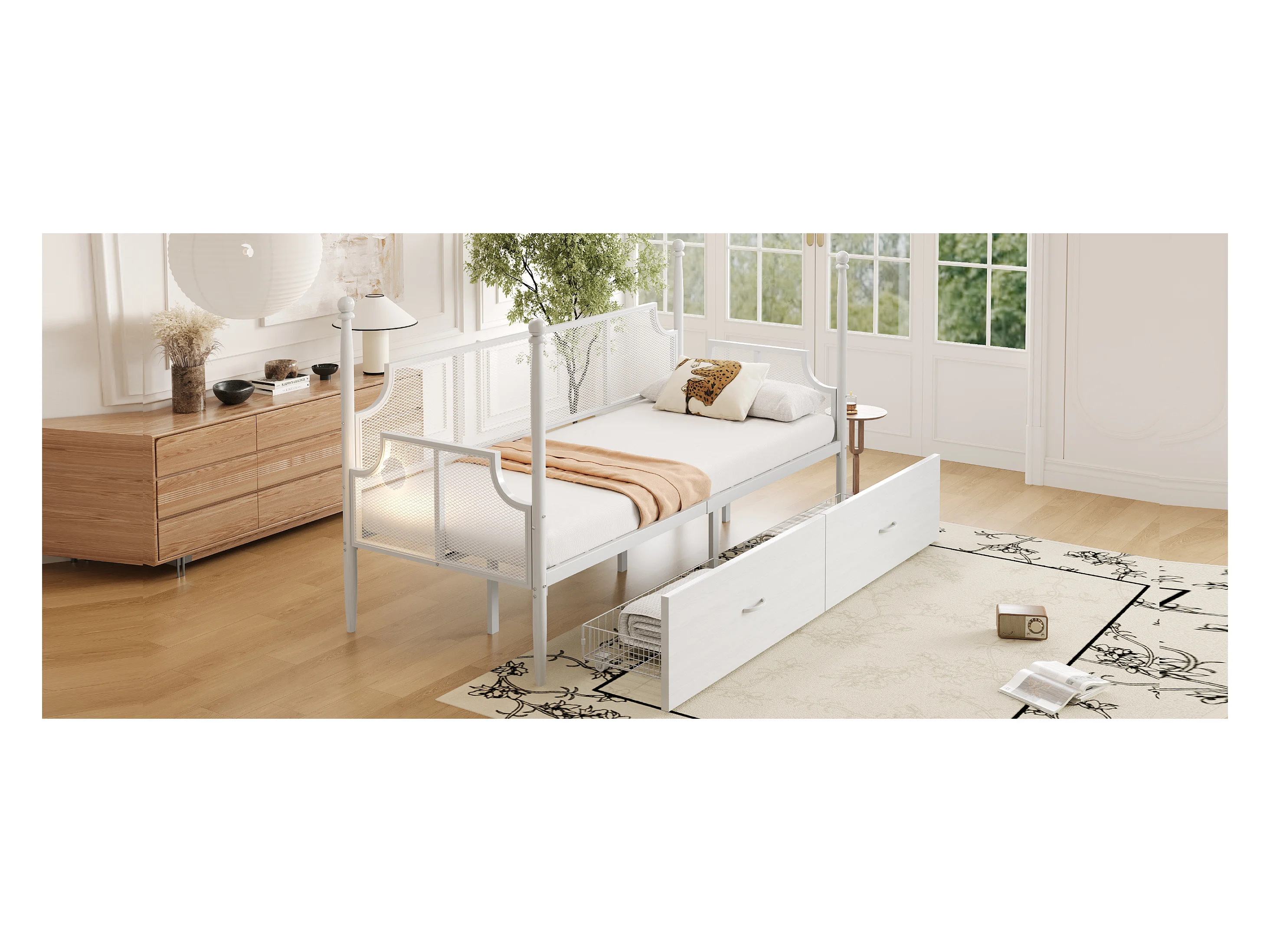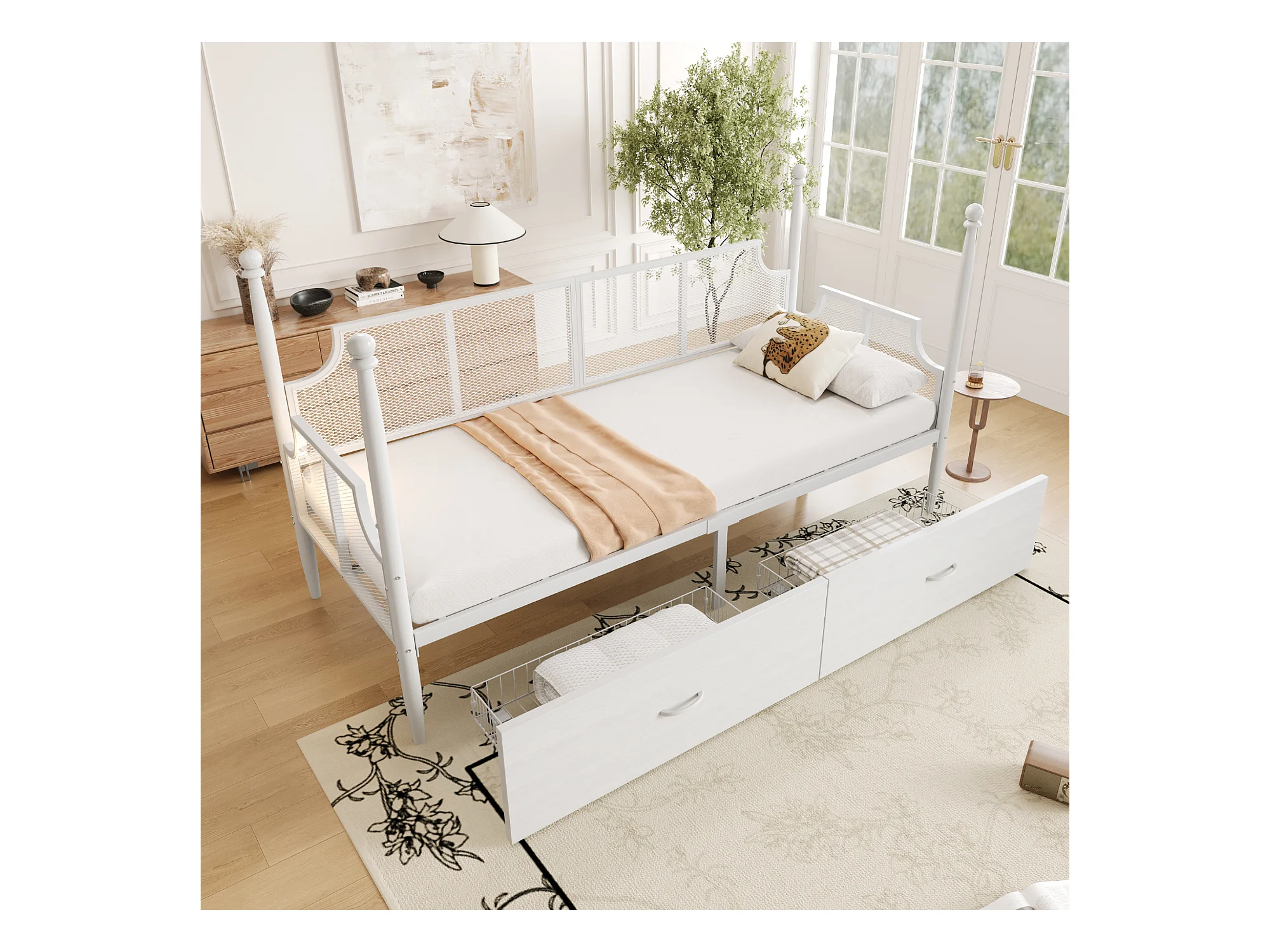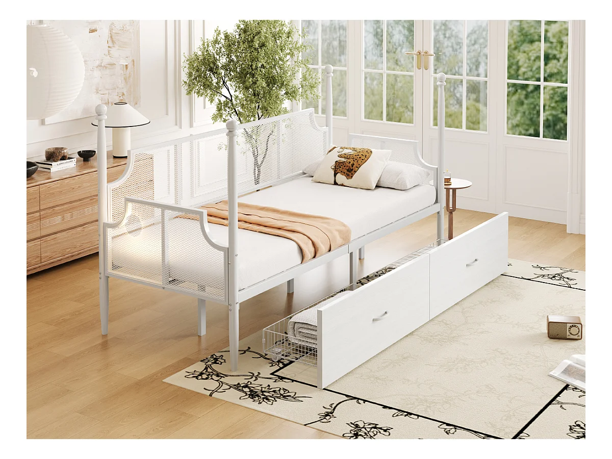 Lit banquette 90x200 cm en métal blanc, avec dossier grillagé et 2 tiroirs de rangement - sans matelas