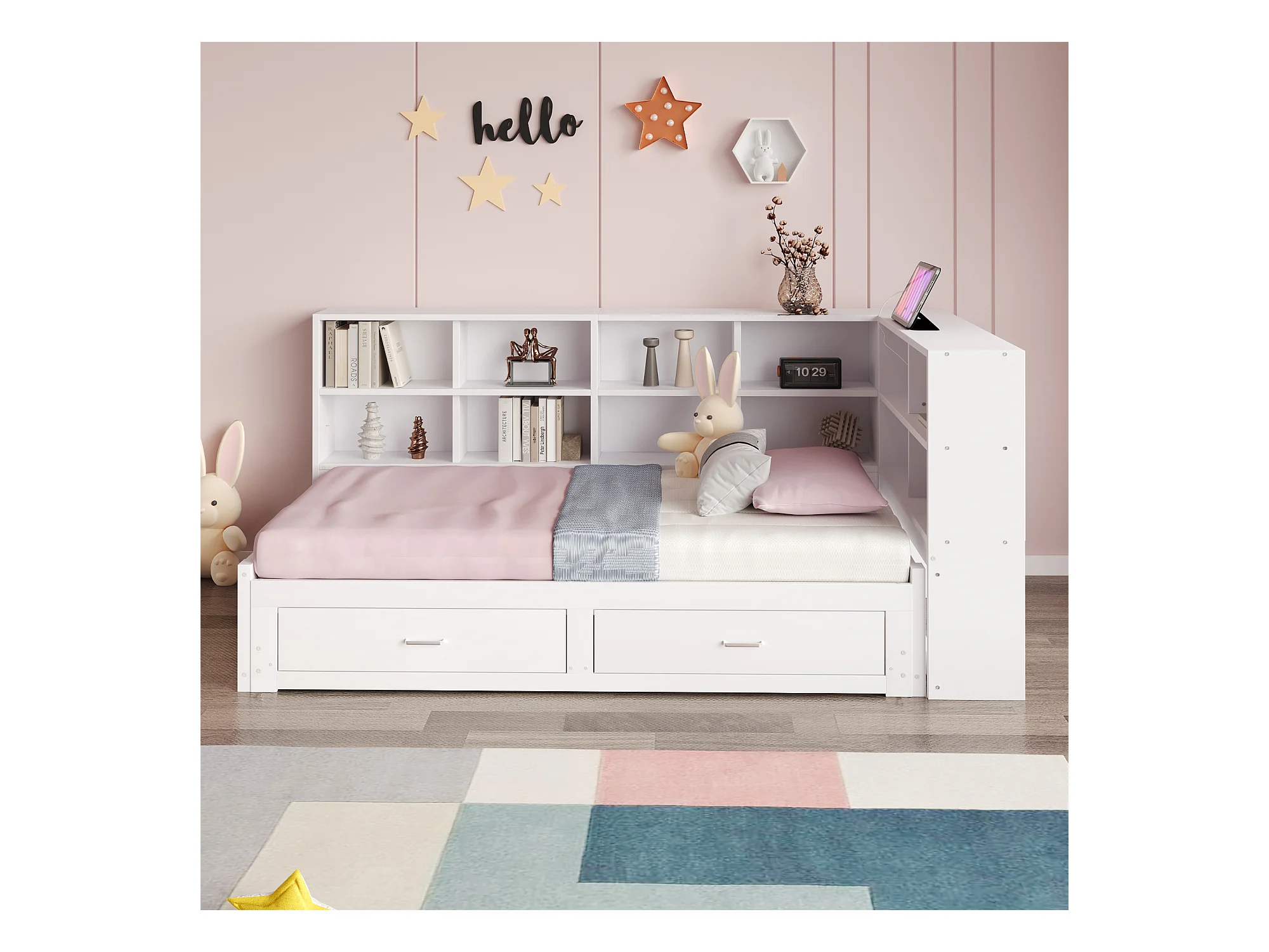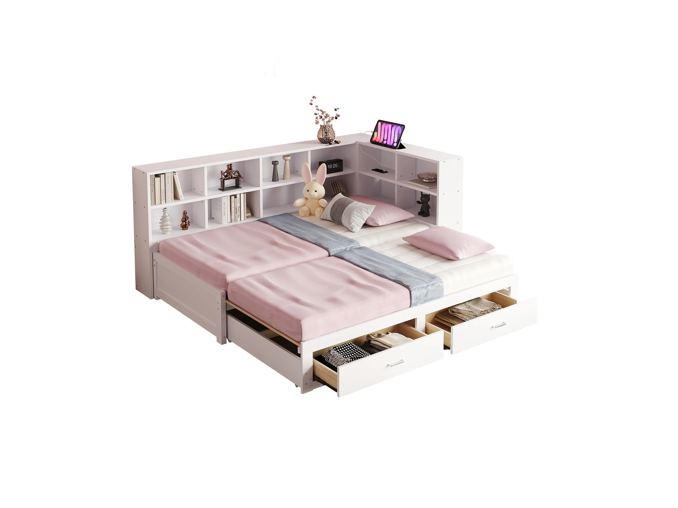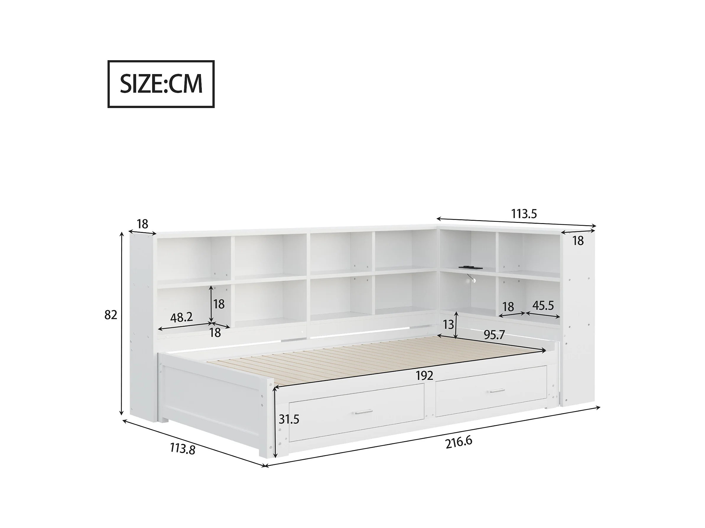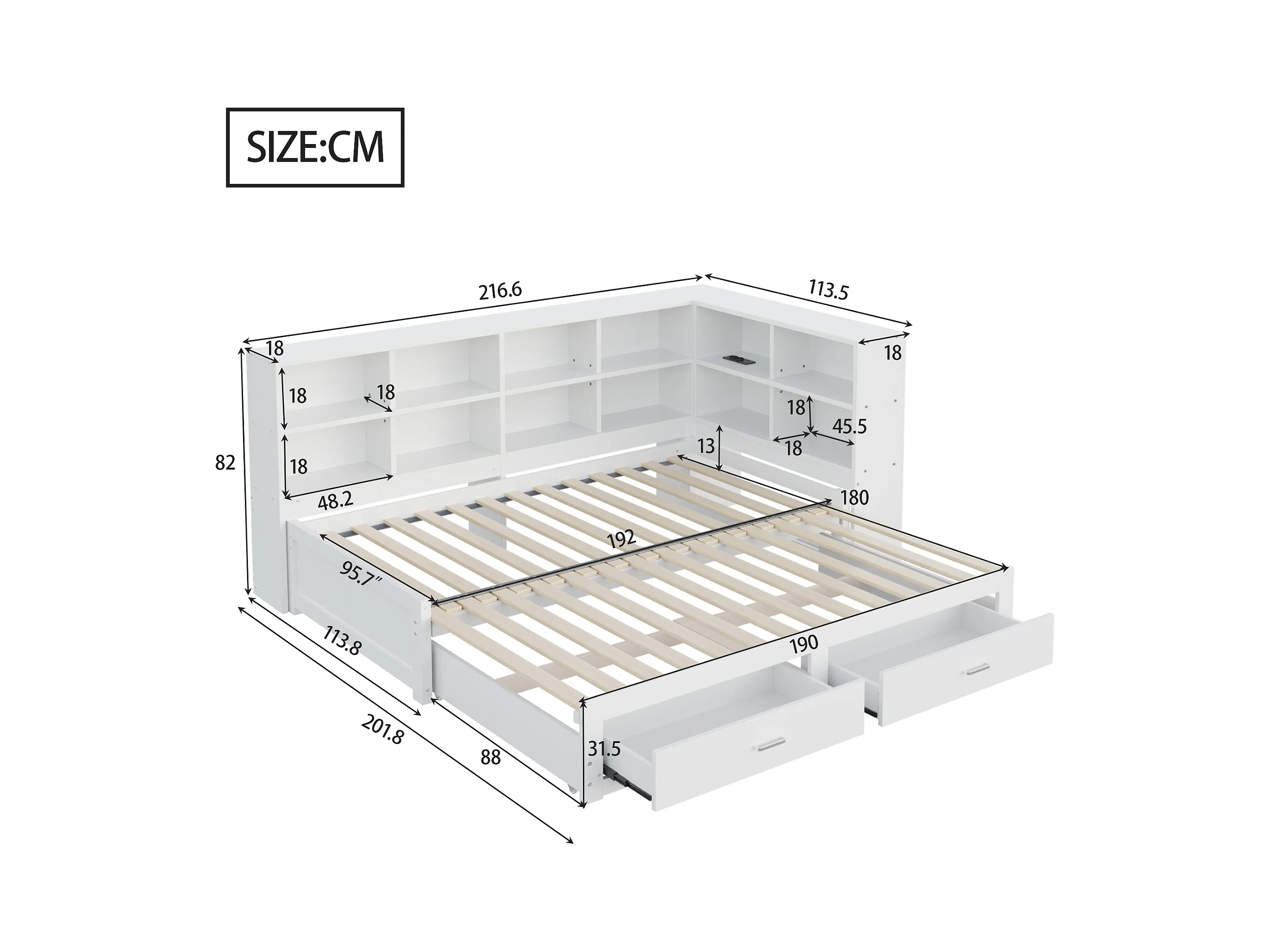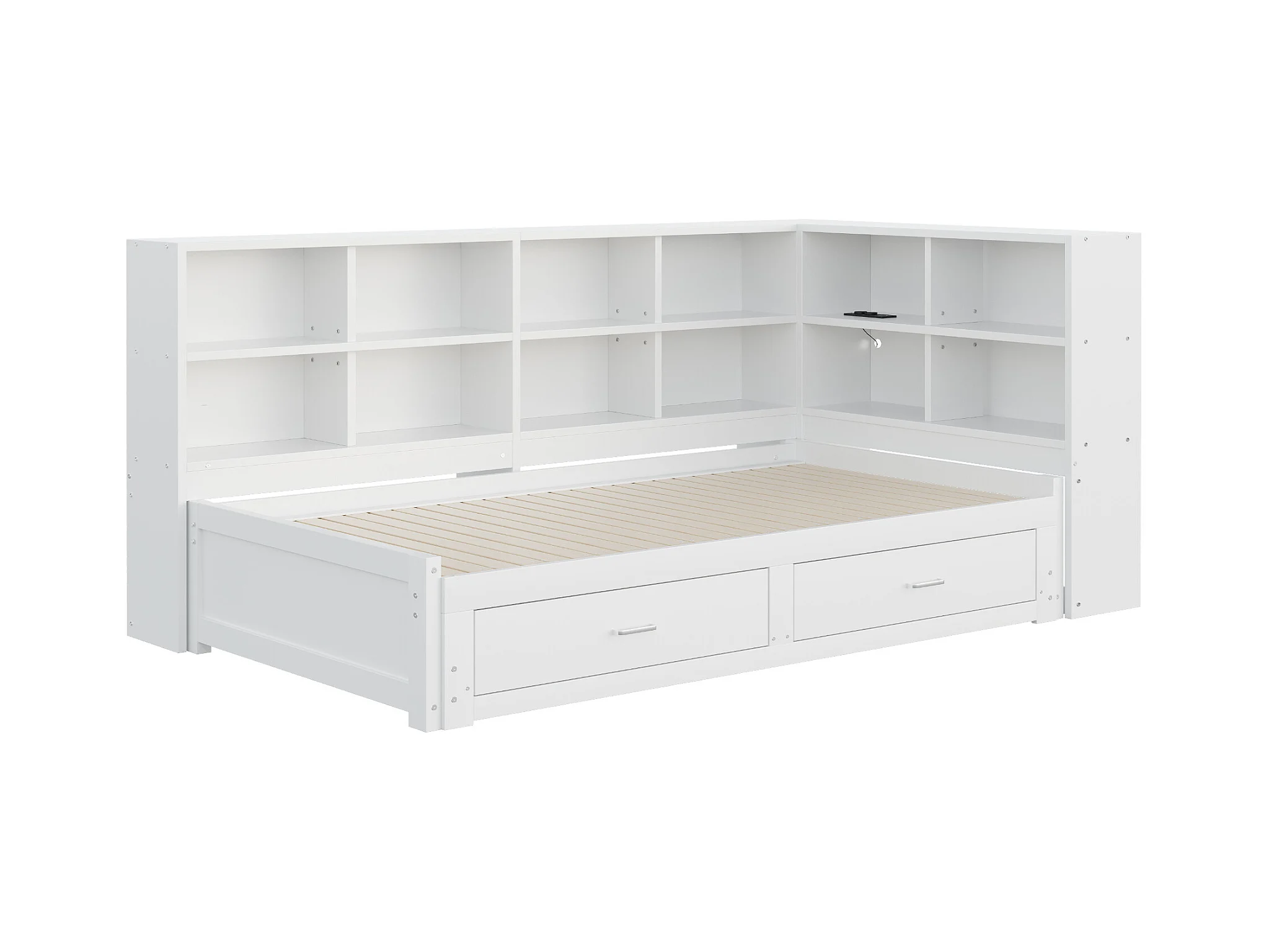 Canapé-lit gigogne - 90/180 x 190 cm - avec compartiment de rangement + 2 tiroirs + prise - Pin + contreplaqué + MDF - blanc