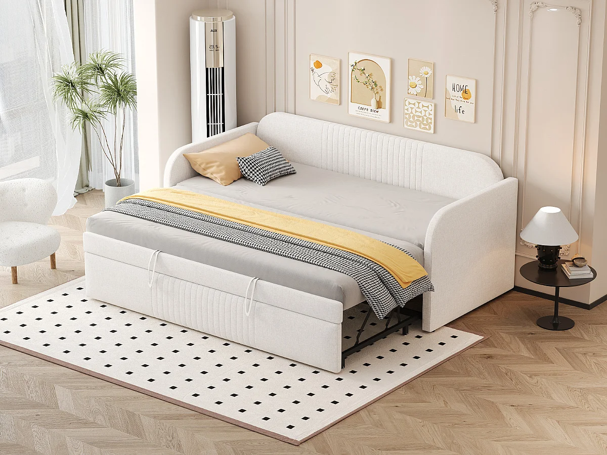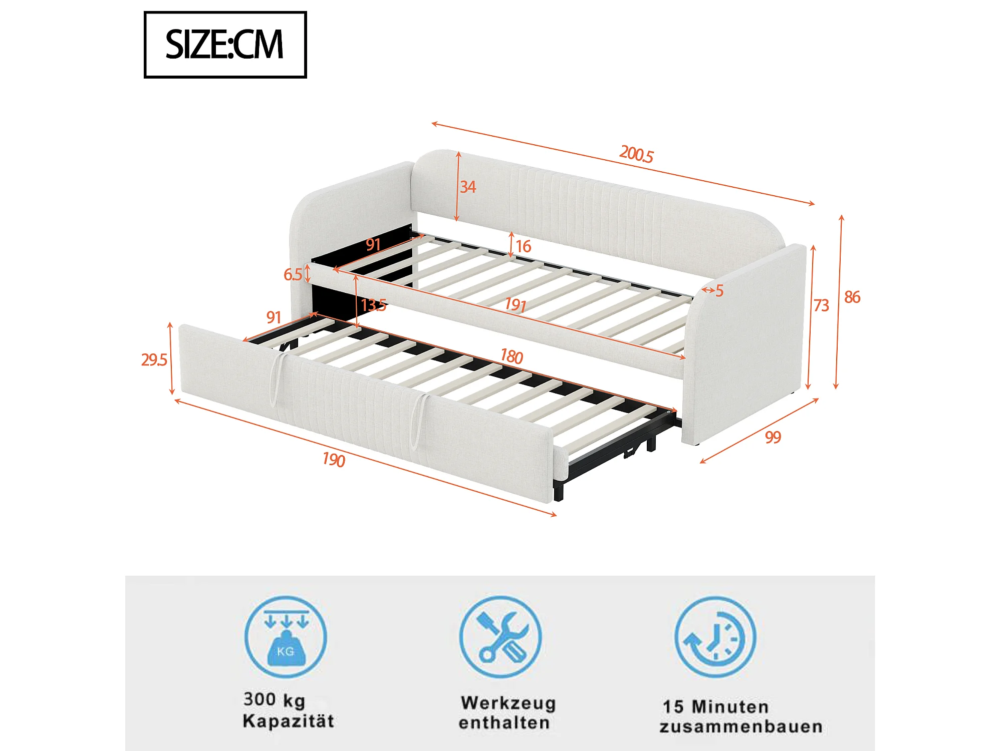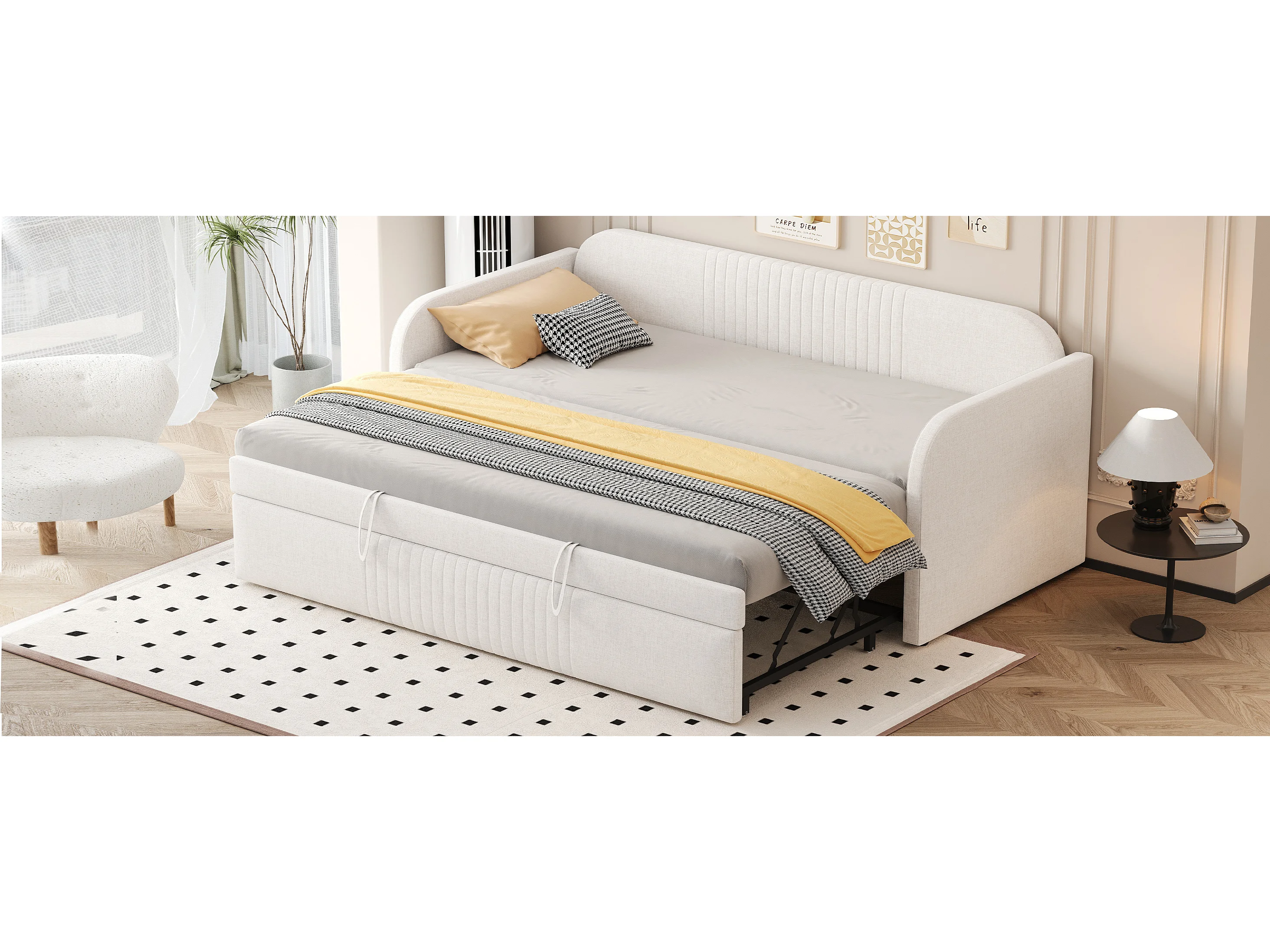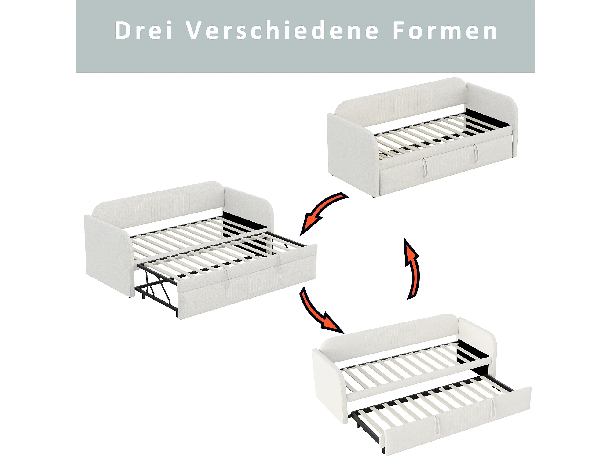 Canapé-lit gigogne à rayures verticales 90/180 x 190 cm - avec sommier à lattes - lin - beige