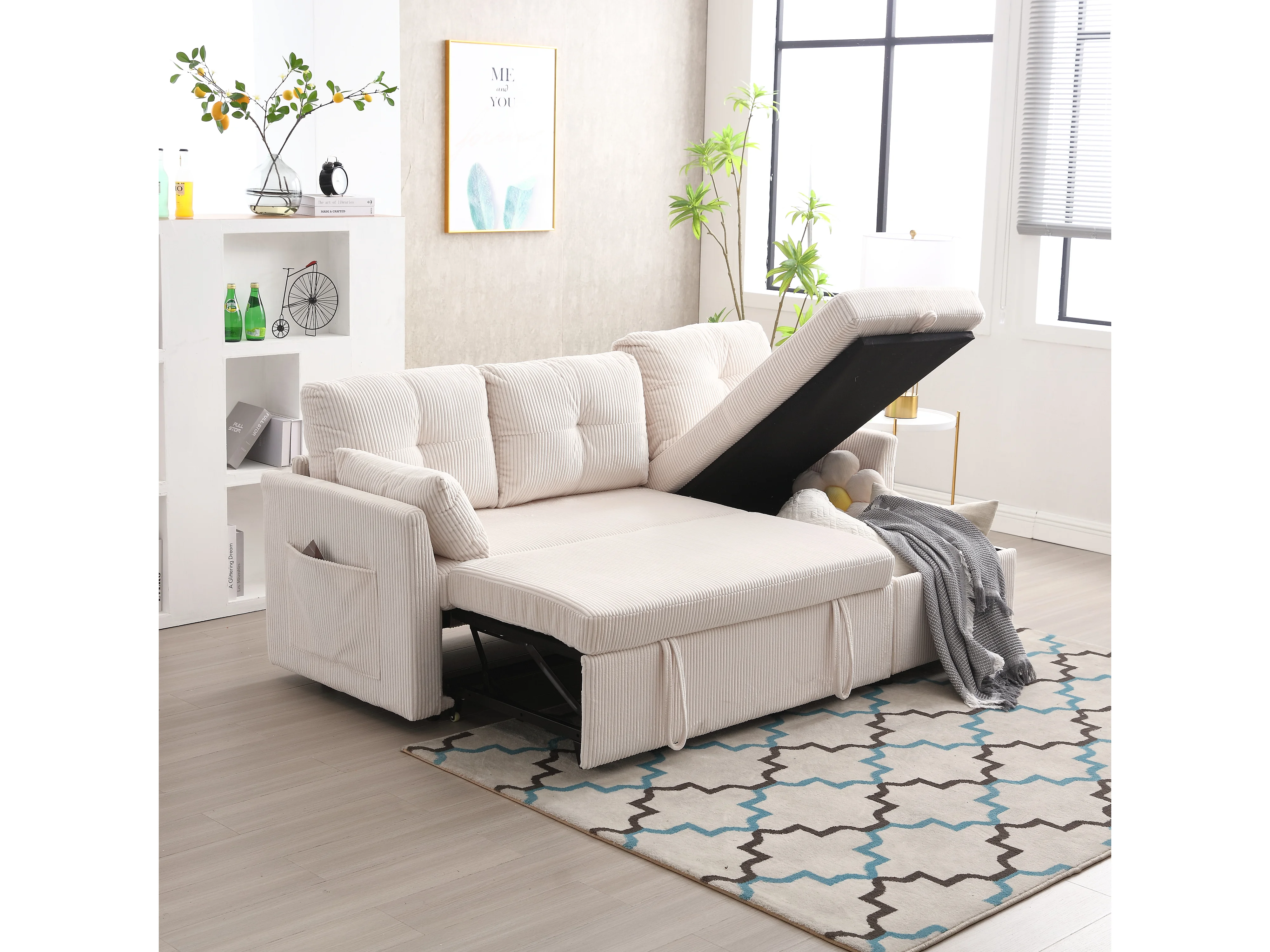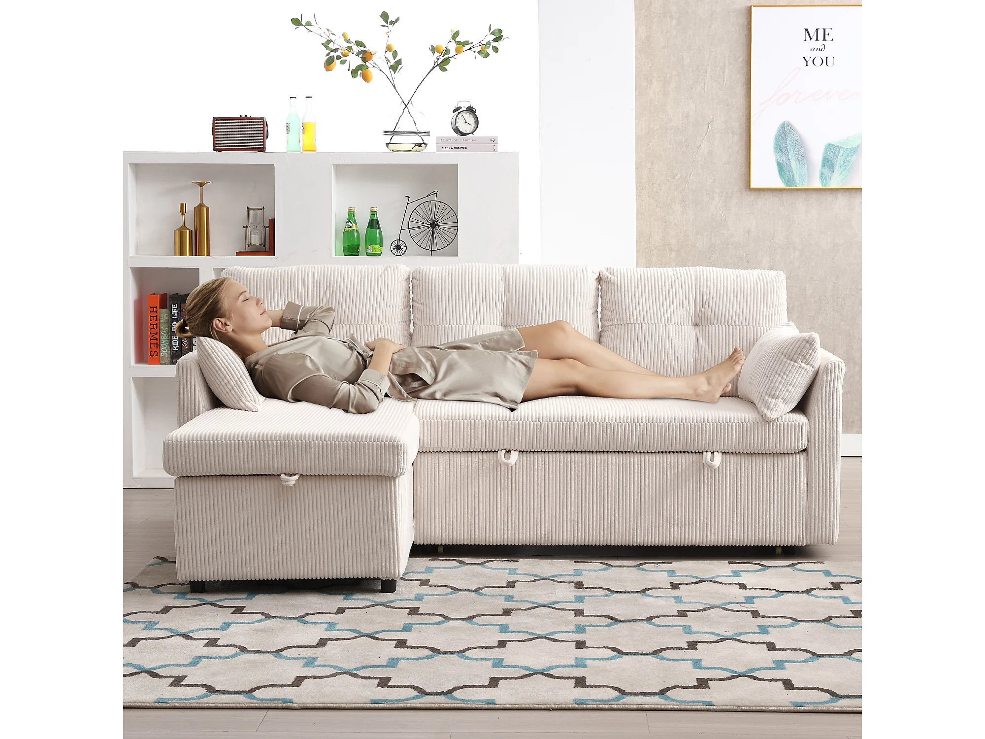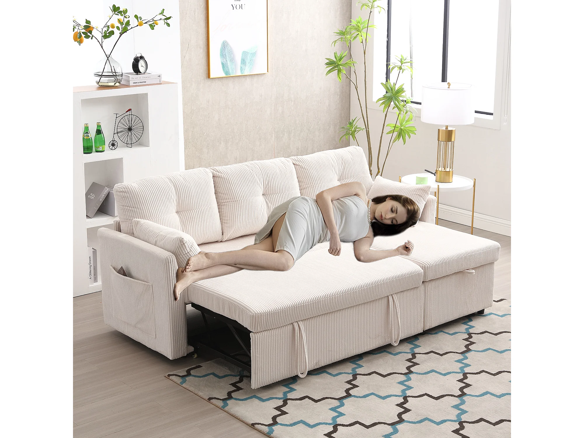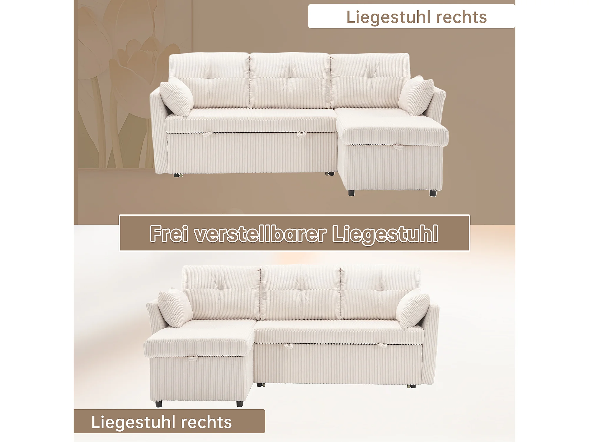 Canapé-lit multifonction avec rangement et lit escamotable, canapé d'angle modulaire, velours, beige (206x130x66-88 cm)