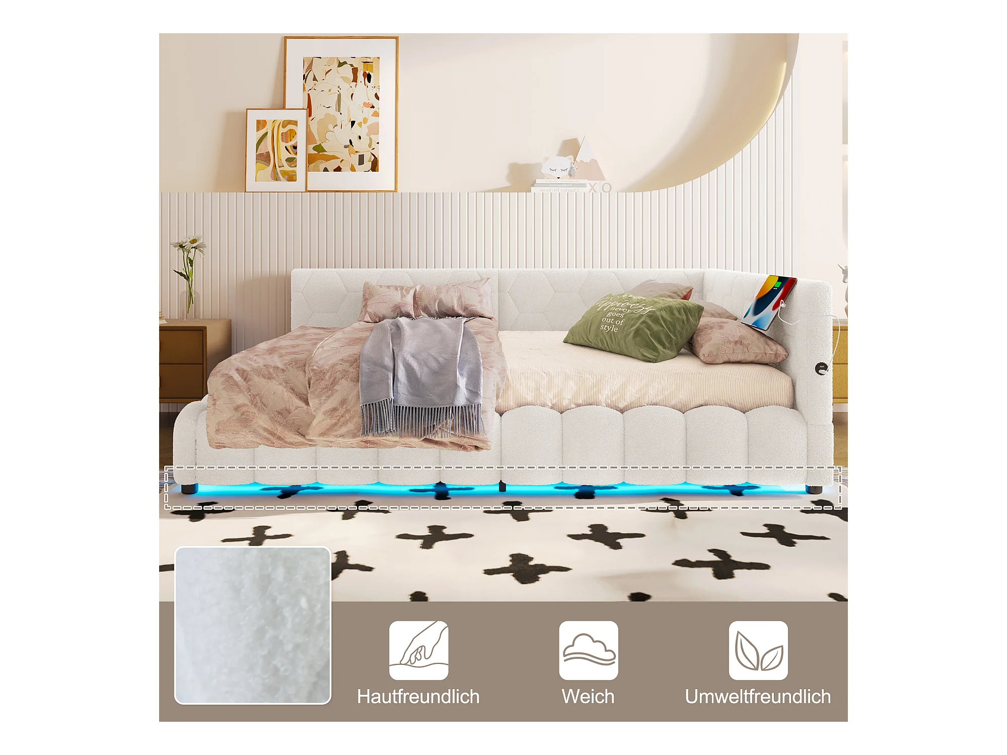 Canapé-lit pour enfant - 140 x 200 cm - avec Leds + rangement hydraulique + USB - velours - blanc