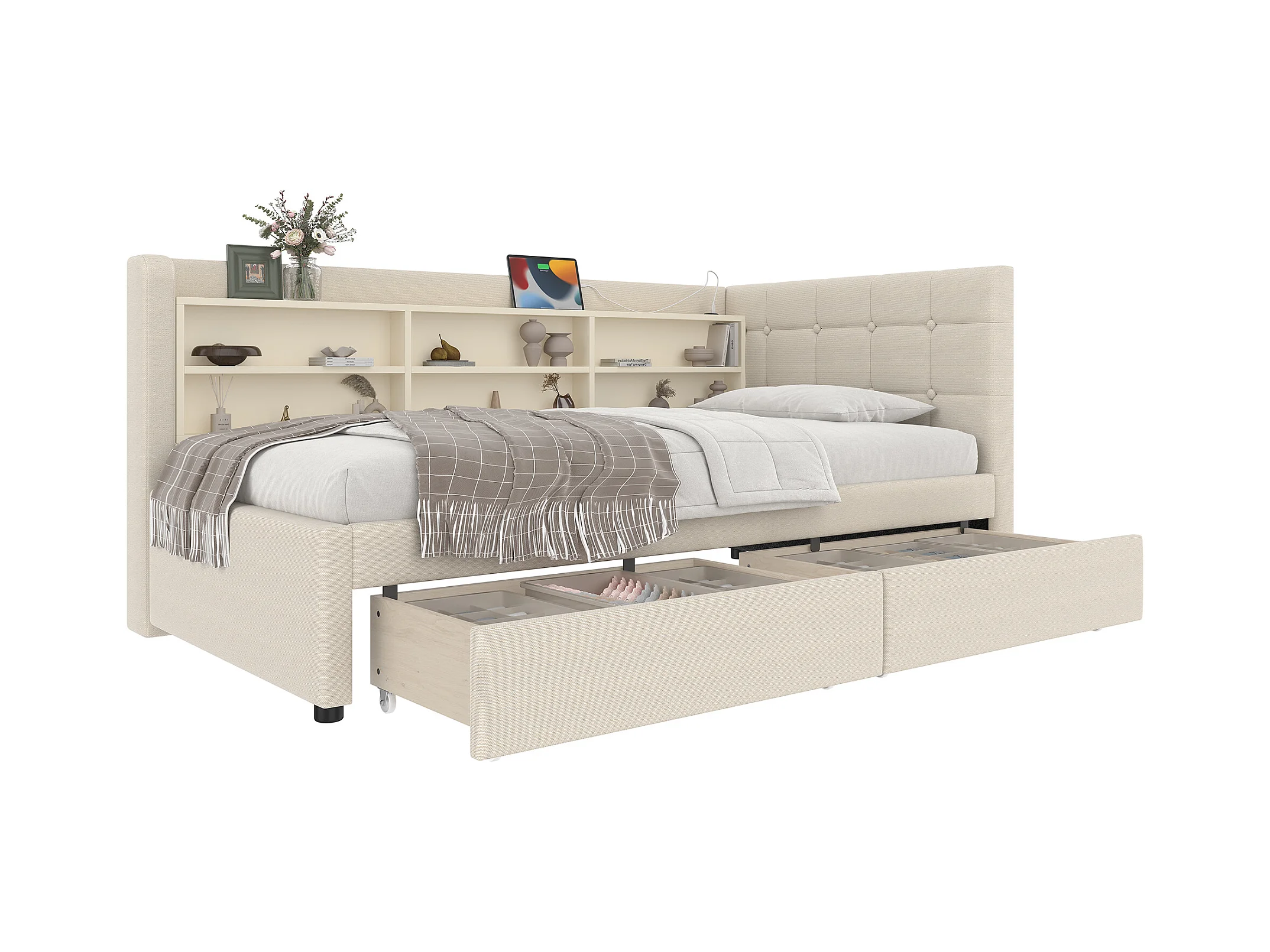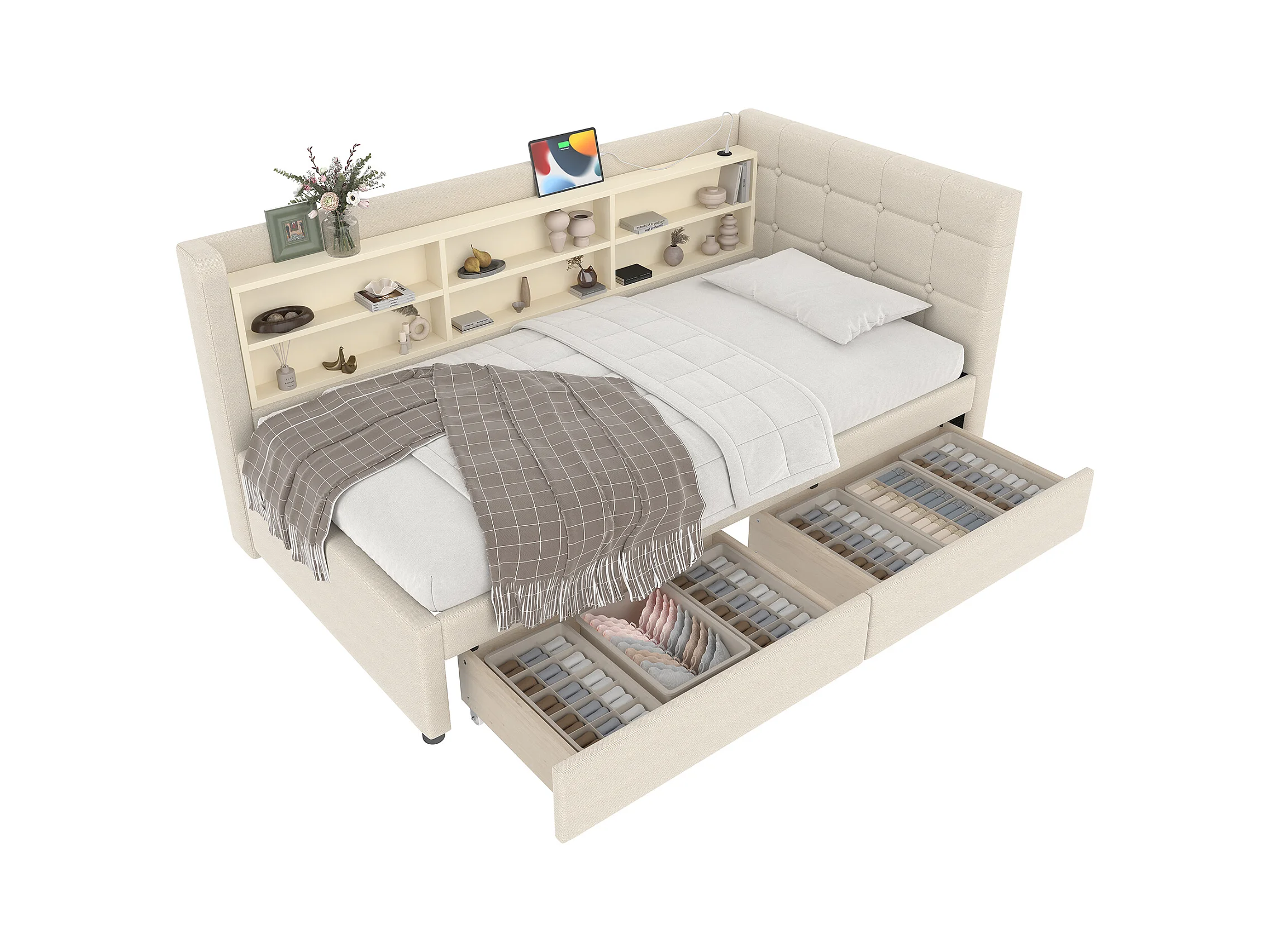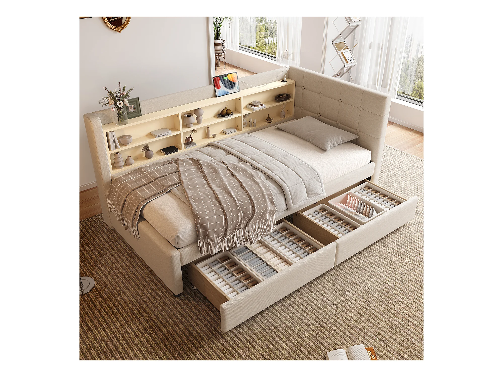 Canapé-lit pour enfant - 90 x 200 cm - avec 2 tiroirs + USB + rangement - lin - beige