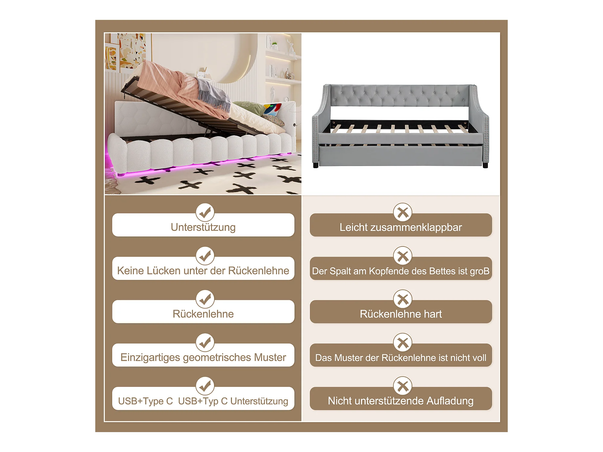 Canapé-lit pour enfant - 90 x 200 cm - avec Leds + rangement hydraulique + USB - velours - blanc