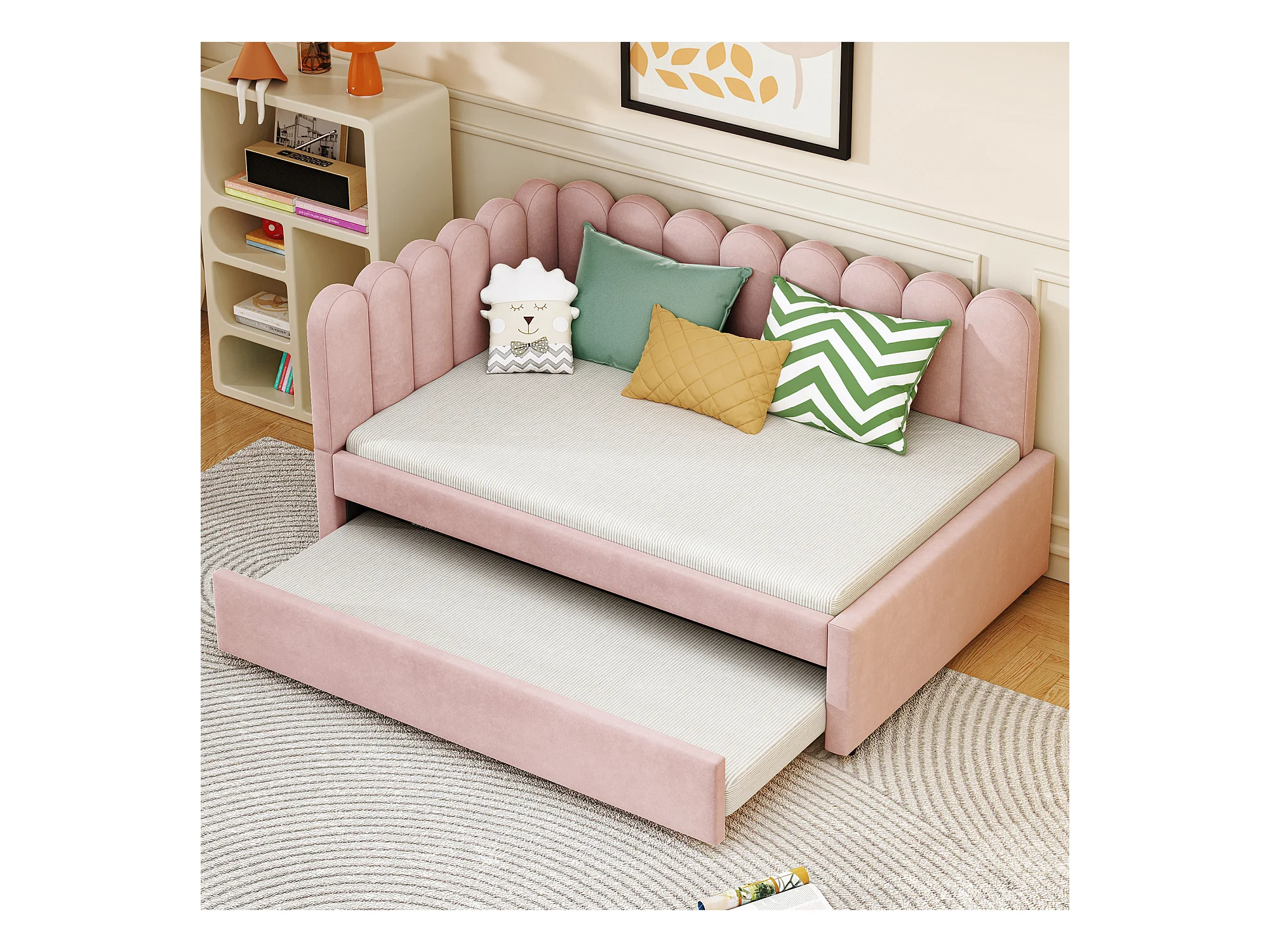 Canapé-lit rembourré 2 en 1 pour enfant - 140 x 200 cm + 90 x 190 cm - en forme de L - Velours + contreplaqué + MDF - rose