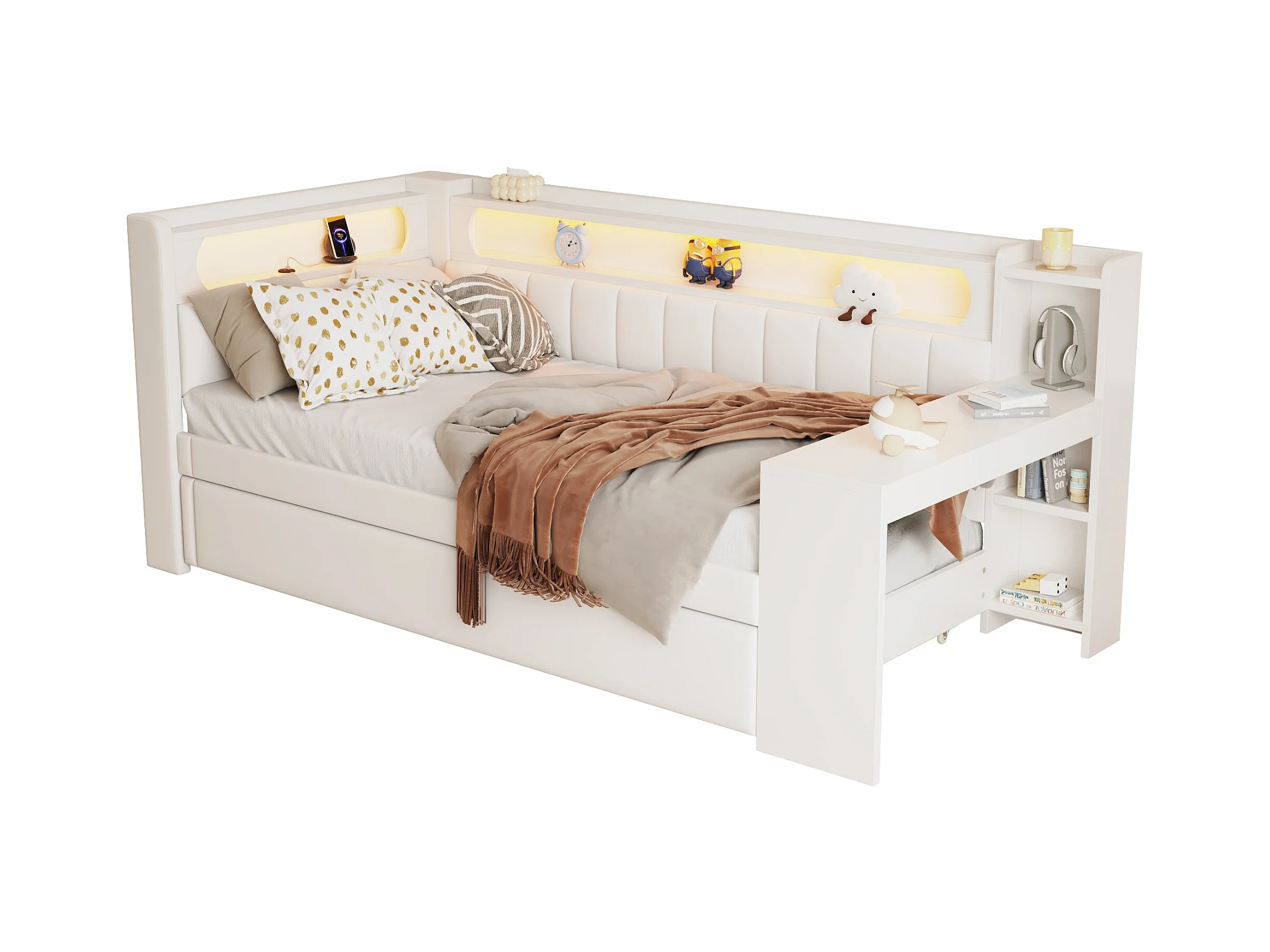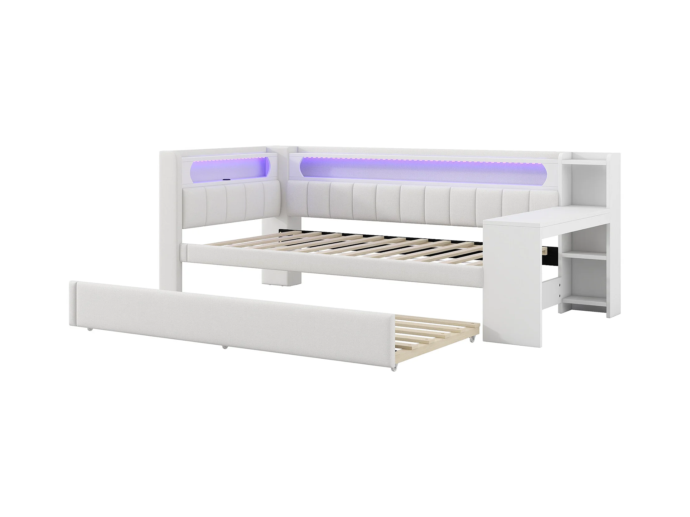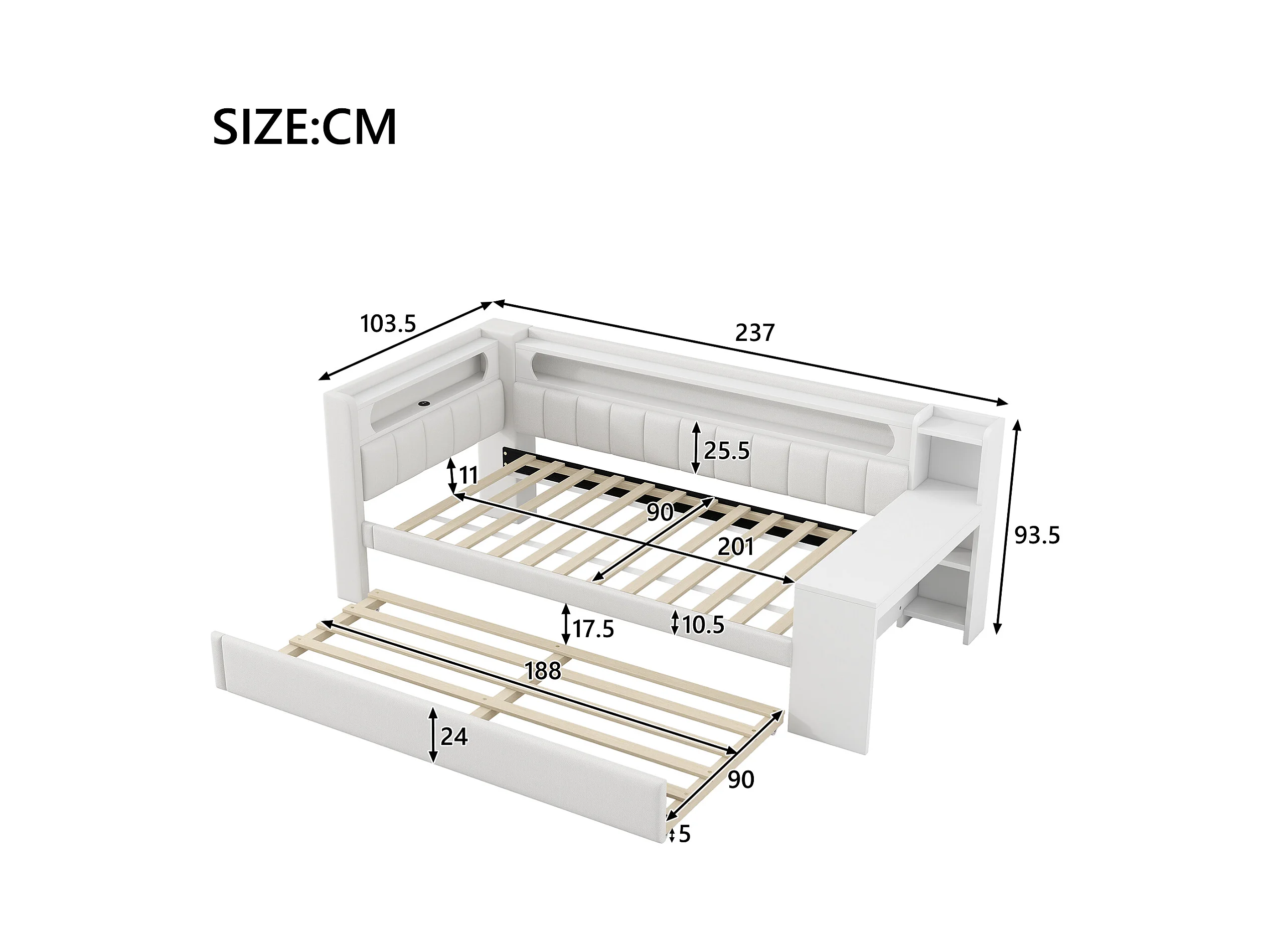 Canapé-lit rembourré 90x200 cm - avec ports USB et LED - avec lit gigogne et bureau - blanc(sans matelas)