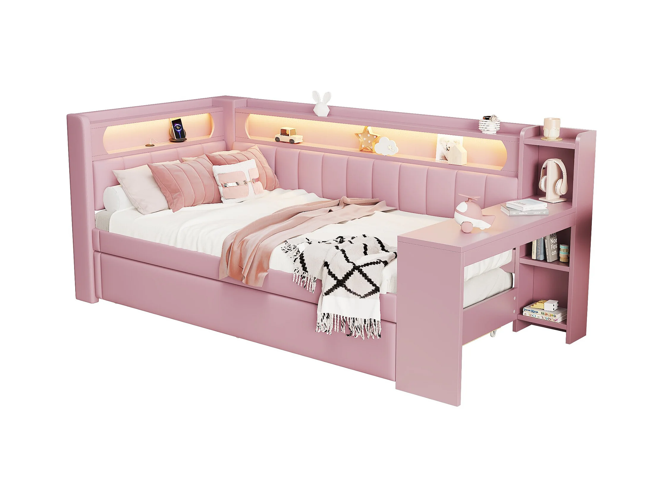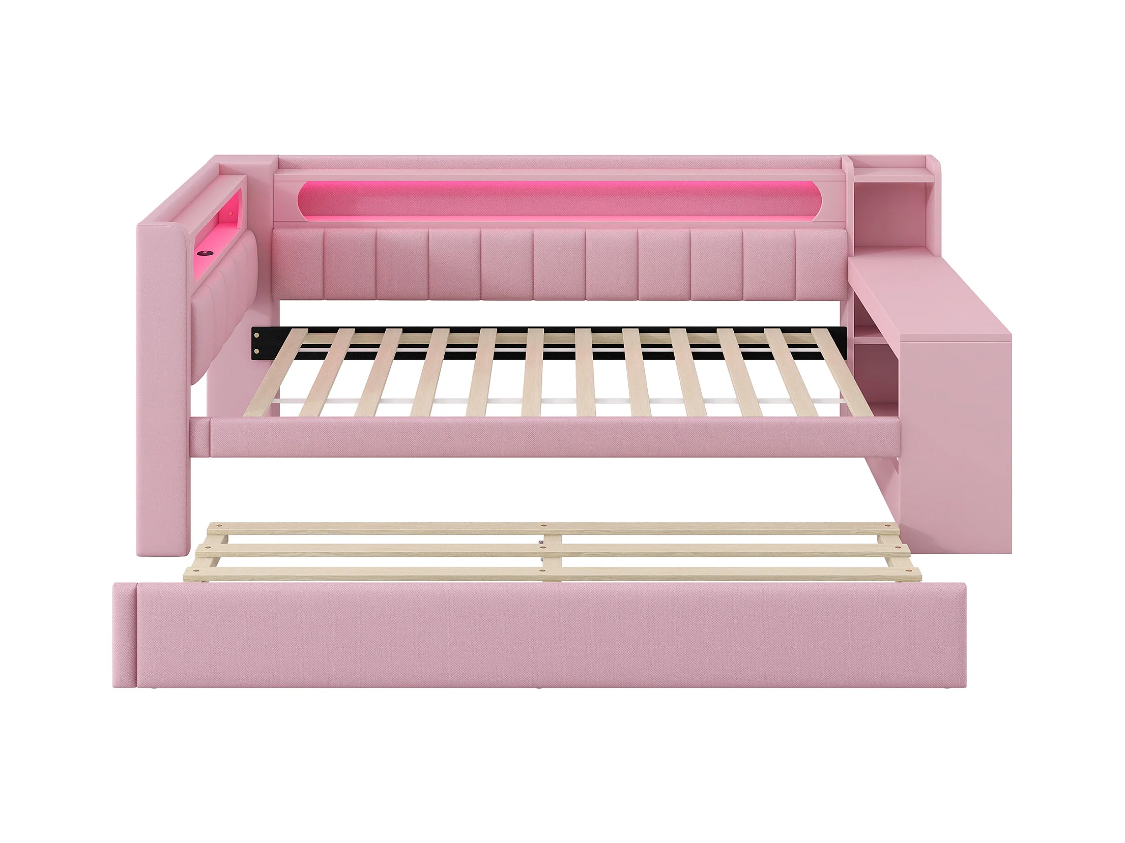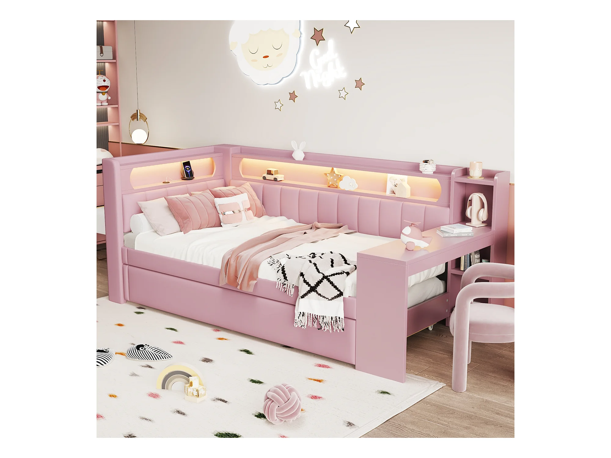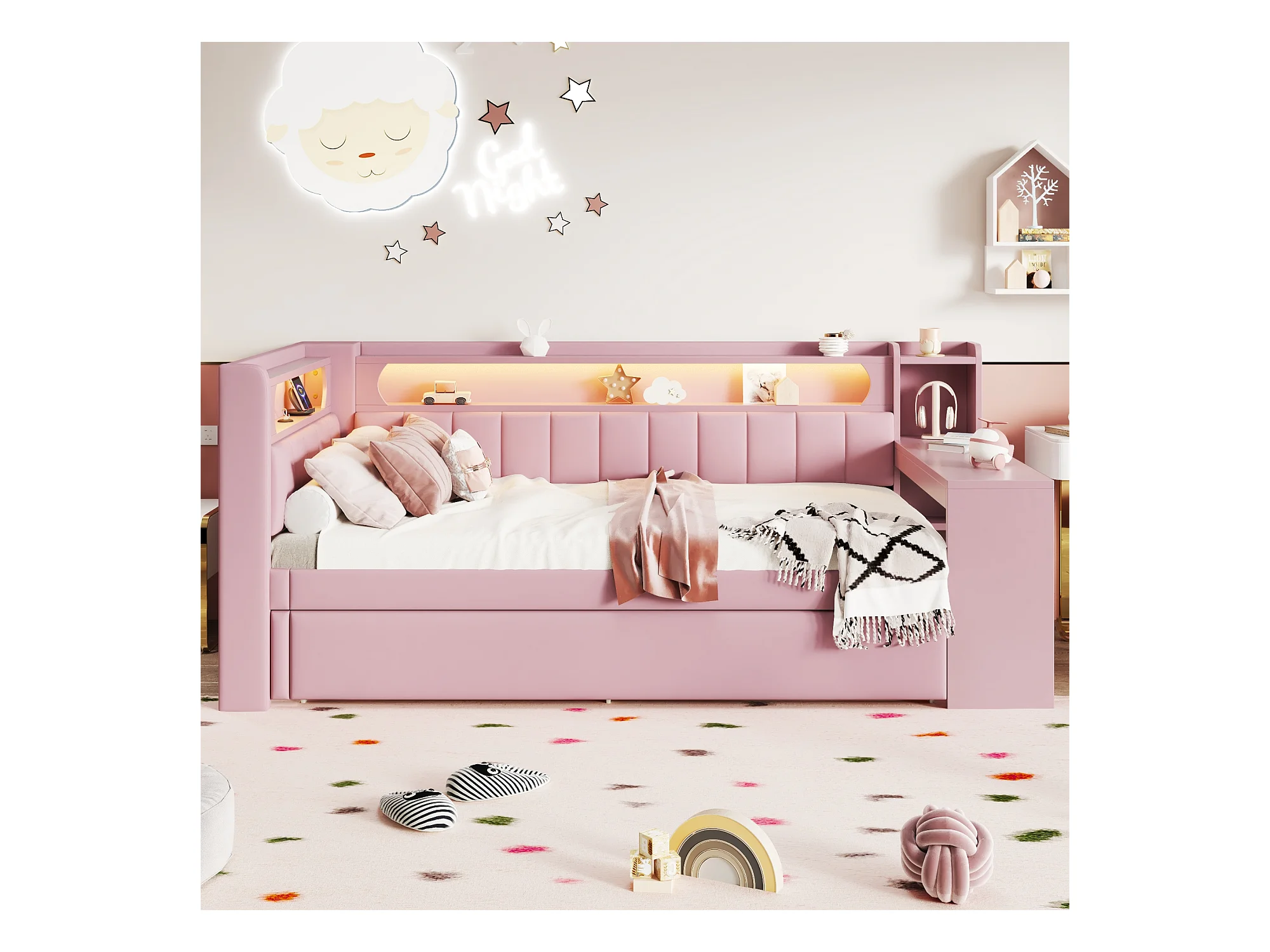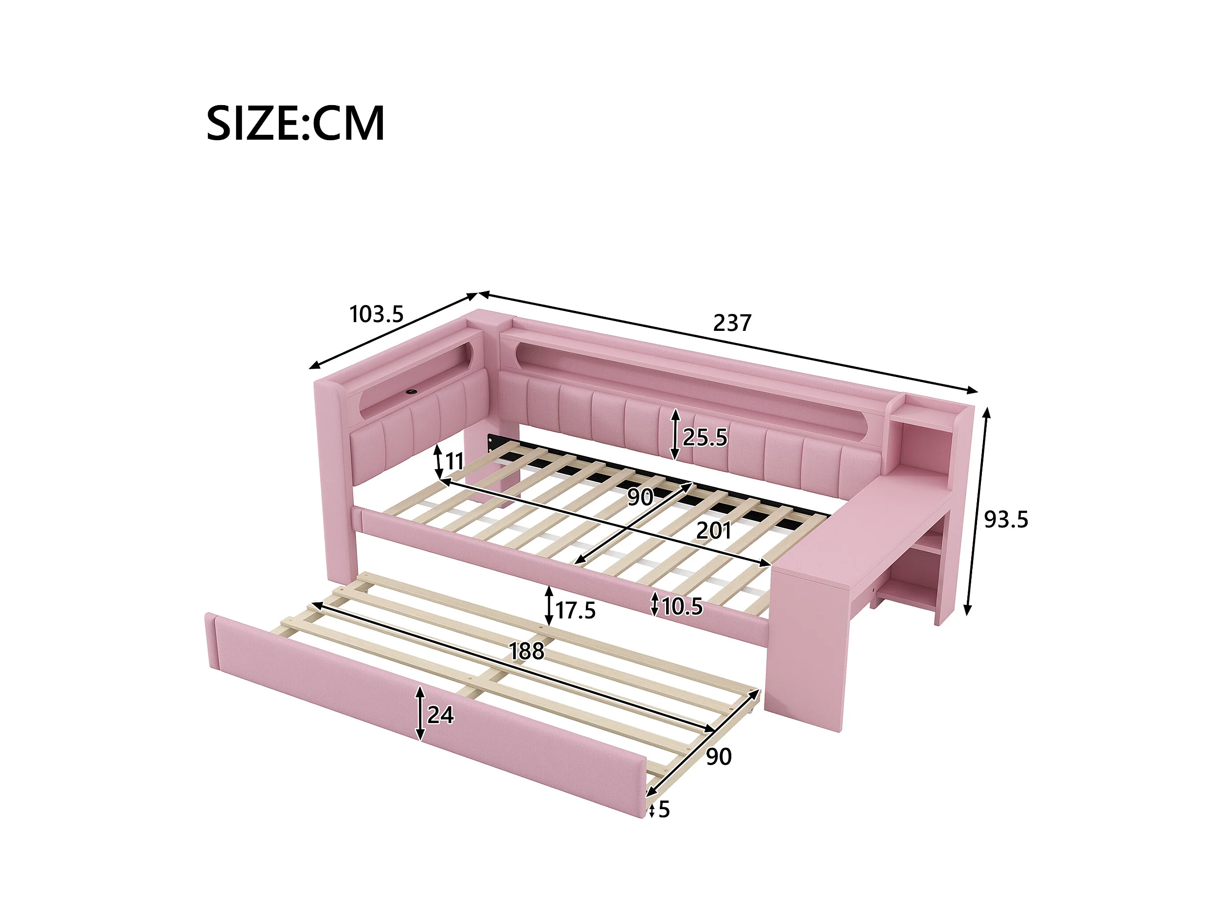 Canapé-lit rembourré 90x200 cm - avec ports USB et LED - avec lit gigogne et bureau - rose(sans matelas)