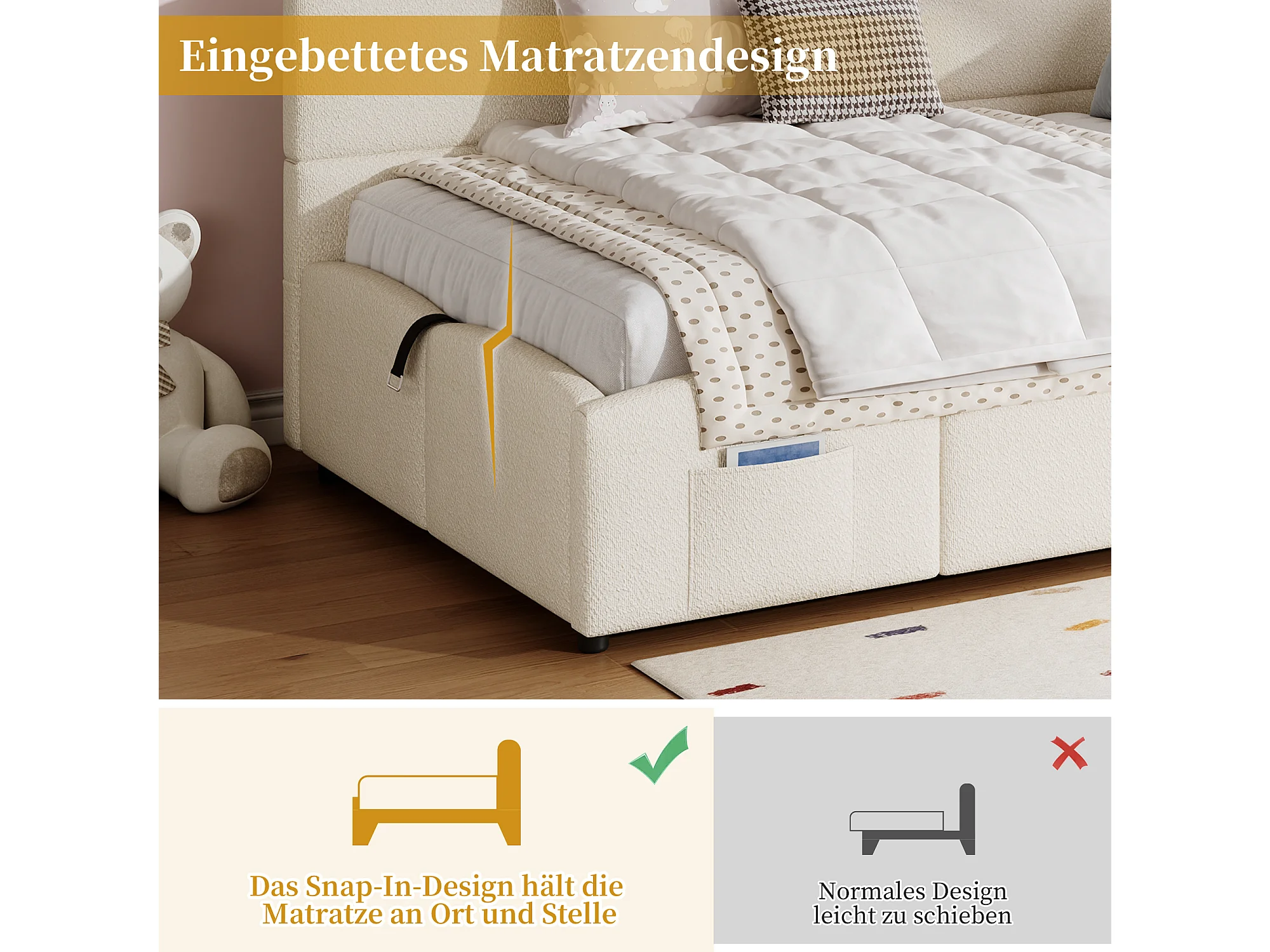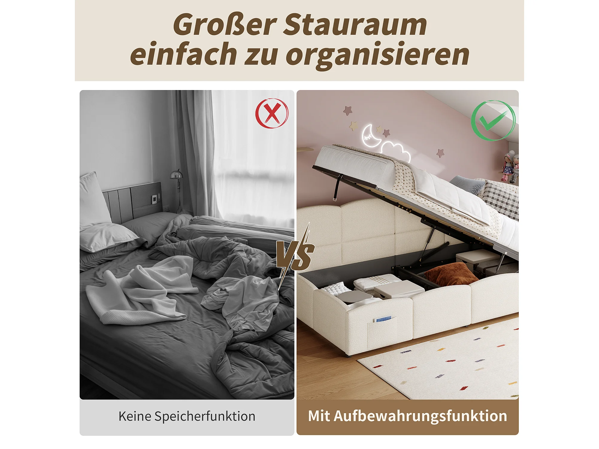 Canapé-lit rembourré enfant - 90 x 200 cm - avec rangement hydraulique + sommier à lattes - boucle - beige