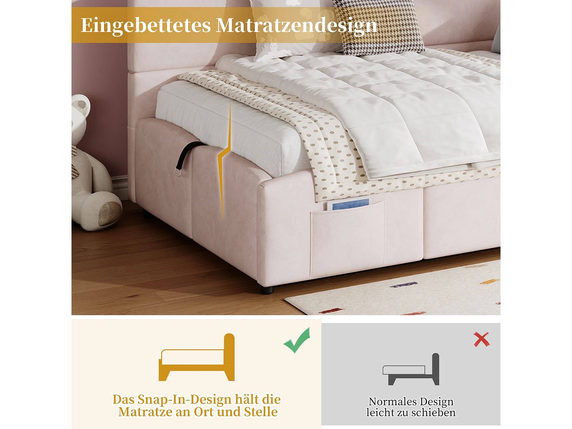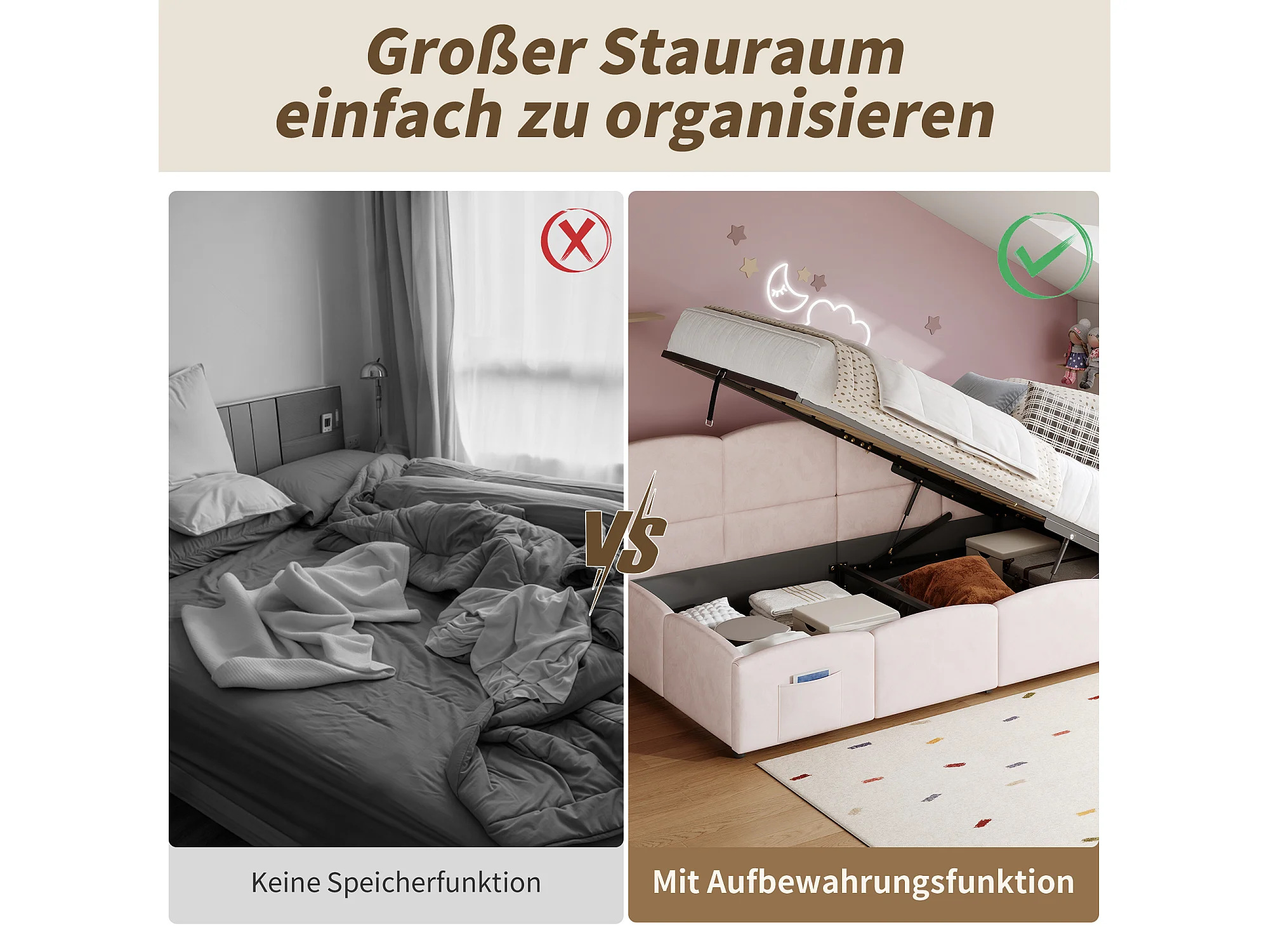 Canapé-lit rembourré enfant - 90 x 200 cm - avec rangement hydraulique + sommier à lattes - velours - rose