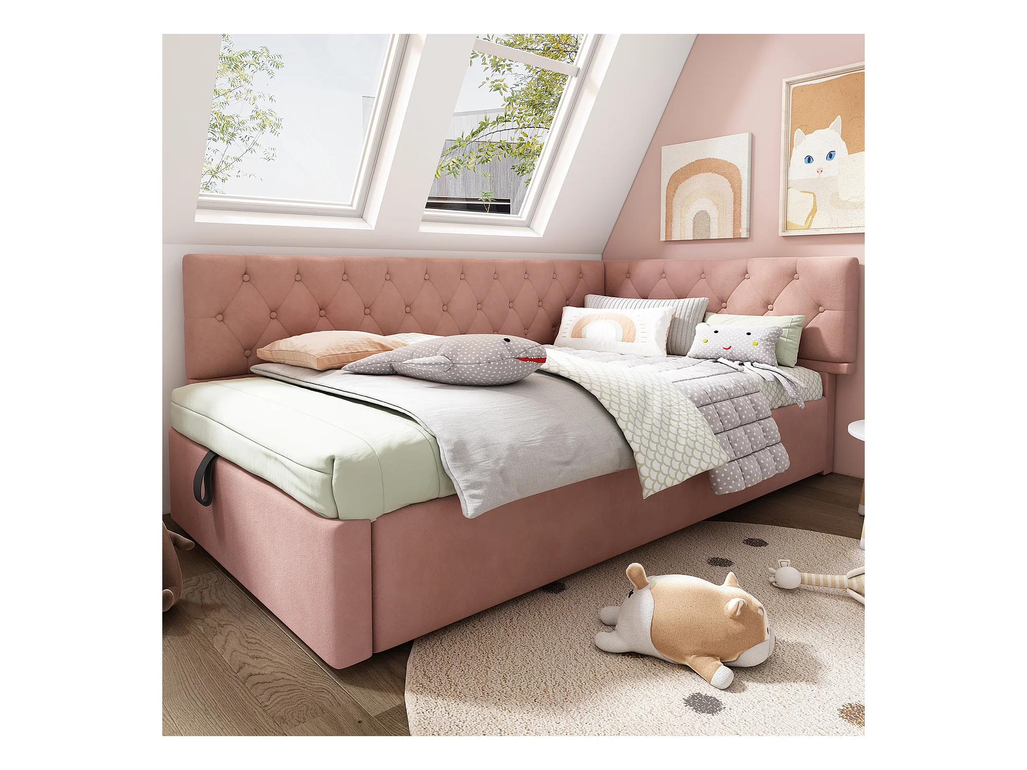 Canapé-lit rembourré pour enfant - 90 x 200 cm - avec rangement hydraulique - velours - rose