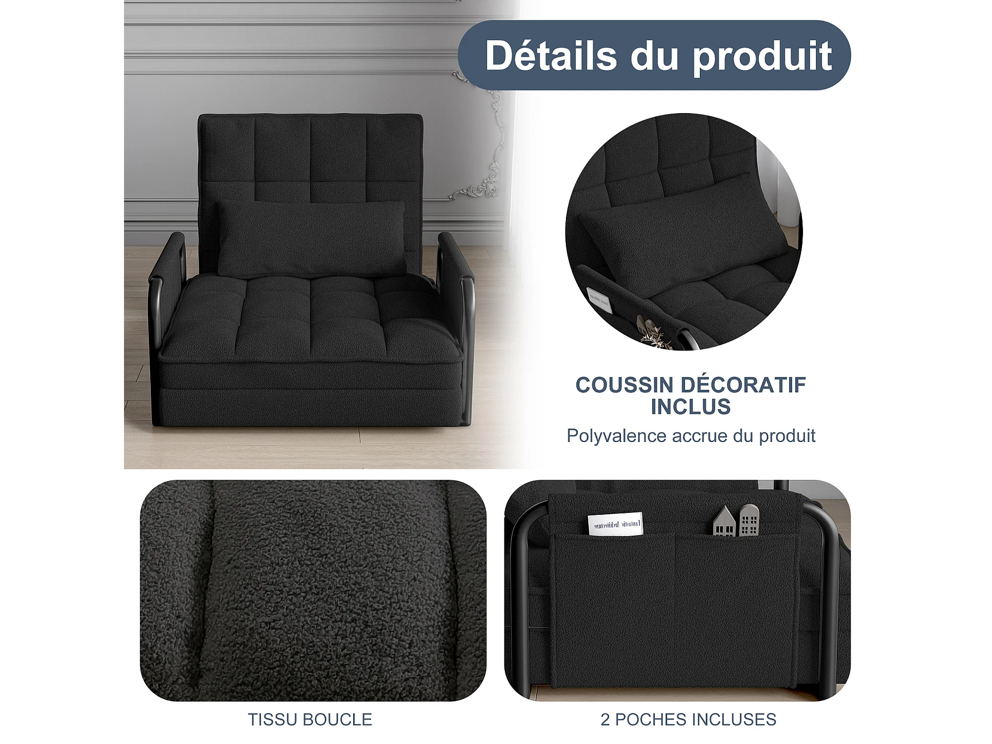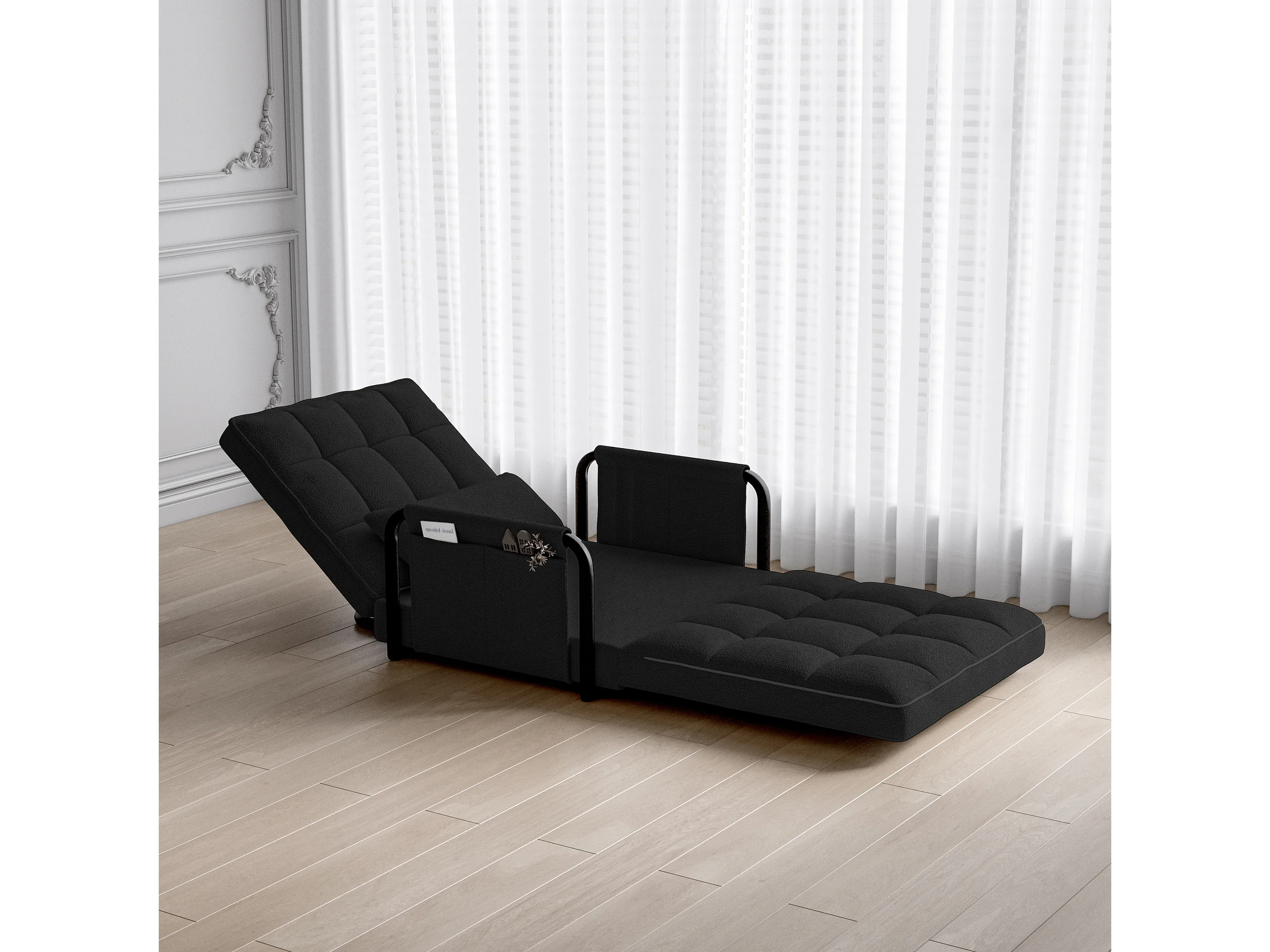 Canapé Lit Simple Convertible, 4 en 1 Canapé-lit Fauteuil, 5 Positions réglables, Coussin et Accoudoirs Métal, Laine d’agneau, Noir