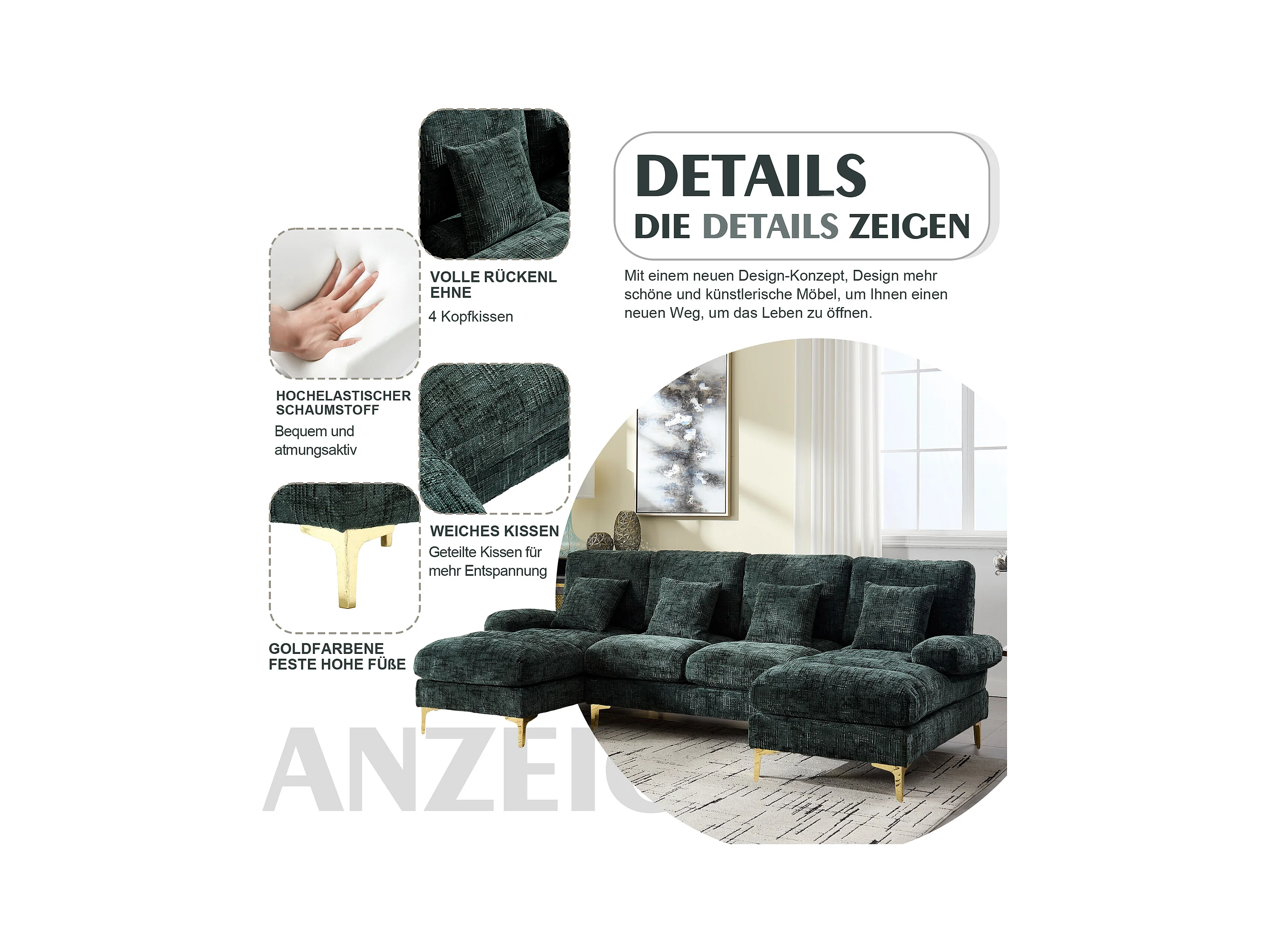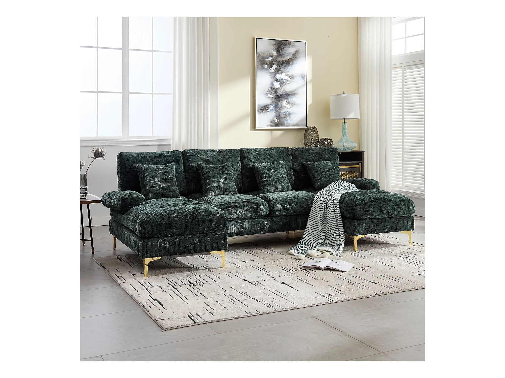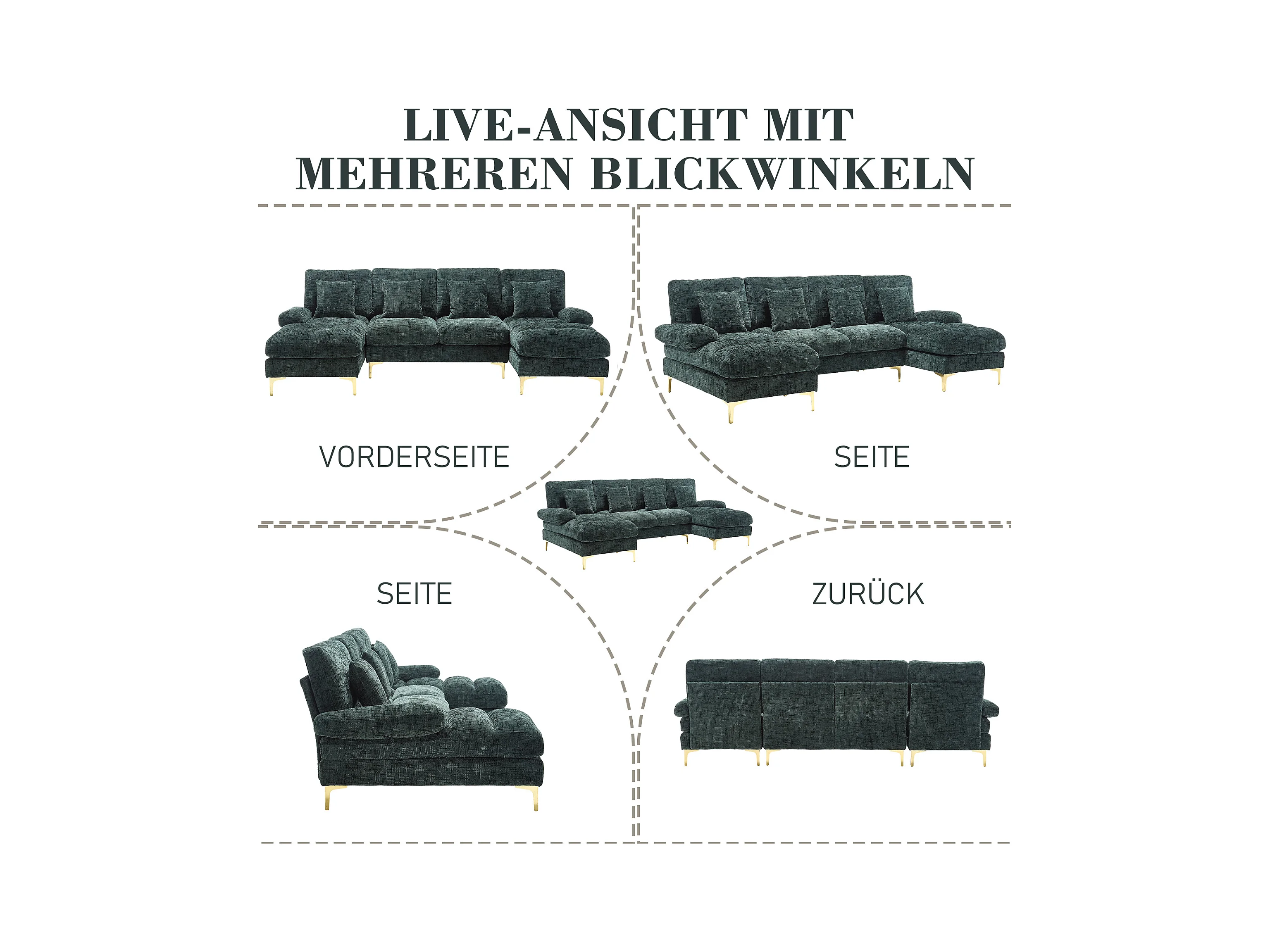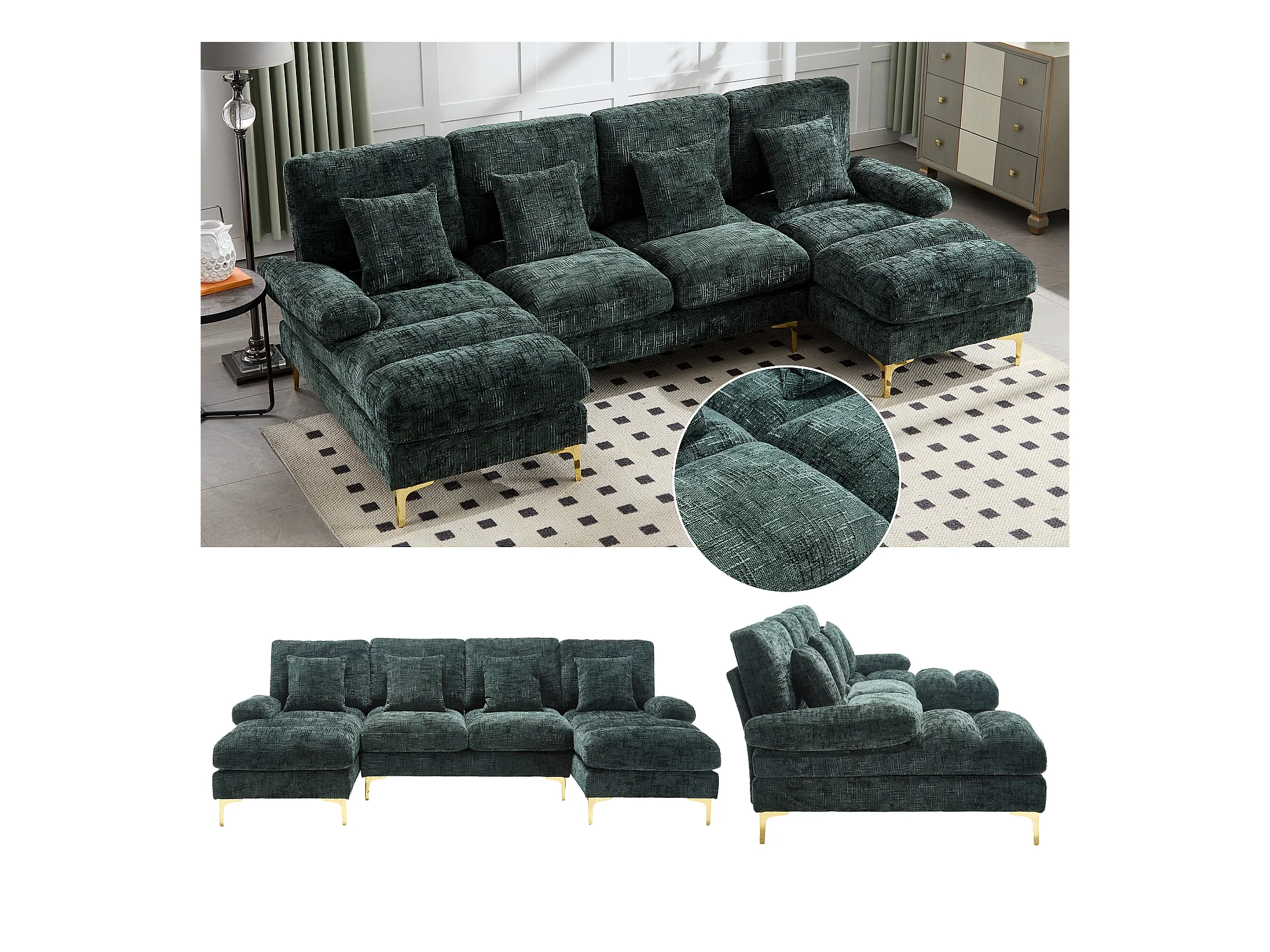 Canapé moderne en U - 272 x 136 x 88 cm - avec 2 places inclinables pour salon - velours - vert