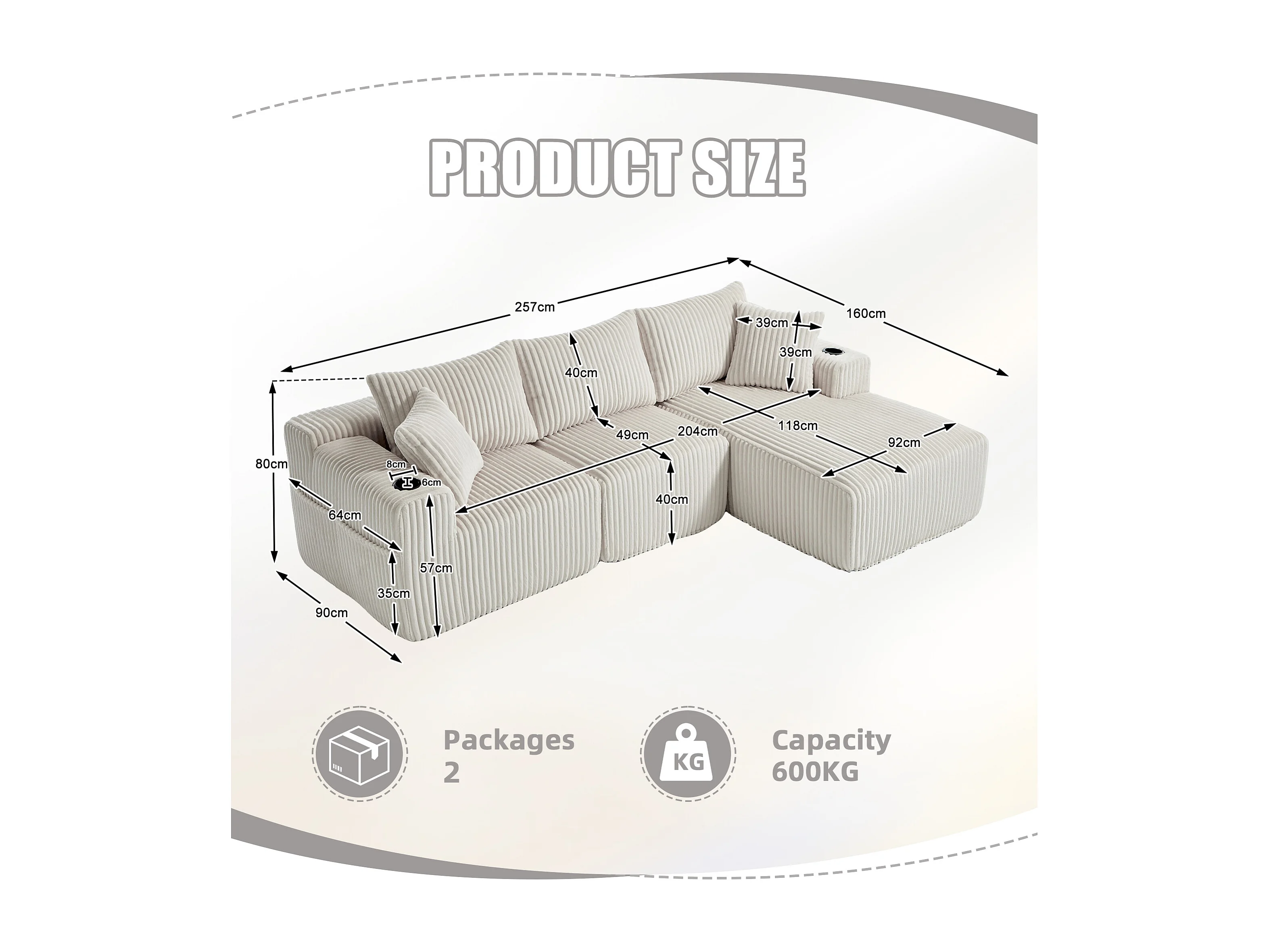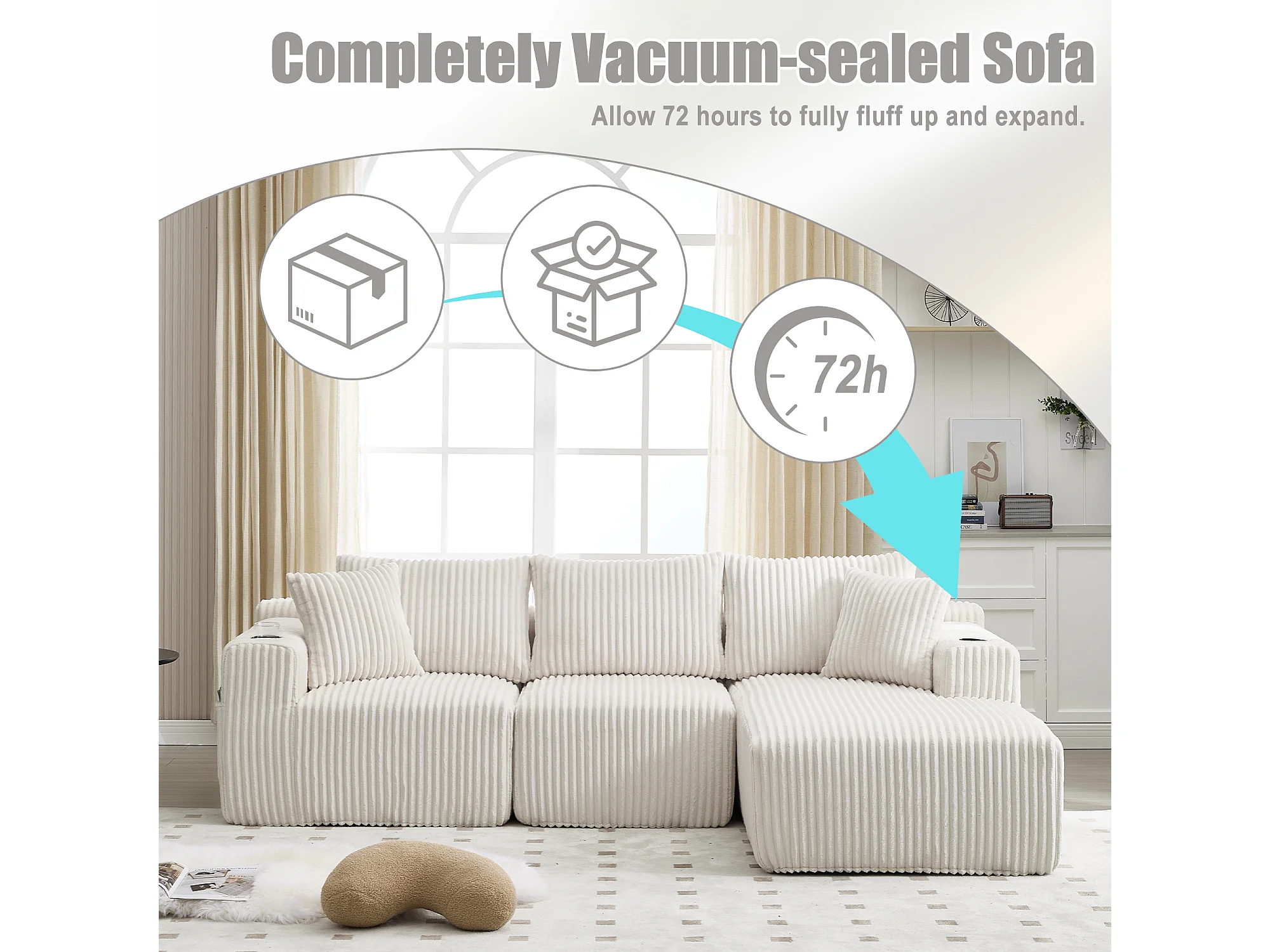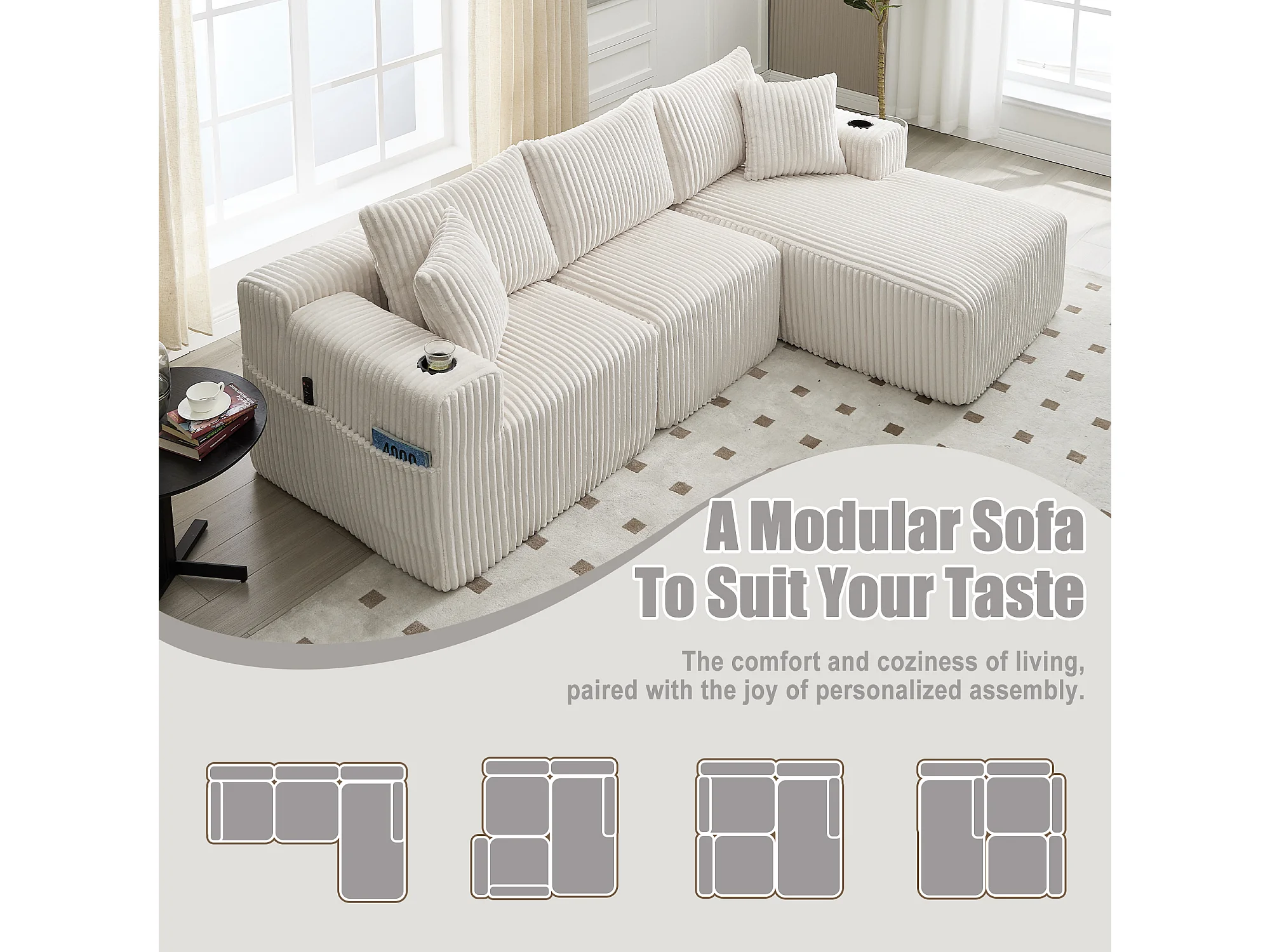 Canapé modulable 3 places - 5 coussins inclus - Porte-gobelets et poches latérales - Convertible en canapé d'angle - Beige - Idéal salon et studio