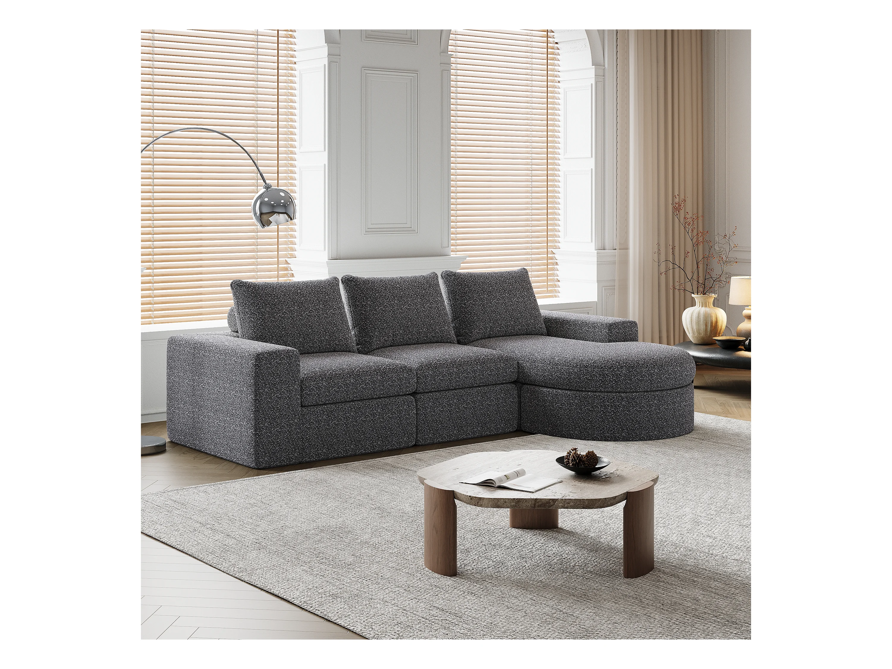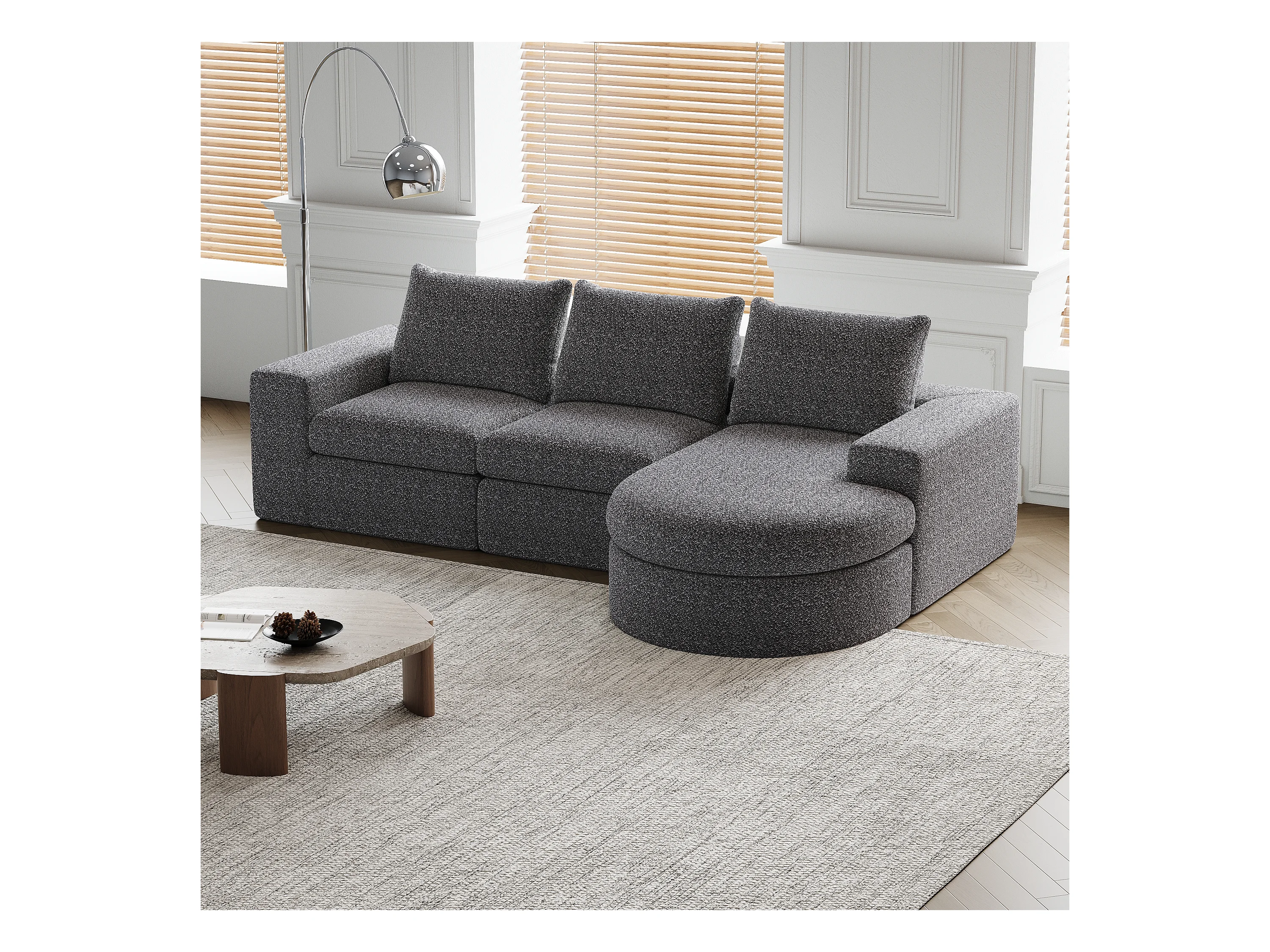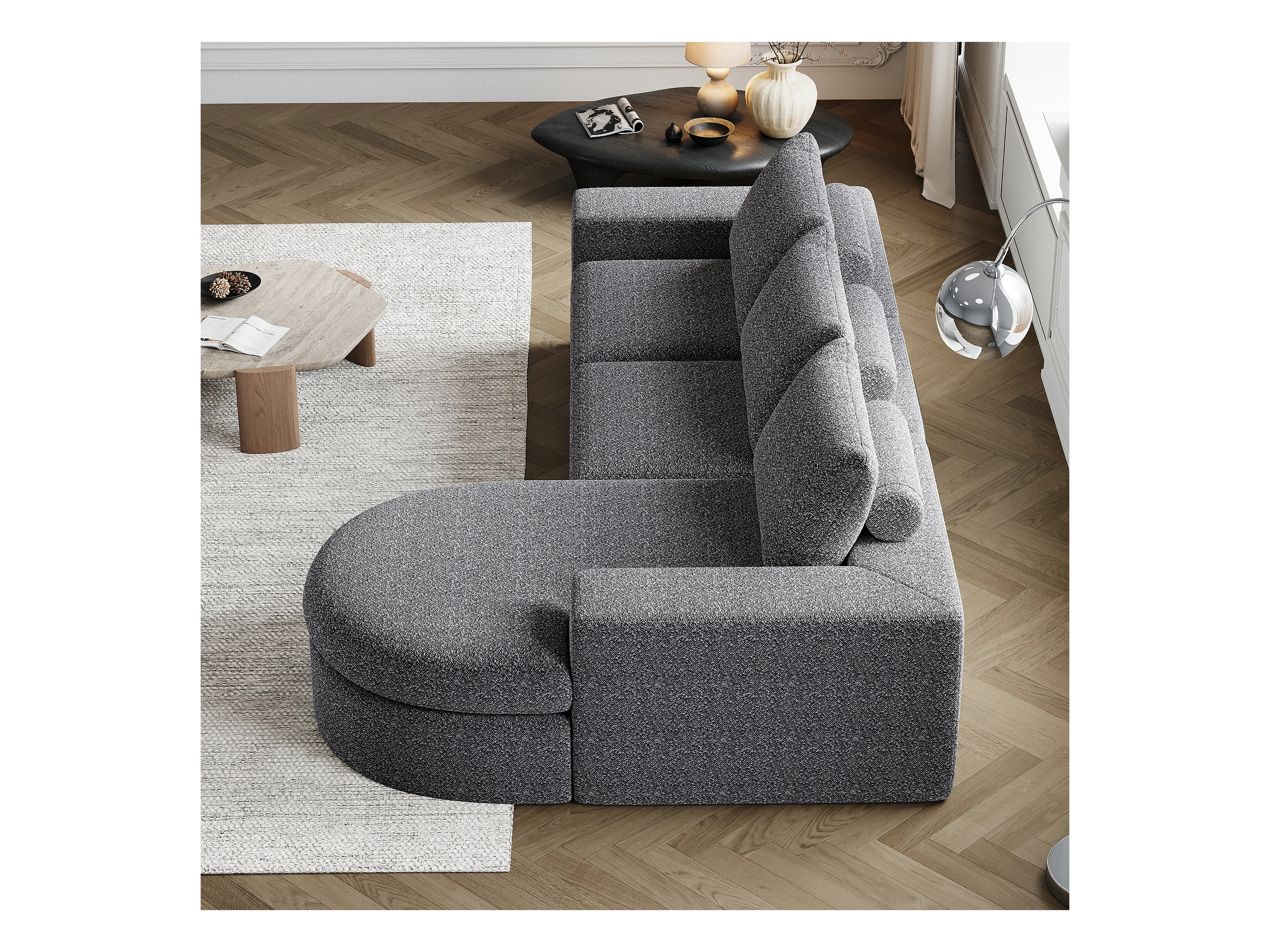Canapé modulaire en chenille avec éléments incurvés et repose-pied, design compressé, sans structure, canapé L, mousse haute densité, gris (114x43x43 cm)