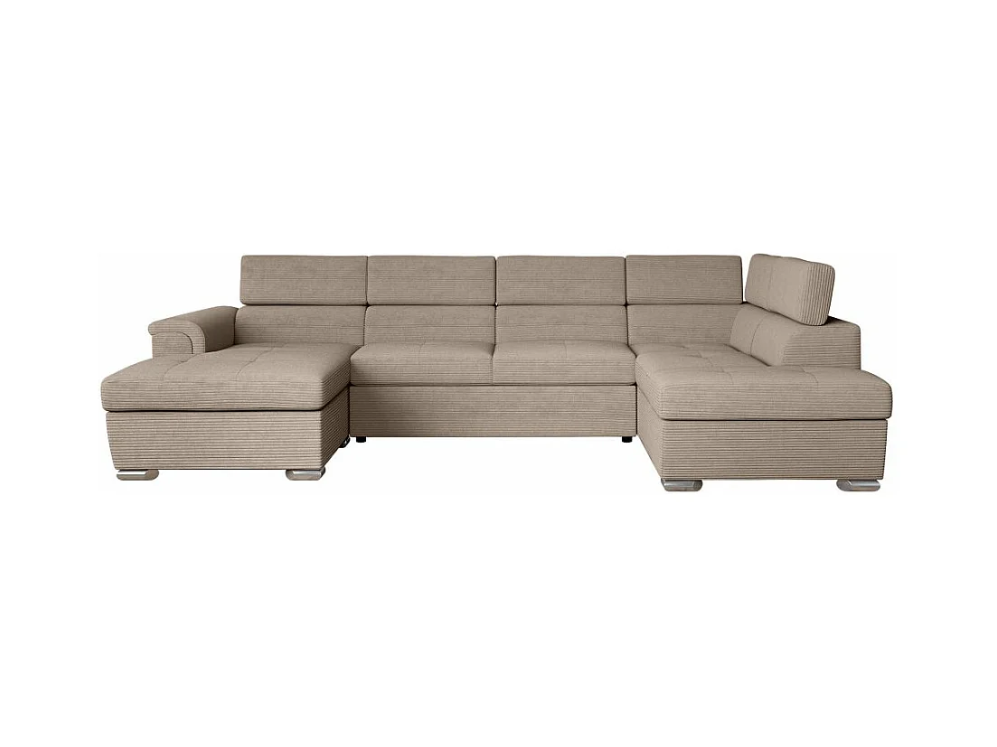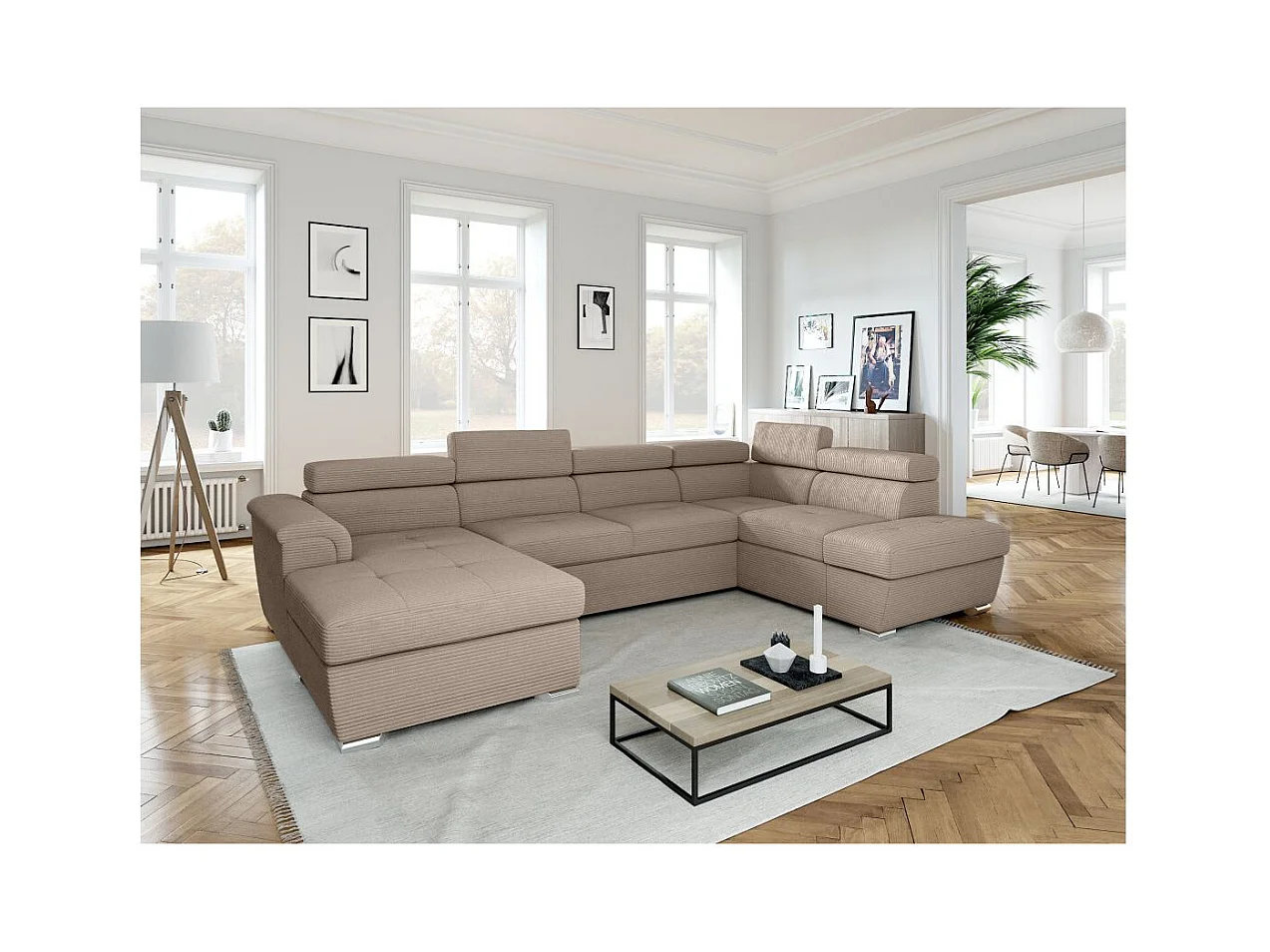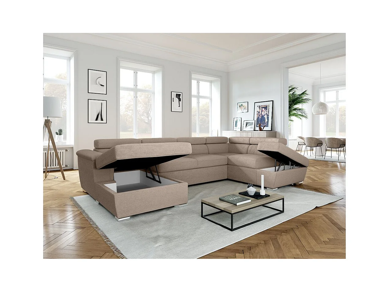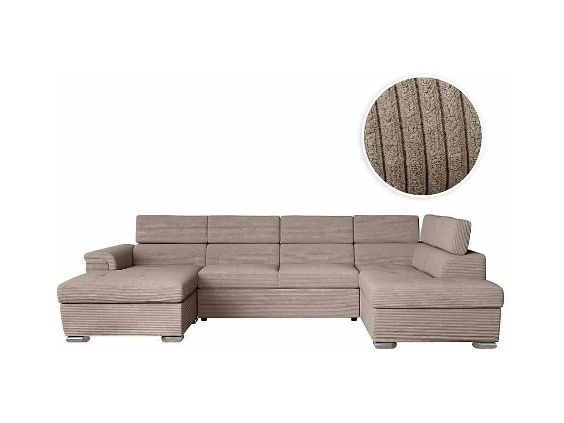 Canapé panoramique 6 places Paola convertible avec 2 coffres en velours côtelé - Taupe - L320,5 x P188 x H76cm - Loungitude