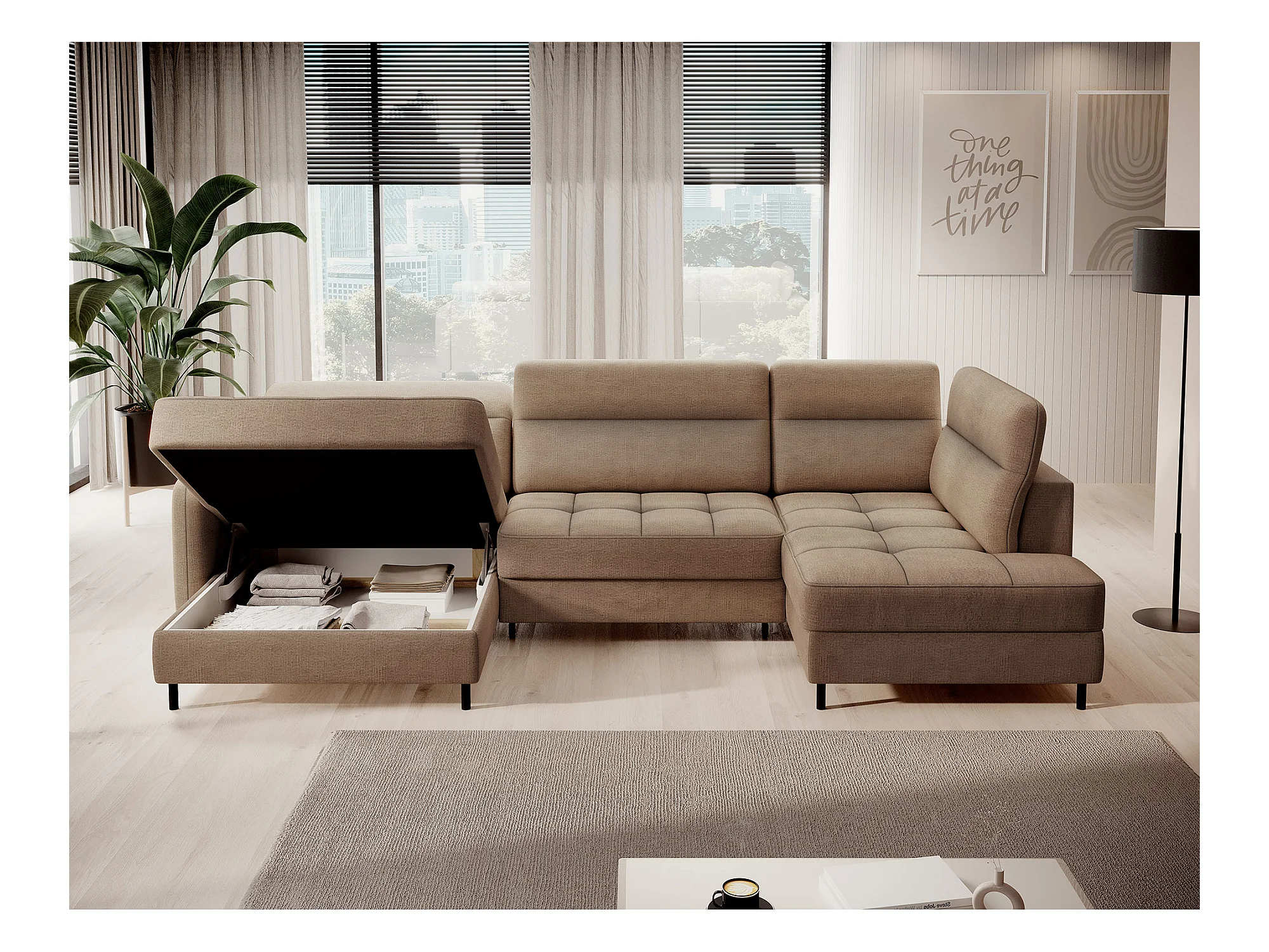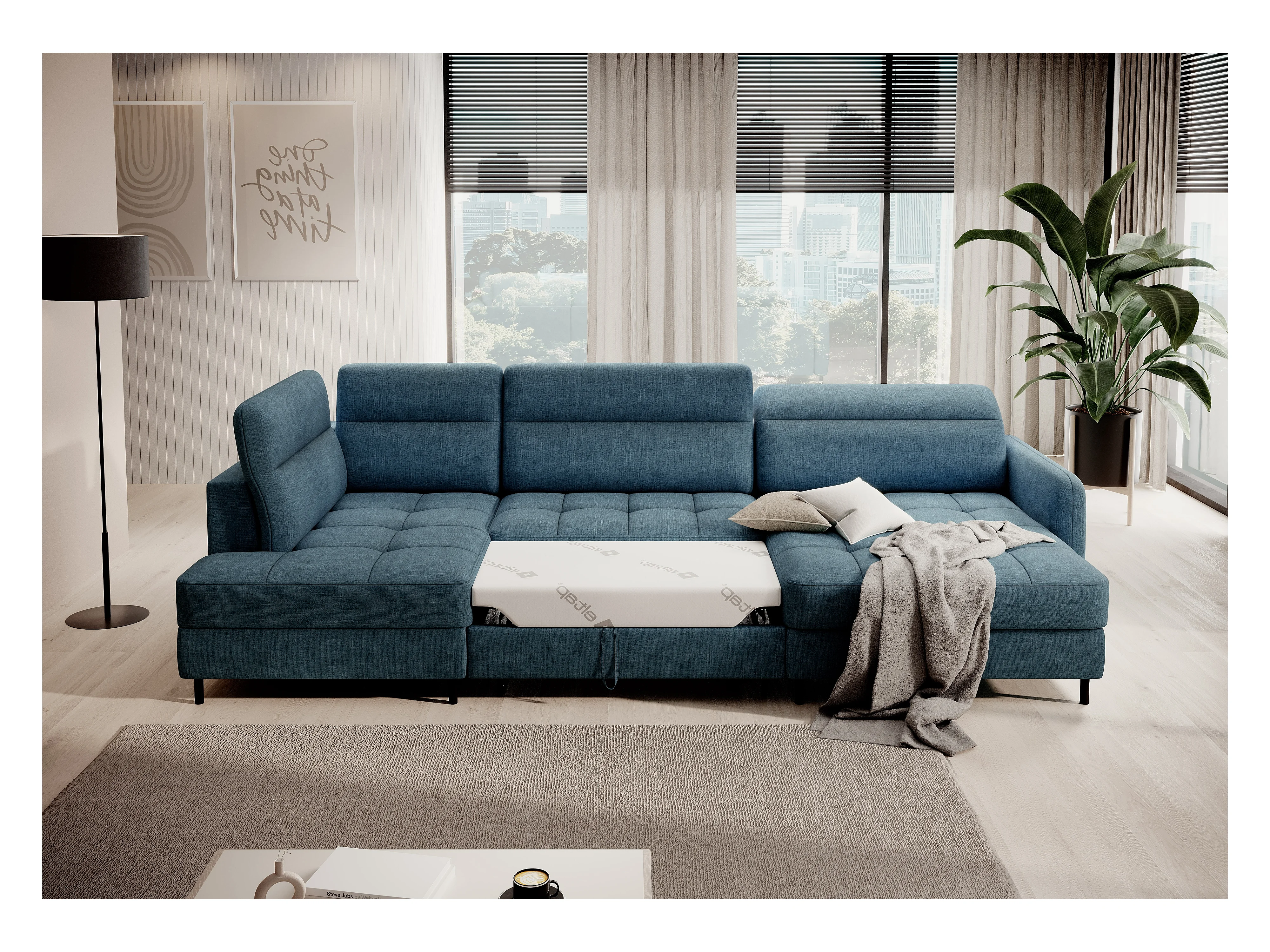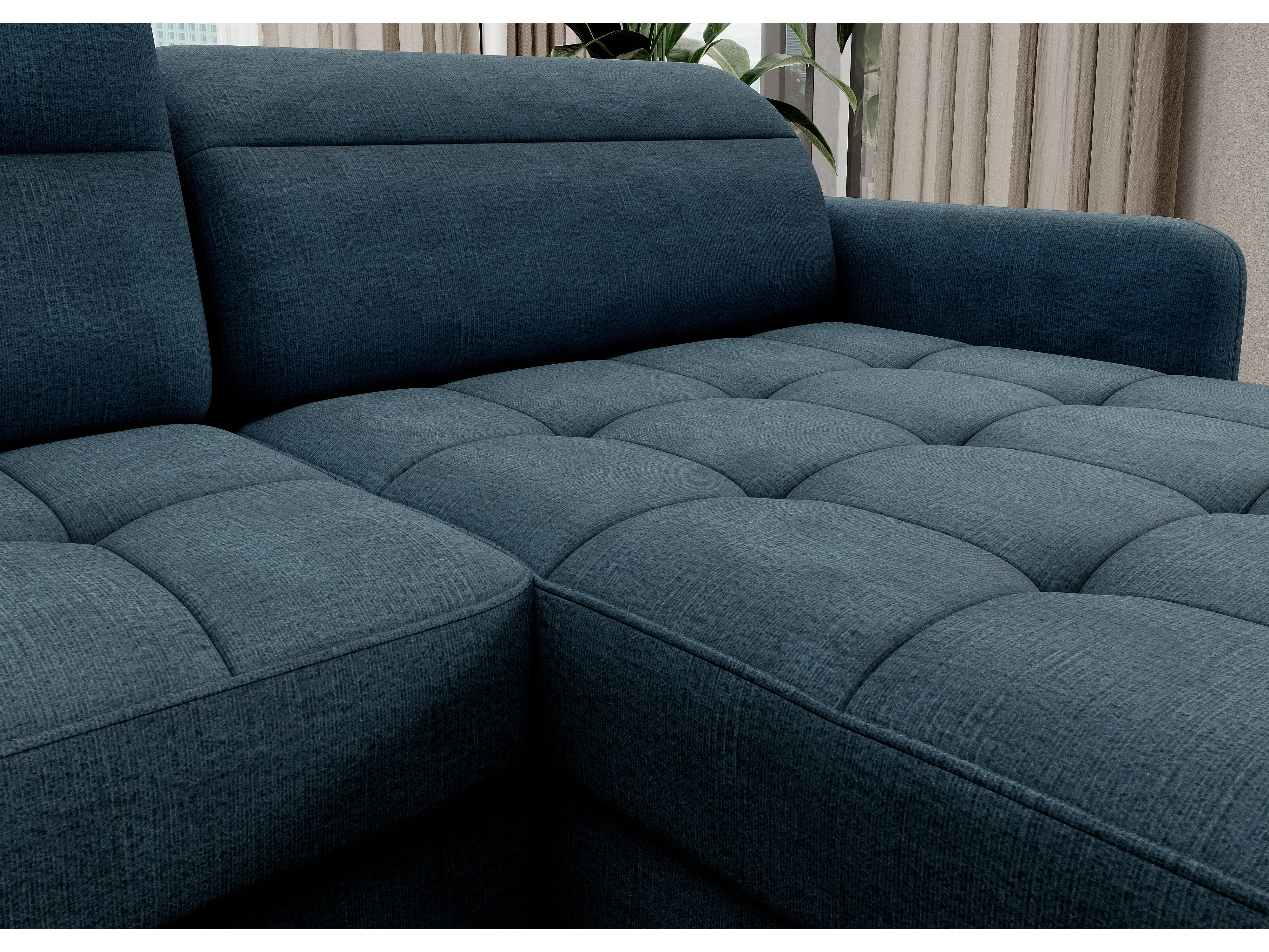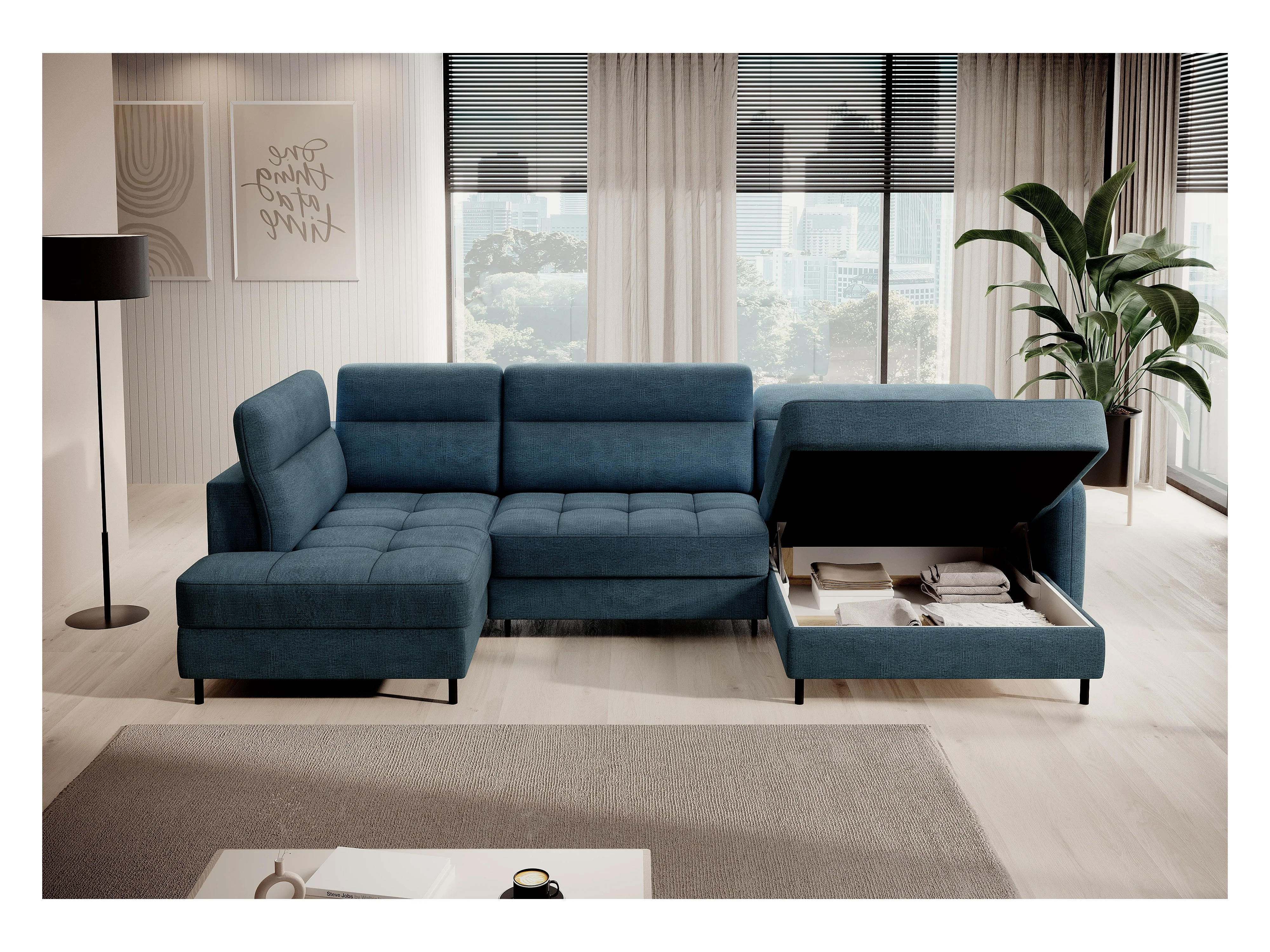 Canapé panoramique convertible BENTO en tissu avec coffre de rangement-Bleu canard-angle droit