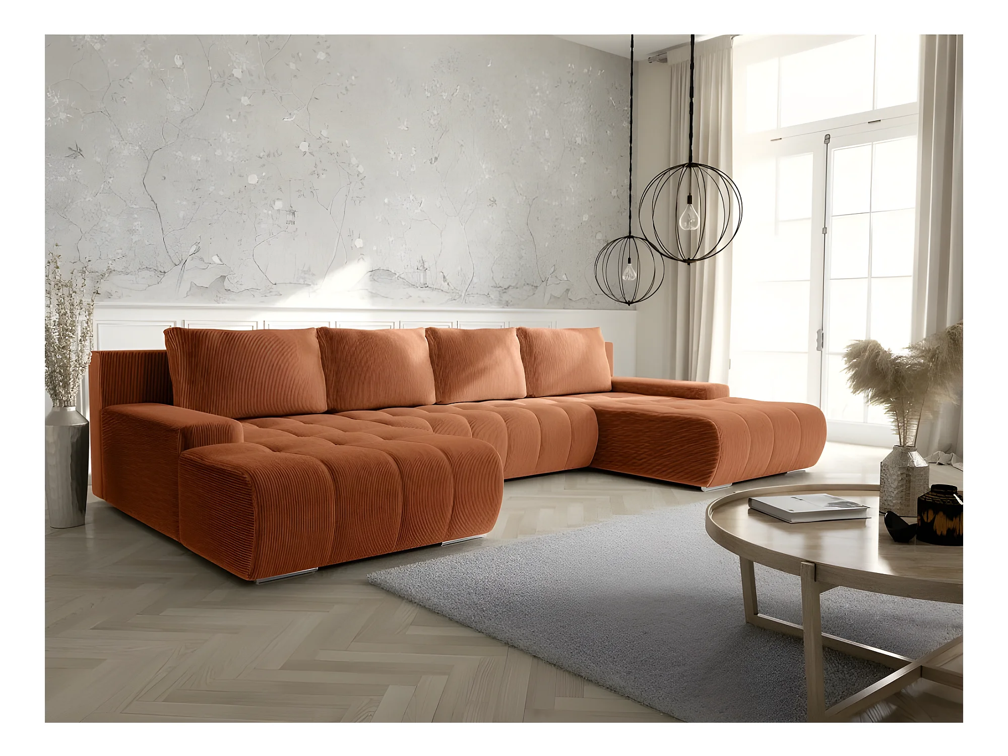 Canapé panoramique convertible BOLUTI en velours côtelé terracotta