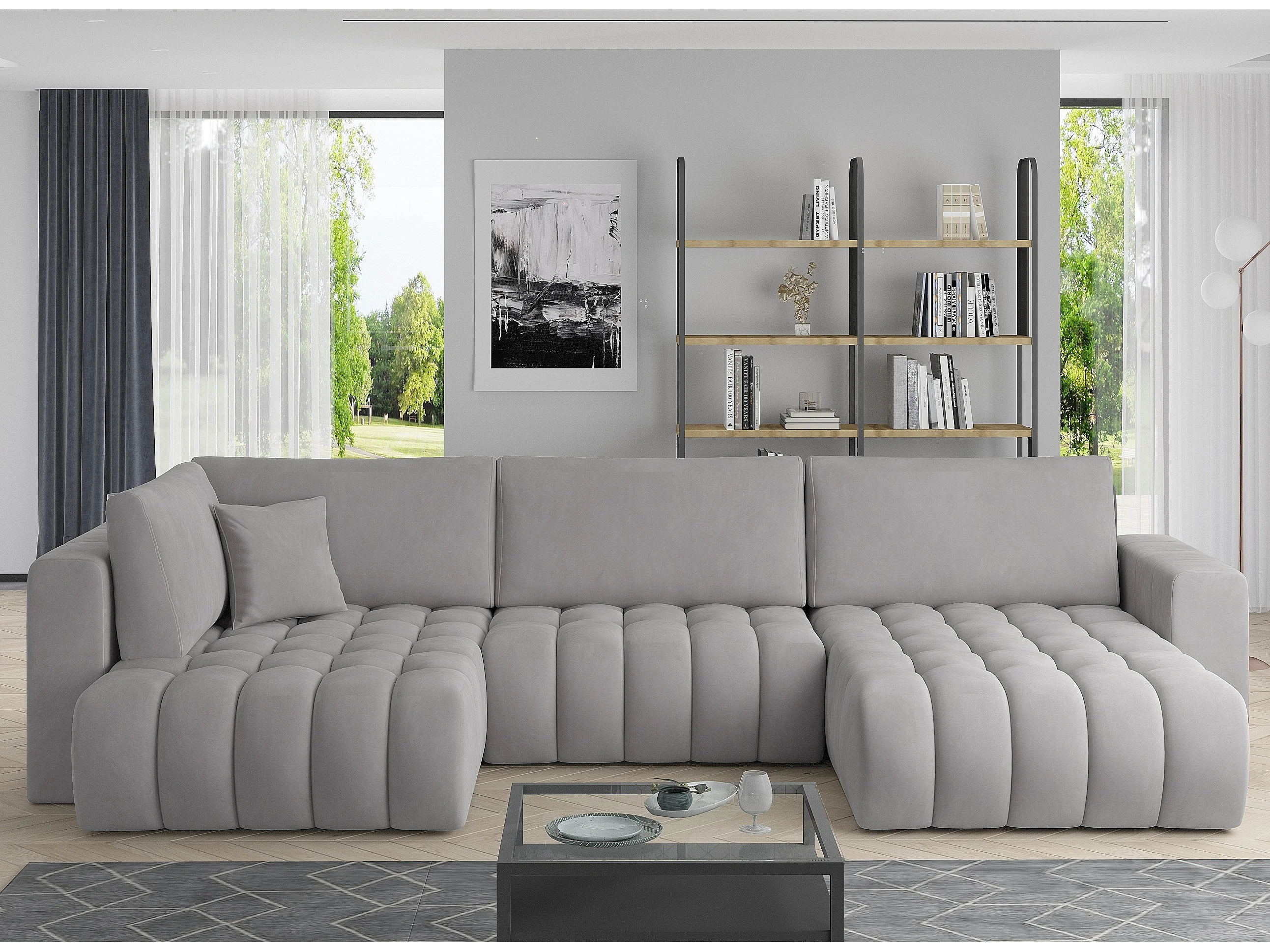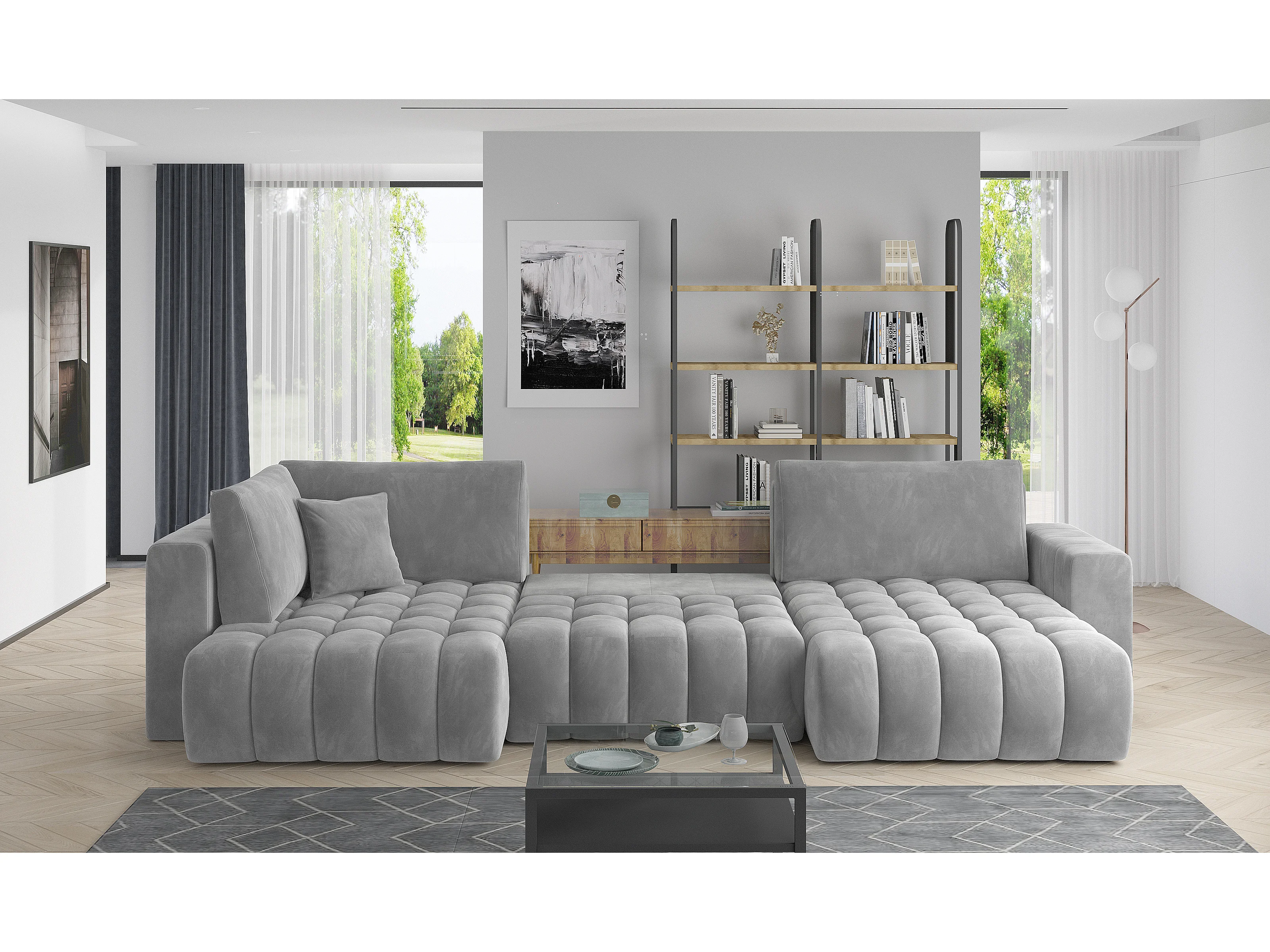 Canapé panoramique convertible design capitonné tissu gris clair méridienne droite Boston 350cm