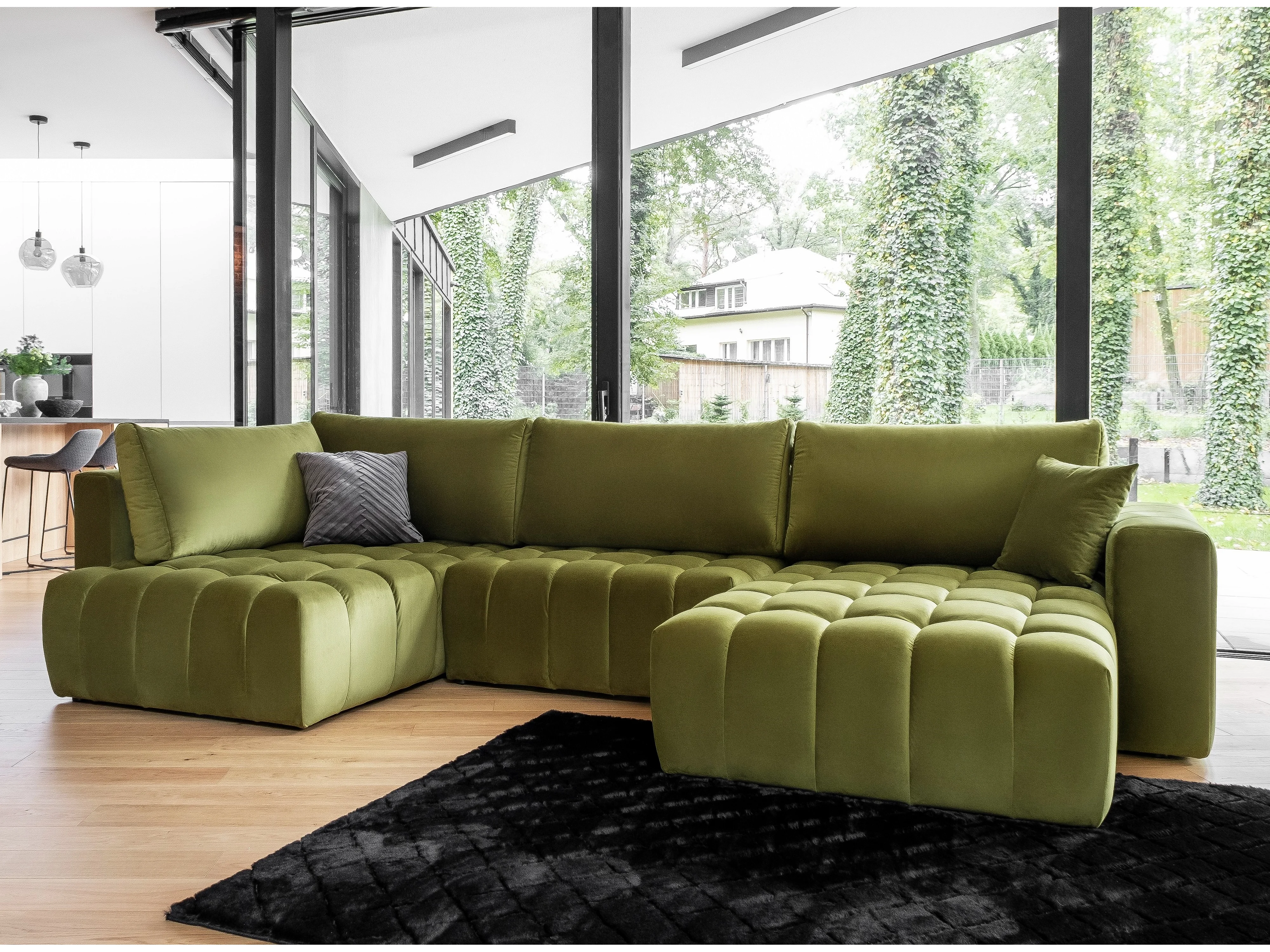 Canapé panoramique convertible design capitonné velours vert kaki méridienne droite Boston 350cm