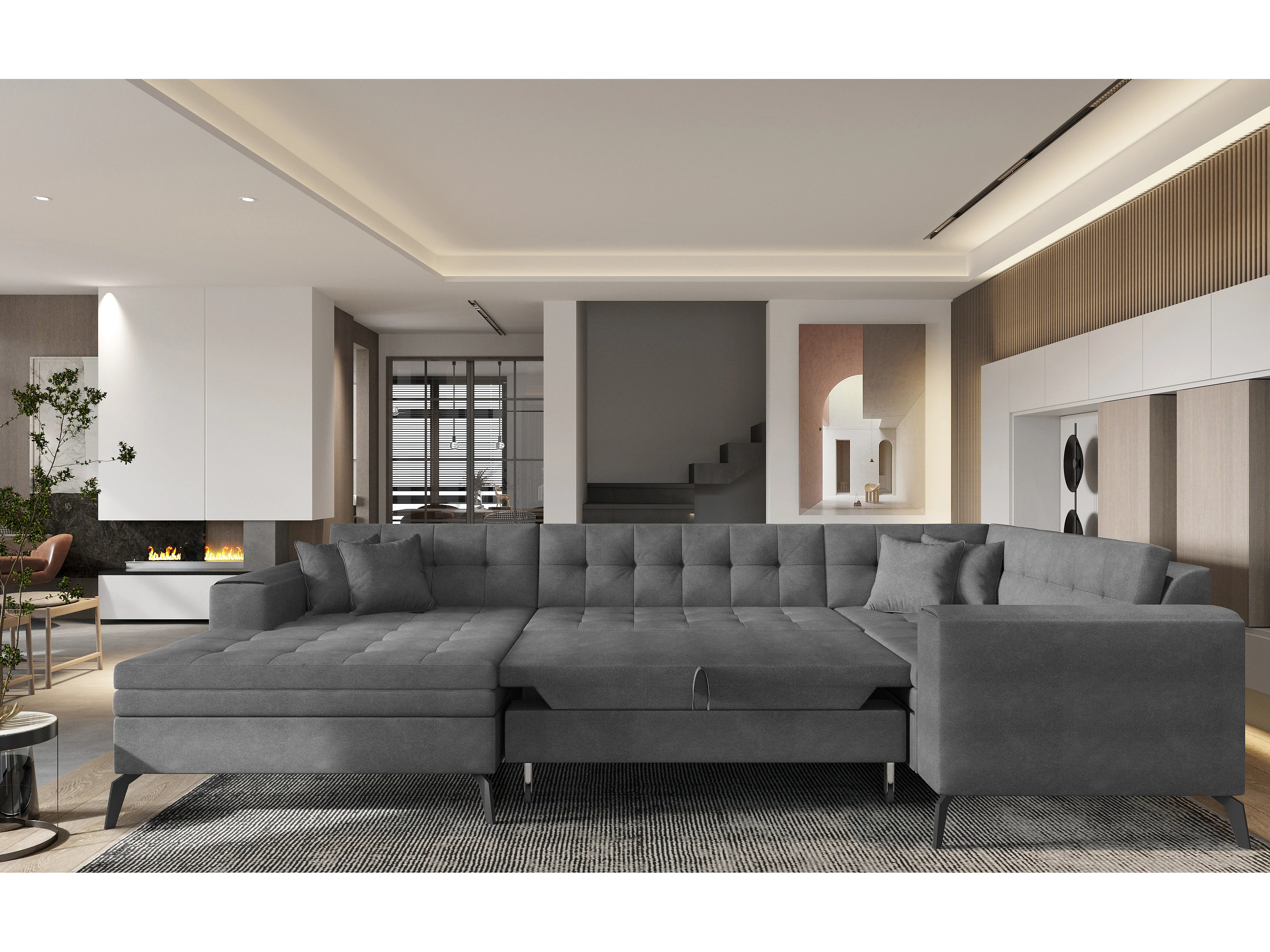 Canapé panoramique convertible gauche tissu bordeaux matelassé Bonty 340cm