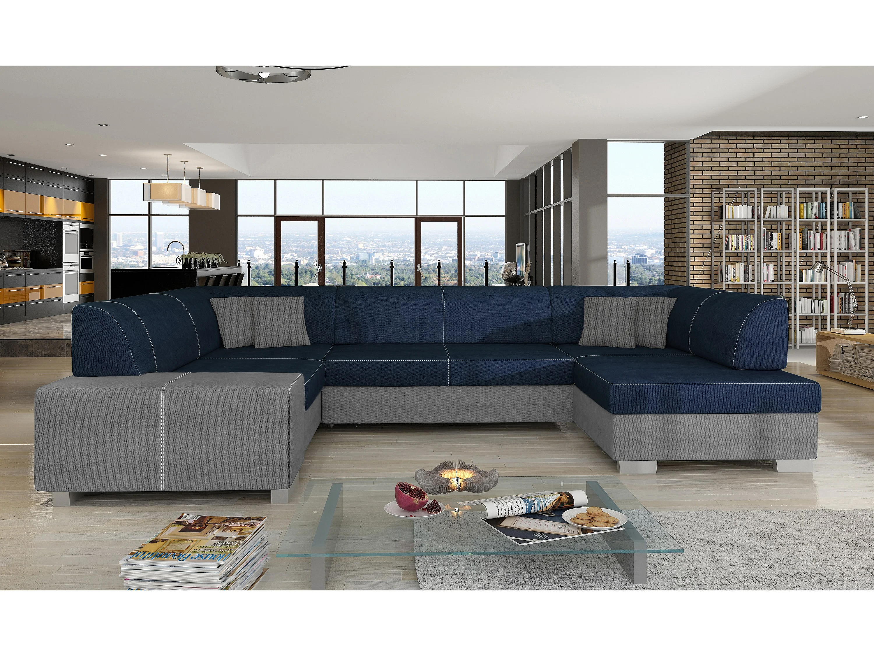 Canapé panoramique convertible HOUSTON en velours avec coffre de rangement-Gris clair/Bleu-Coffre à droite