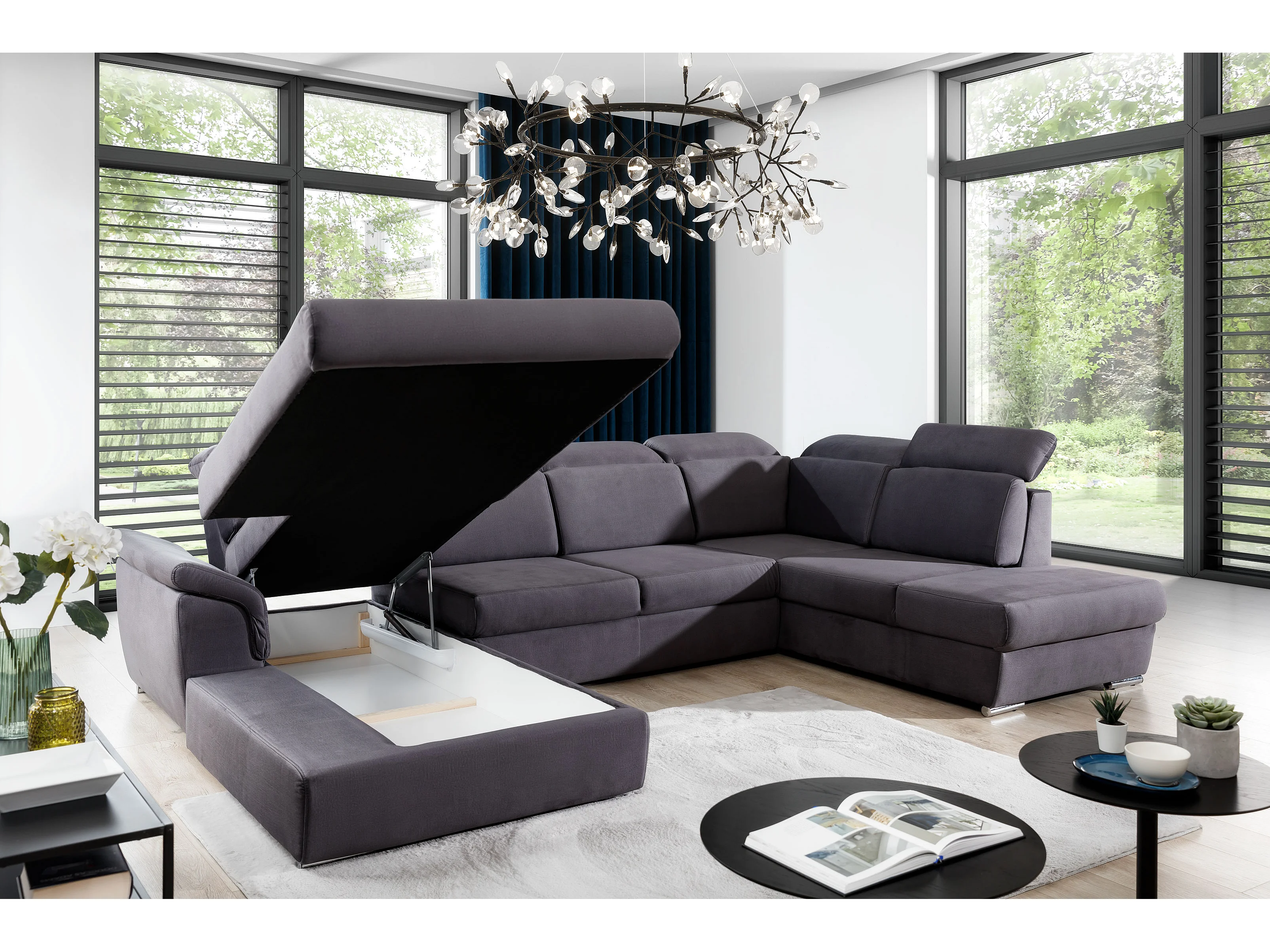 Canapé panoramique convertible LEVANO velours - Rangement et appuie-têtes réglables-Gris clair/Bleu-Coffre à gauche