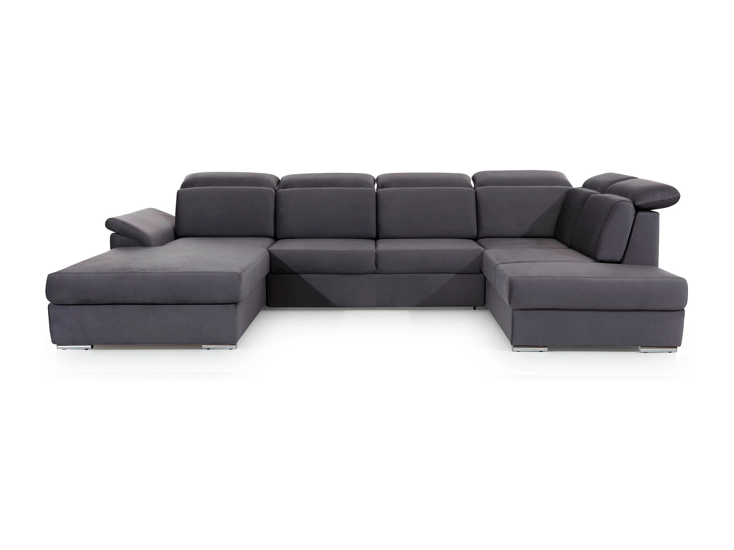 Canapé panoramique convertible LEVANO velours - Rangement et appuie-têtes réglables-Gris clair/Vert-Coffre à droite