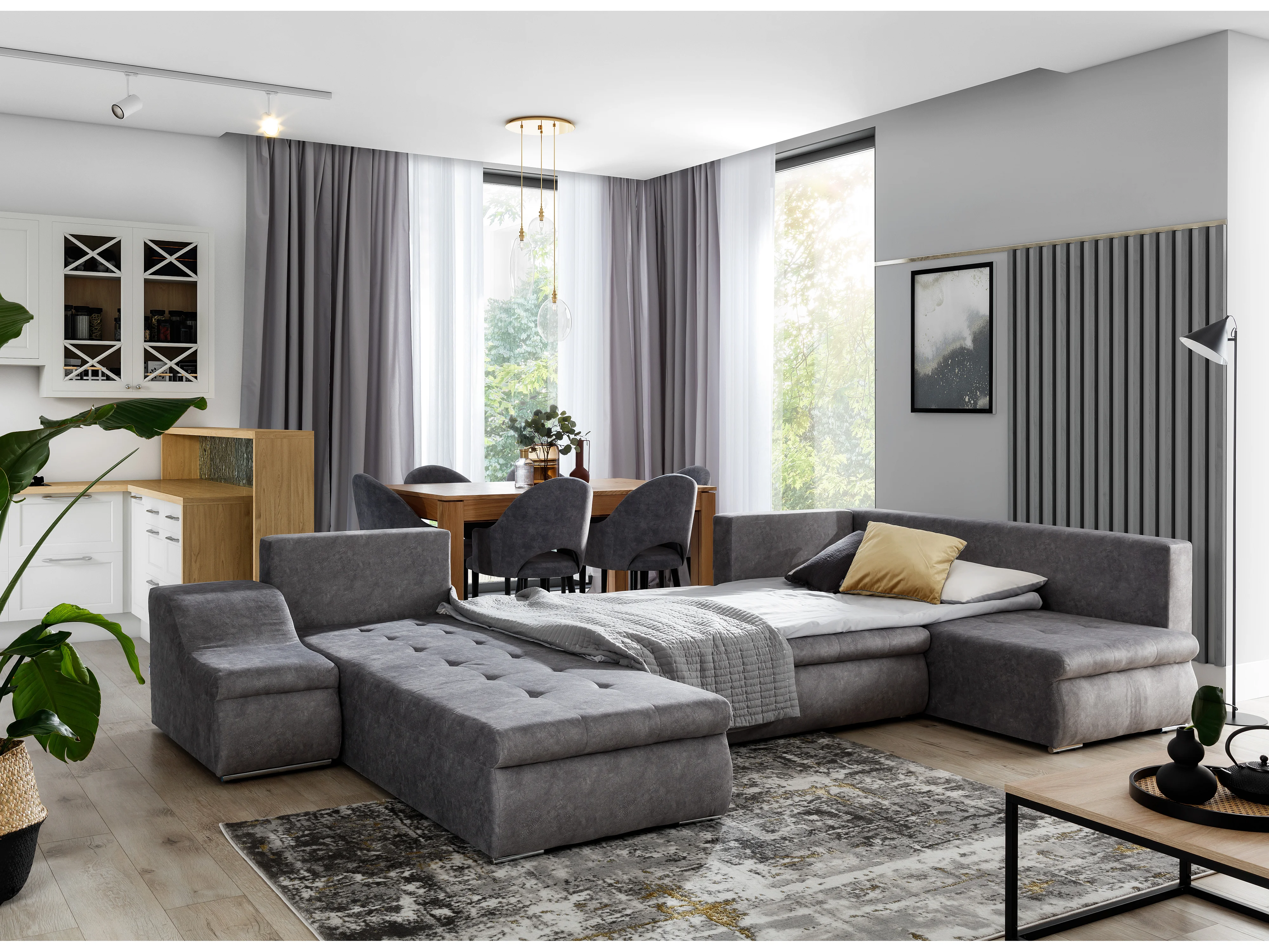 Canapé panoramique convertible velours bleu pétrole Jonaz 340cm-Méridienne A gauche