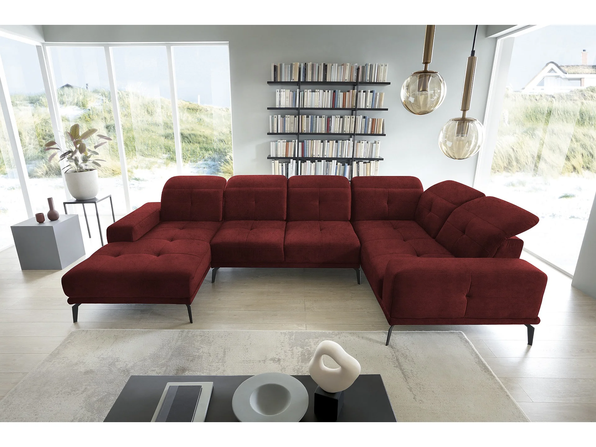 Canapé panoramique design velours bordeaux têtières angle droit avec accoudoir Stan 350cm