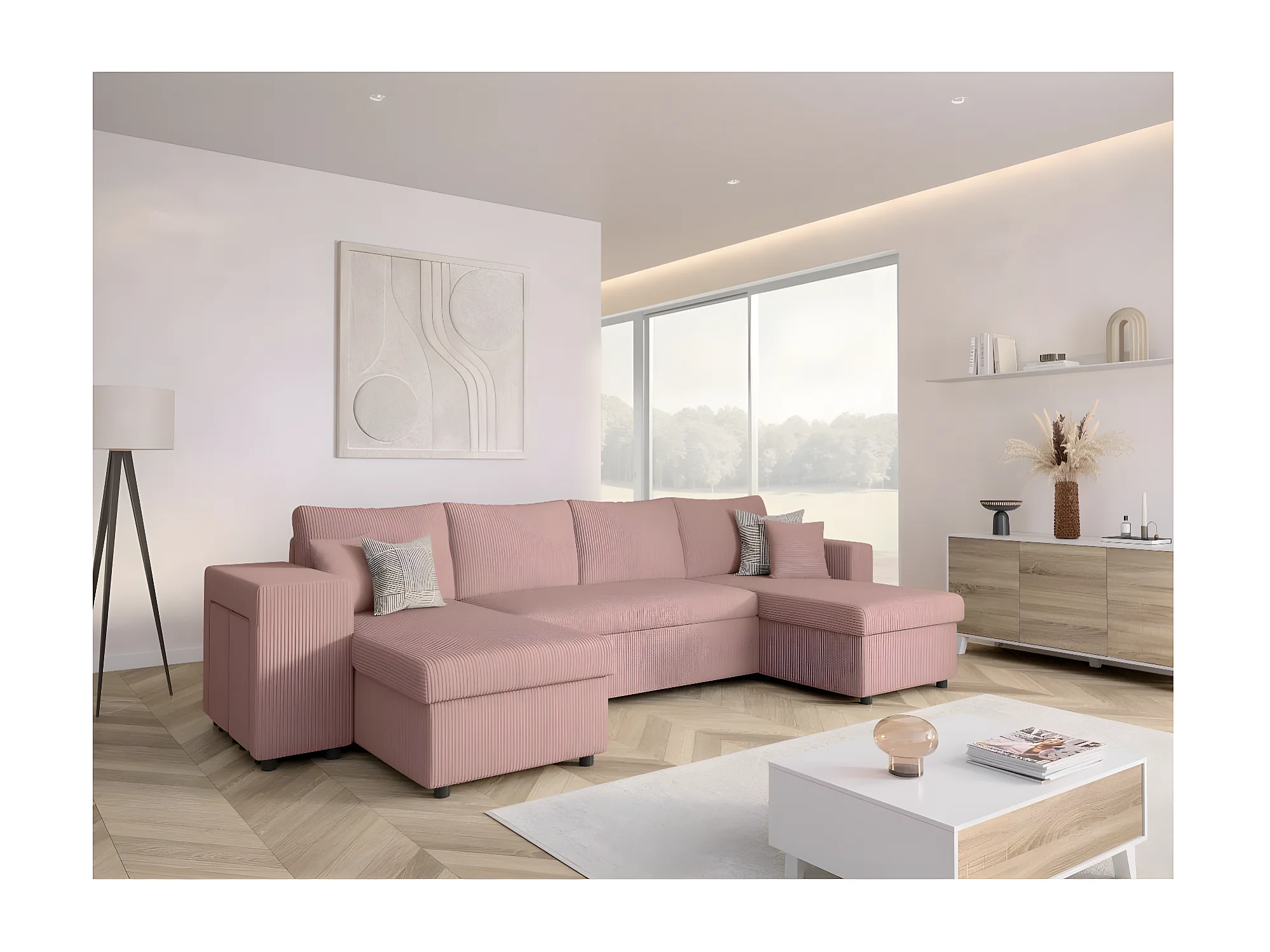 Canapé panoramique Oslo convertible avec 2 coffres, 2 poufs à gauche en velours côtelé rose - L311 x P146 x H81cm - Loungitude