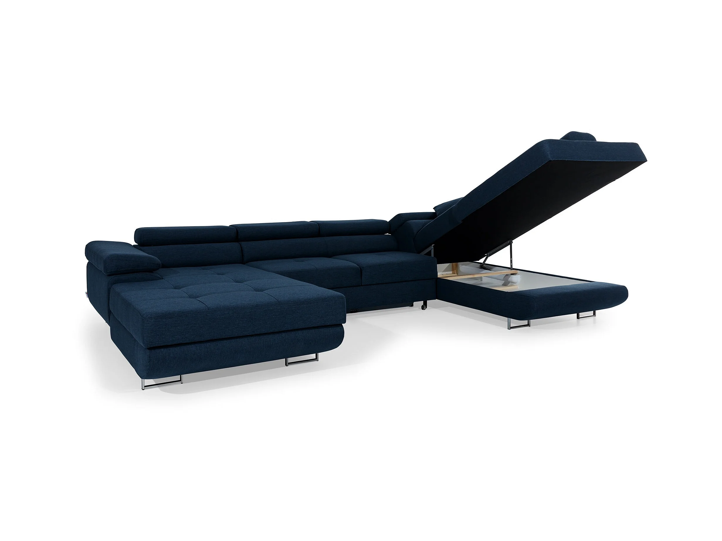Canapé panoramique tissu beige clair chiné et simili cuir beige convertible avec coffre de rangement Romano 345cm-Coffre de rangement à droite