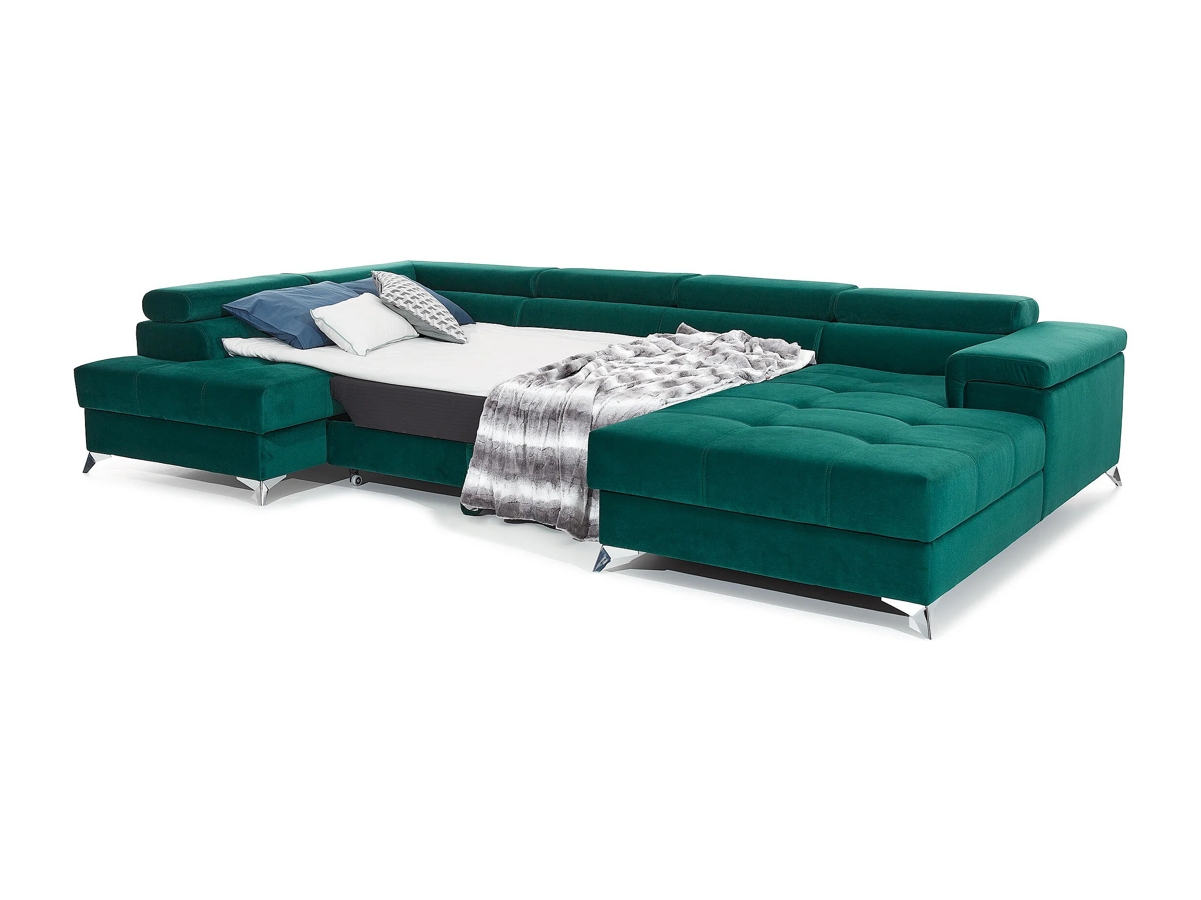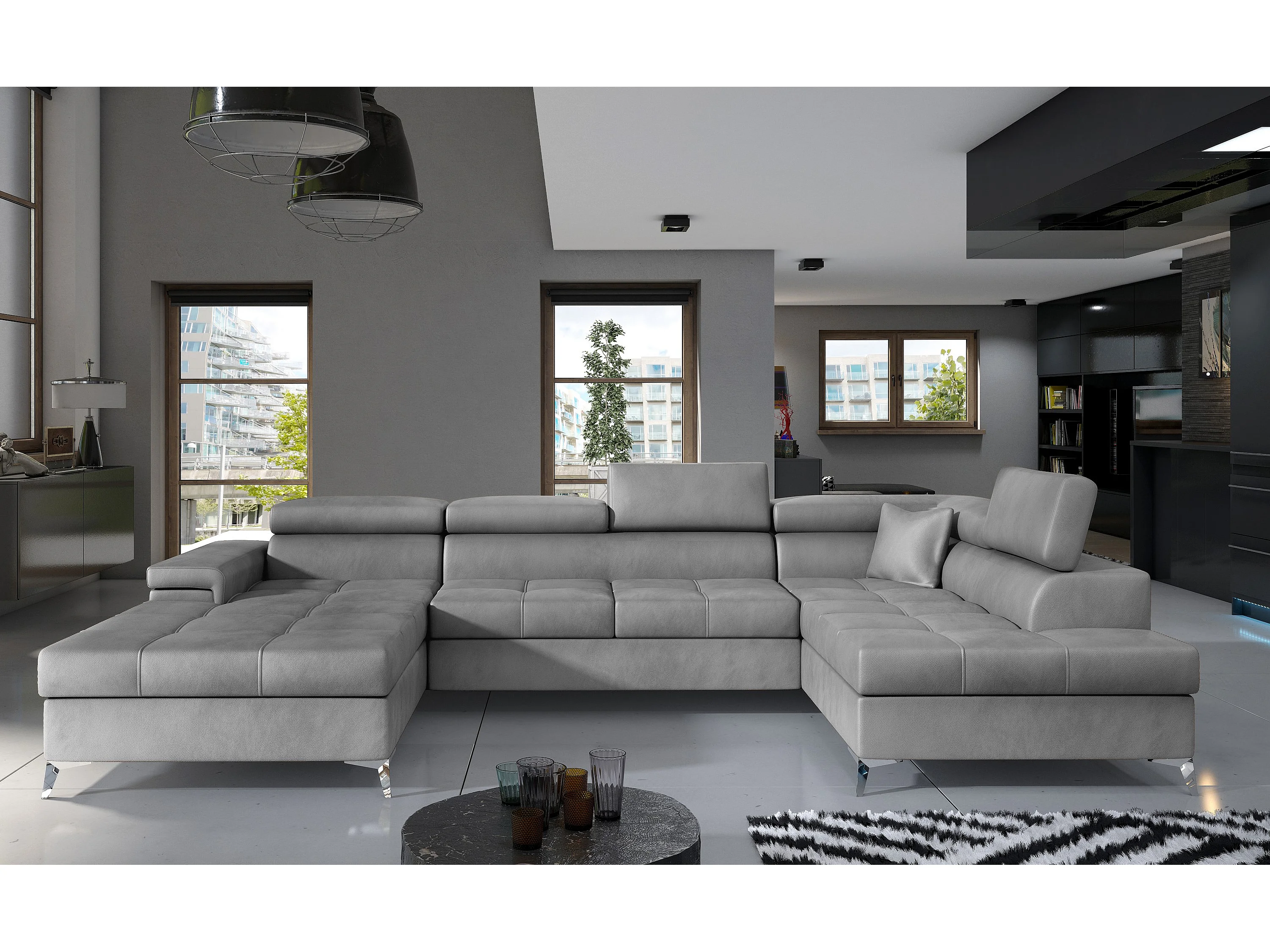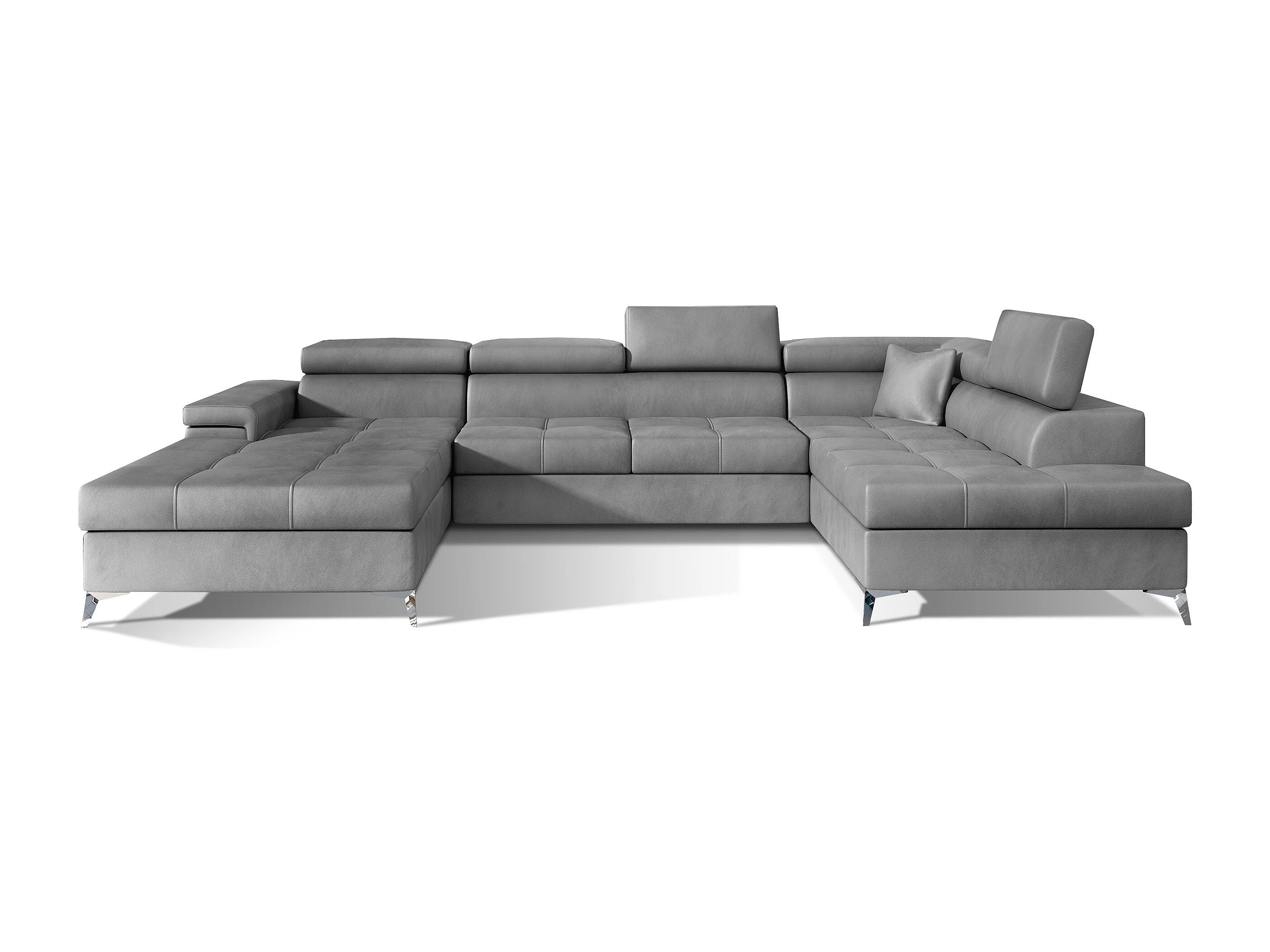 Canapé panoramique convertible KUTTY velours - Rangement et appuie-têtes réglables-Gris clair-Coffre de rangement à droite