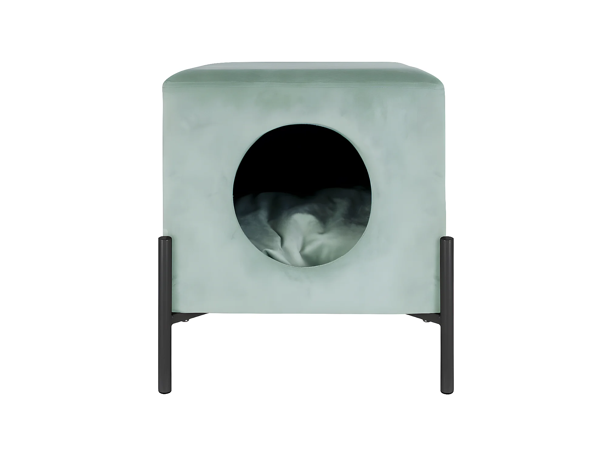 Maison de toilette pour chat style industriel porte entrée latérale boule suspendue châssis acier aspect bois clair