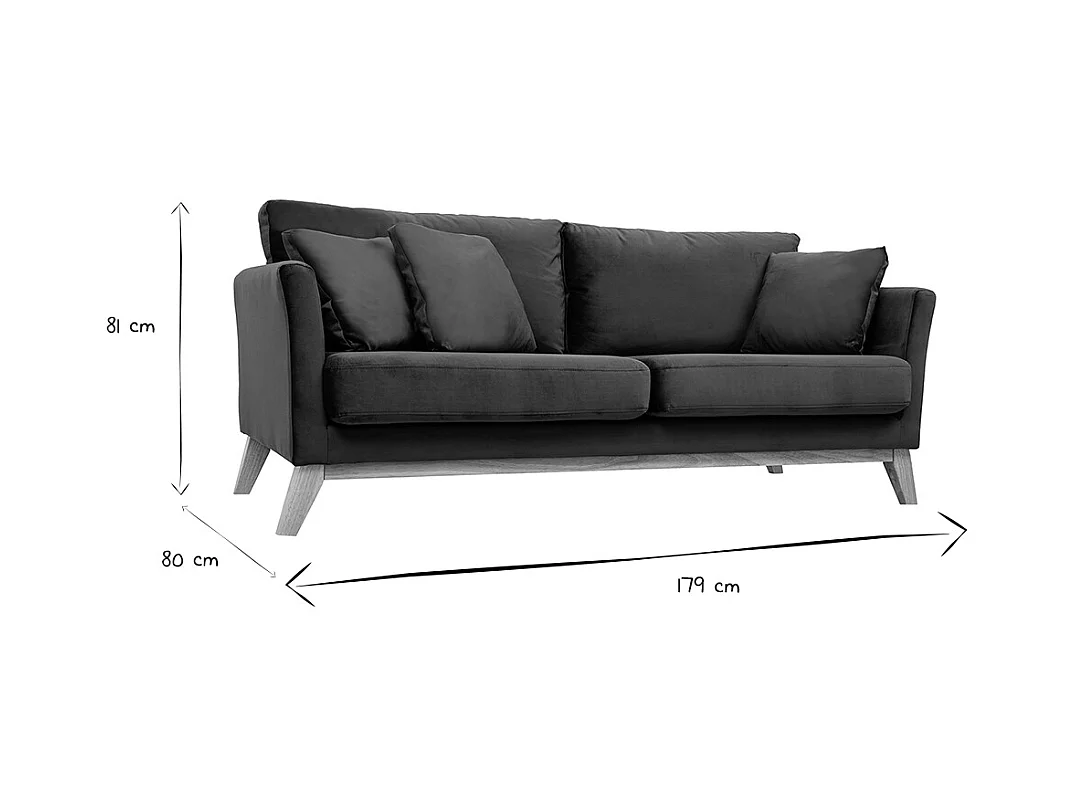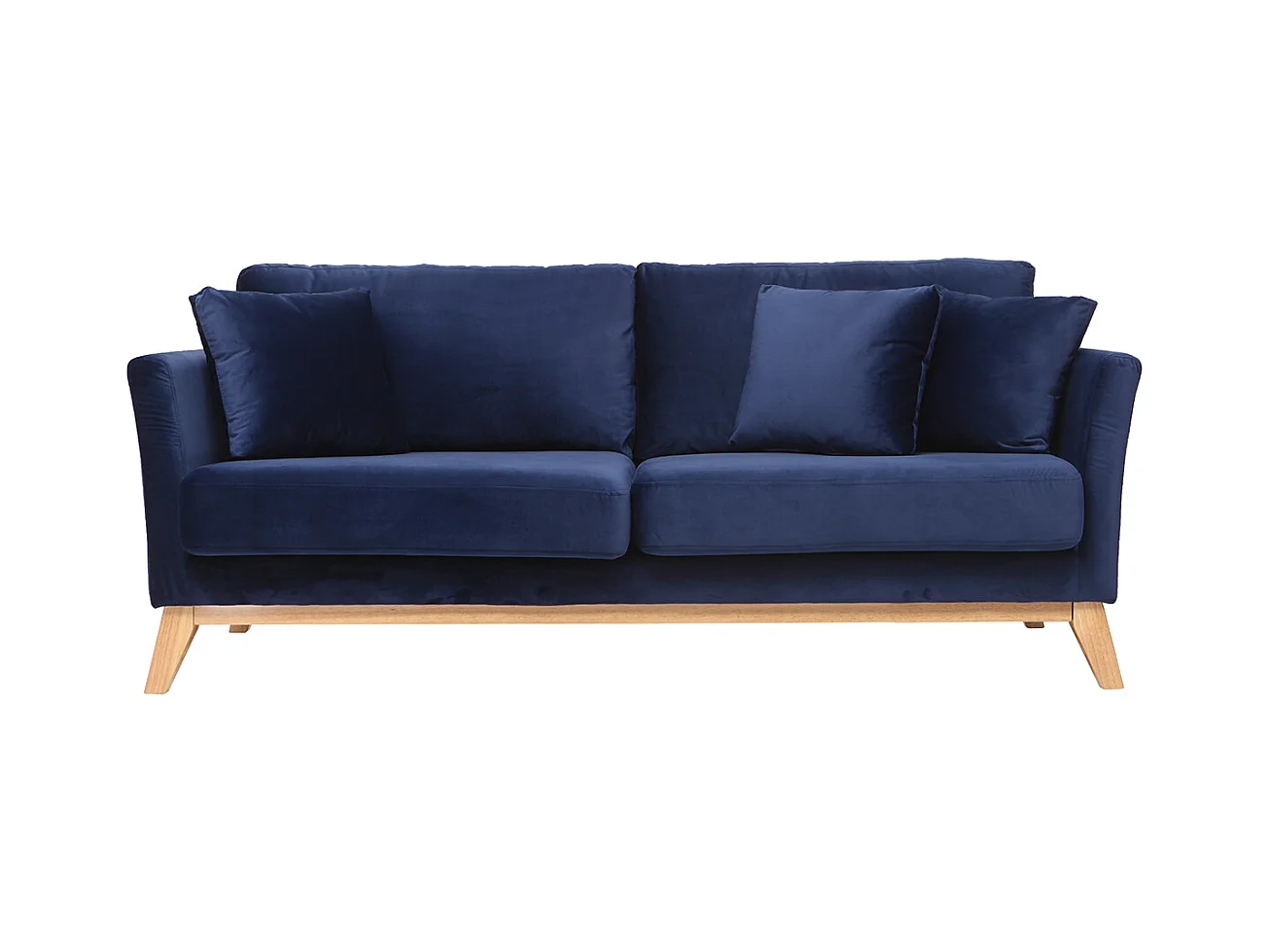 Canapé scandinave déhoussable 3 places en tissu velours bleu nuit et bois clair OSLO