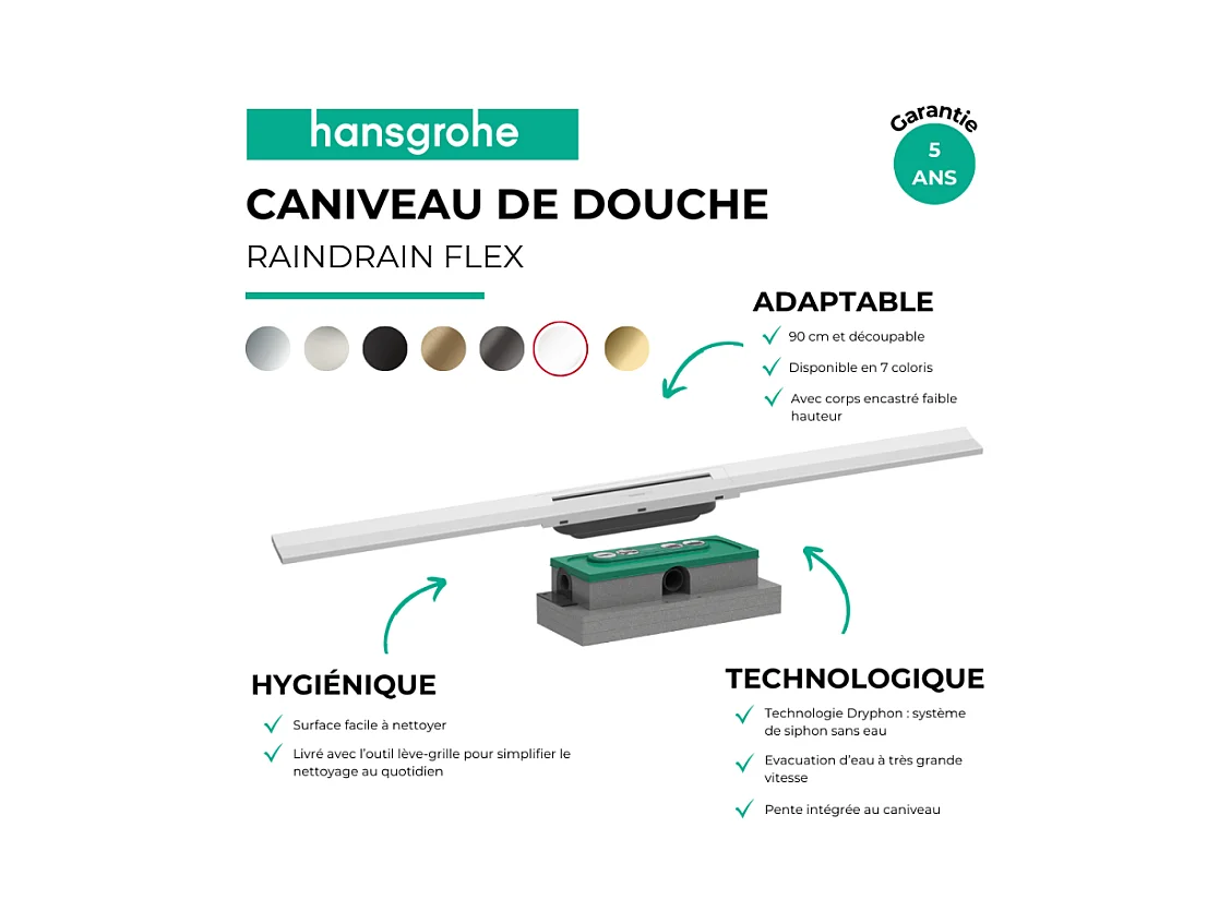 Caniveau de douche HANSGROHE RainDrain Flex 90 Blanc mat + Corps encastré à faible hauteur