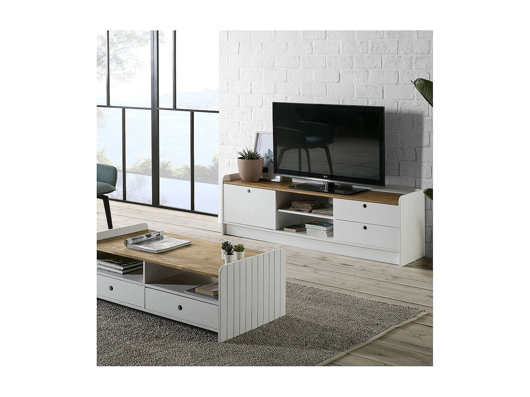 CARLA - Meuble TV 1 Porte Coul. 2 Tiroirs Bois et Blanc