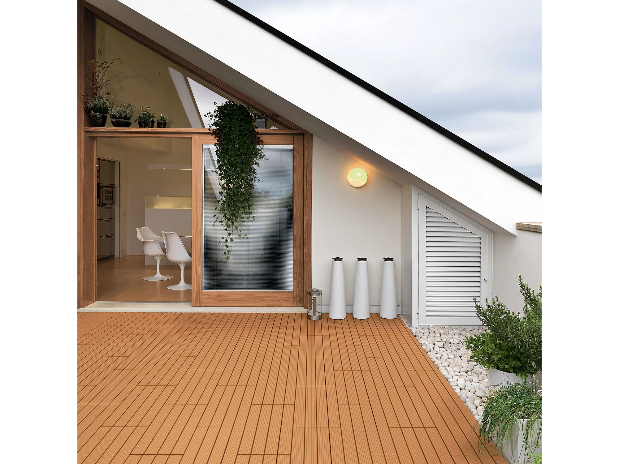 Dalles de terrasse WPC 30x30cm 11 pièces 1m² marron clair aspect bois système clipsable drainage antidérapant intérieur extérieur revêtement de sol