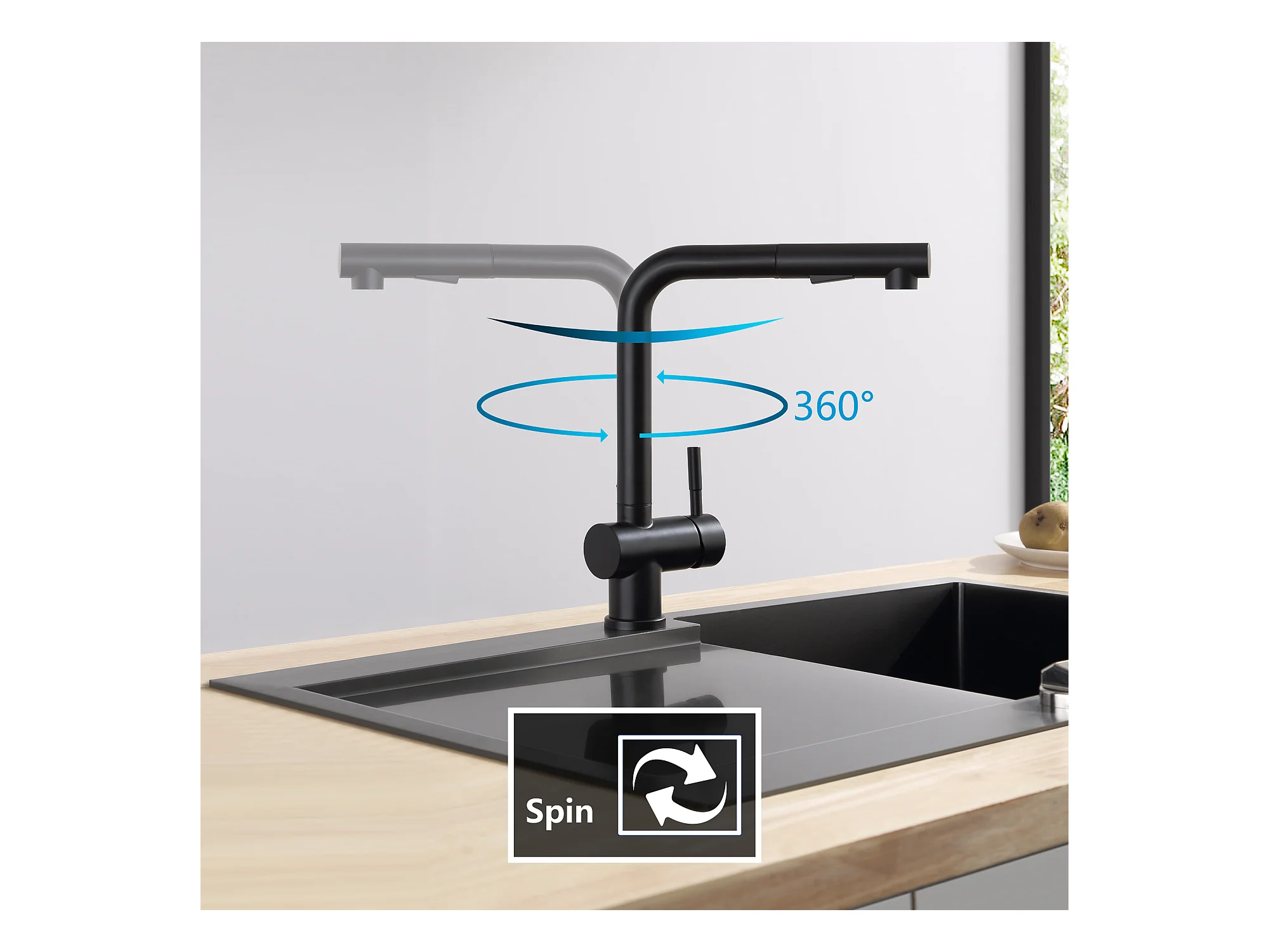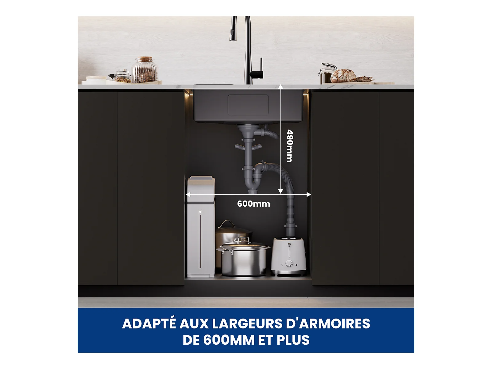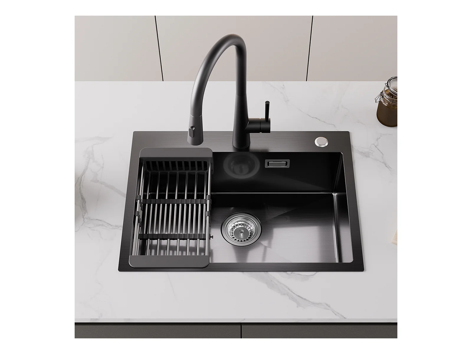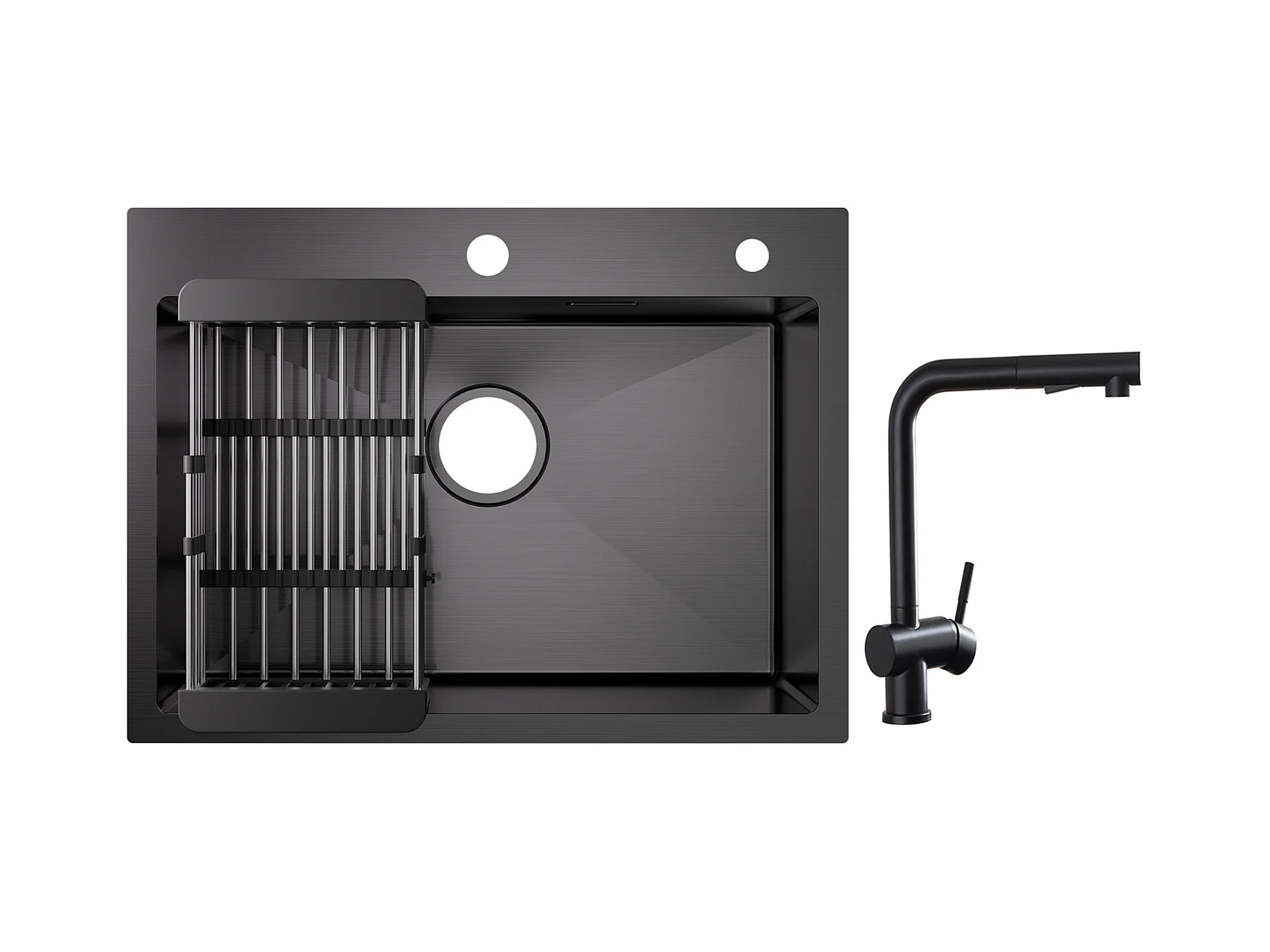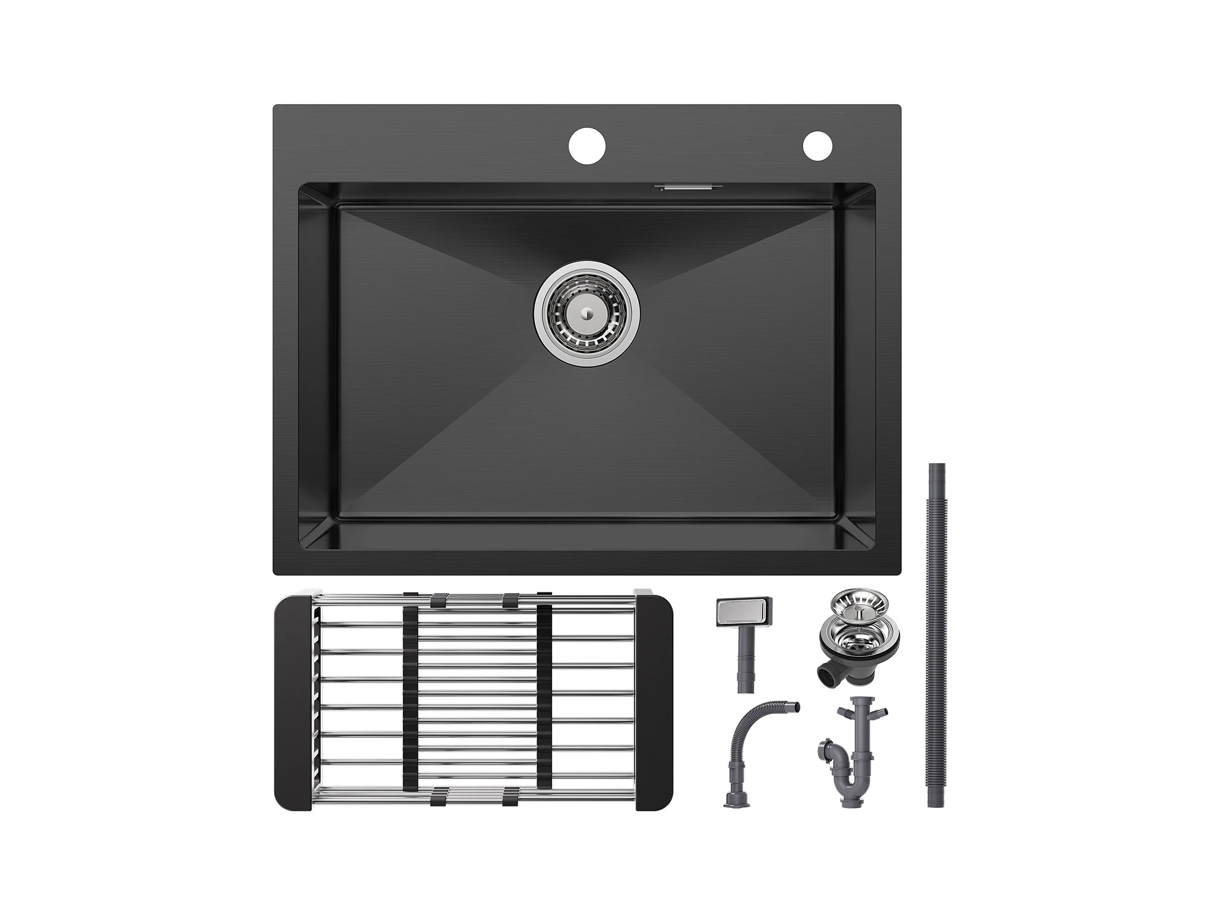 Cecipa max Évier 1 Bac Inox avec Panier de Drainage - Évier de Cuisine Noir 60×45×18 cm + Robinets avec Douchette Extractible, Mitigeur d'évier Noir