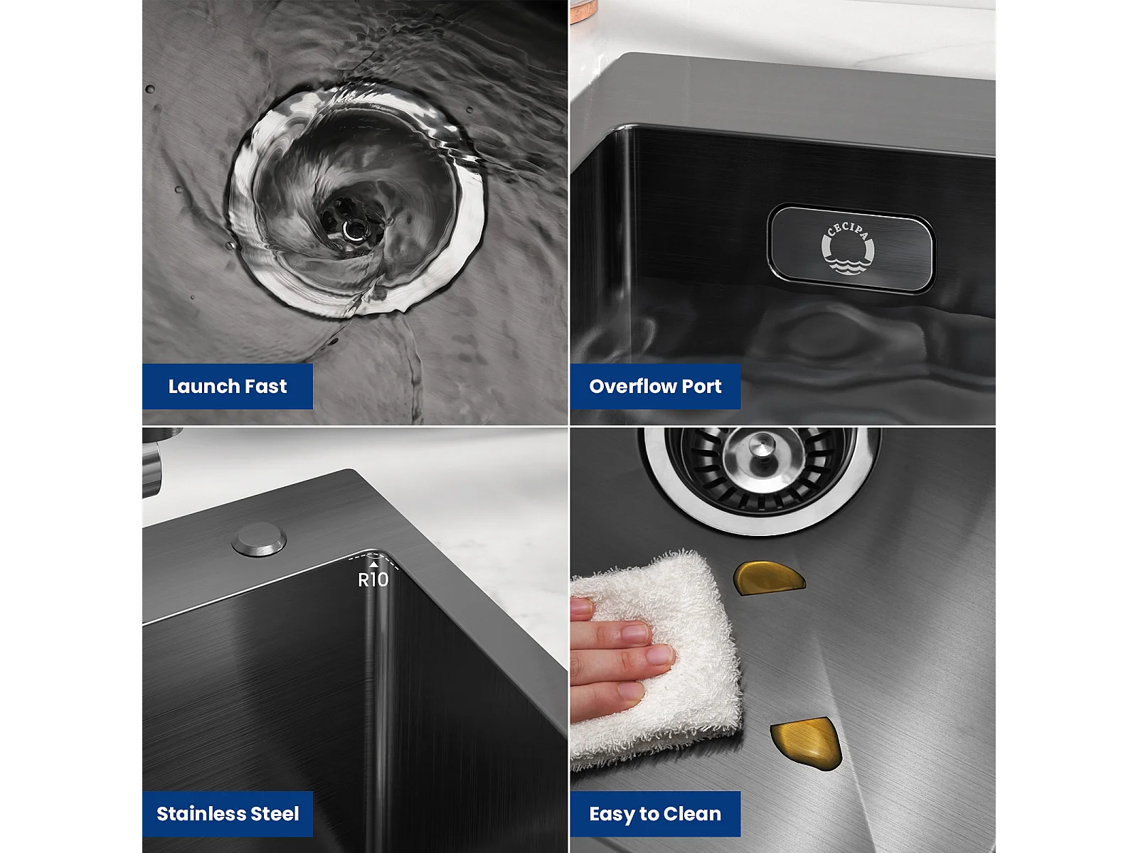 Cecipa max Évier Cuisine 1 Bac 40 × 45 cm Évier Inox 304 Montage à Encastrer ou à Fleur de Plan Au Moins 40 cm du Bas de l'Armoire - Noir,EU Modèle