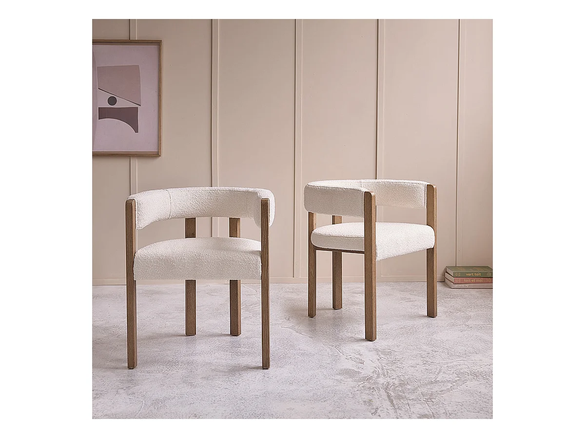 Chaise arrondie en chêne massif et tissu bouclette