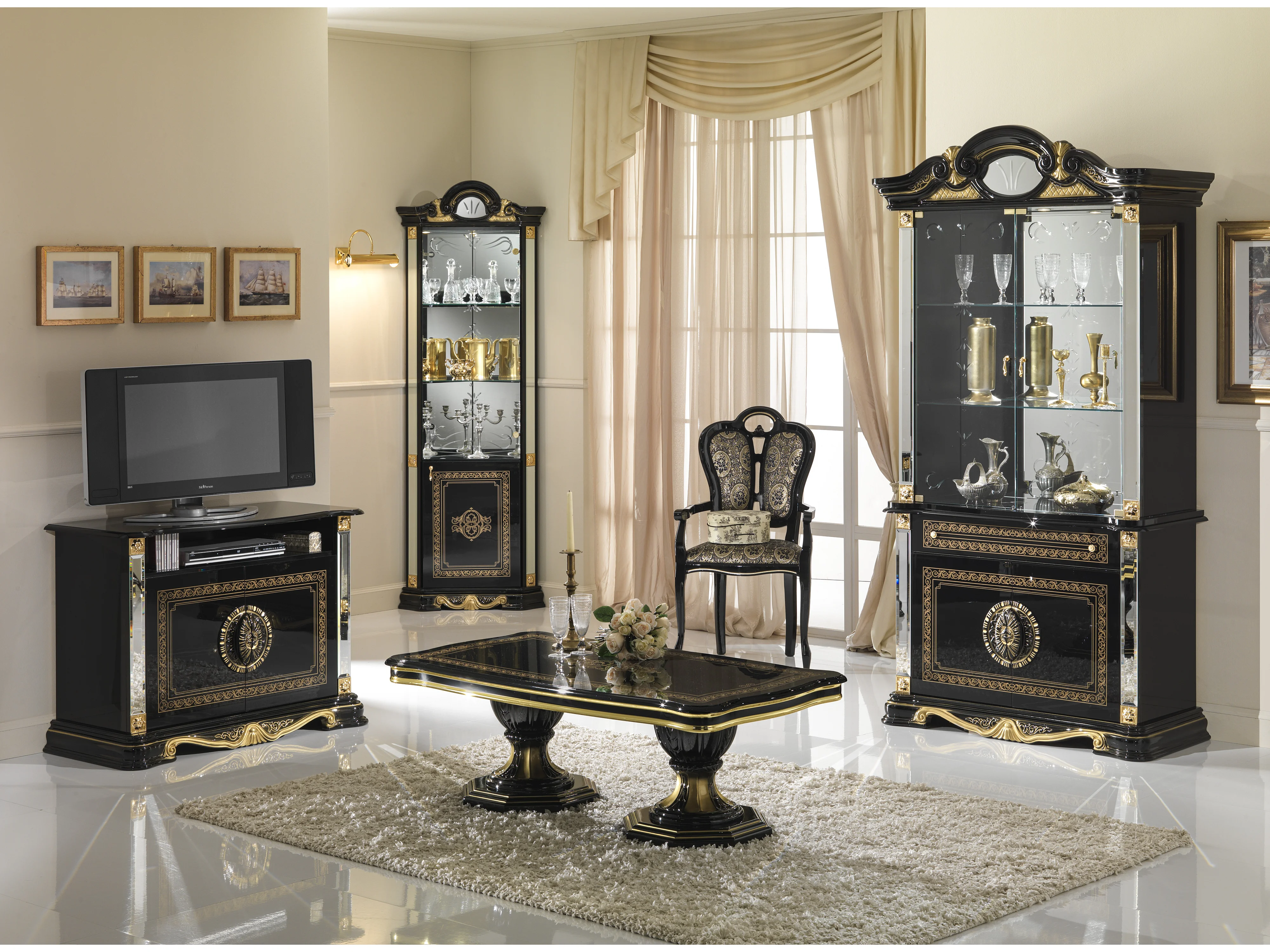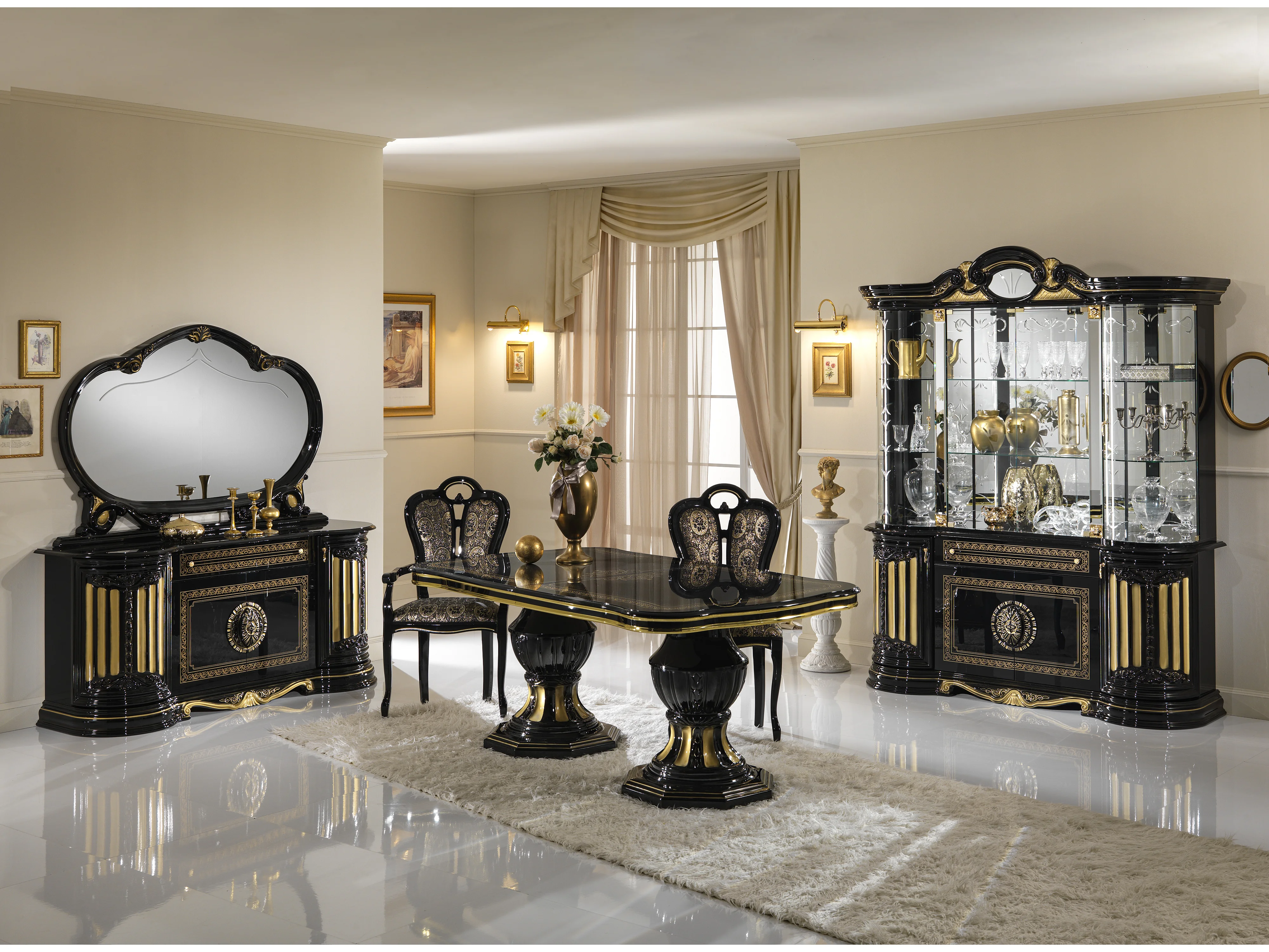 Chaise bois massif marron et assise tissu noir avec motifs dorés Kerla