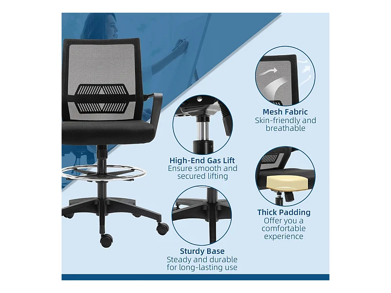 Chaise de bureau ergonomique avec appuie-tête, soutien lombaire, siège réglable et fonction basculante, tissu maillé, noir (64x59x104-124 cm)