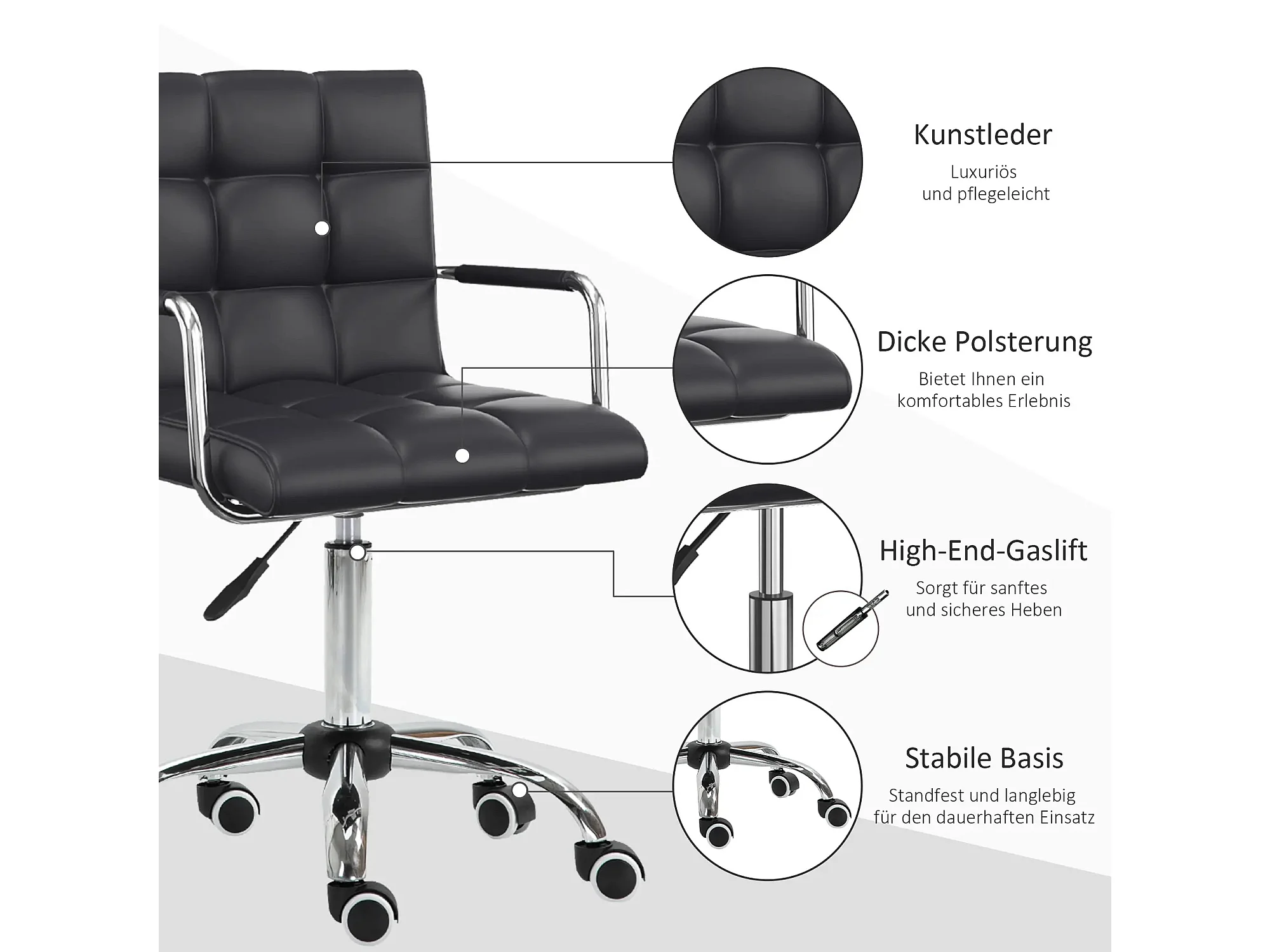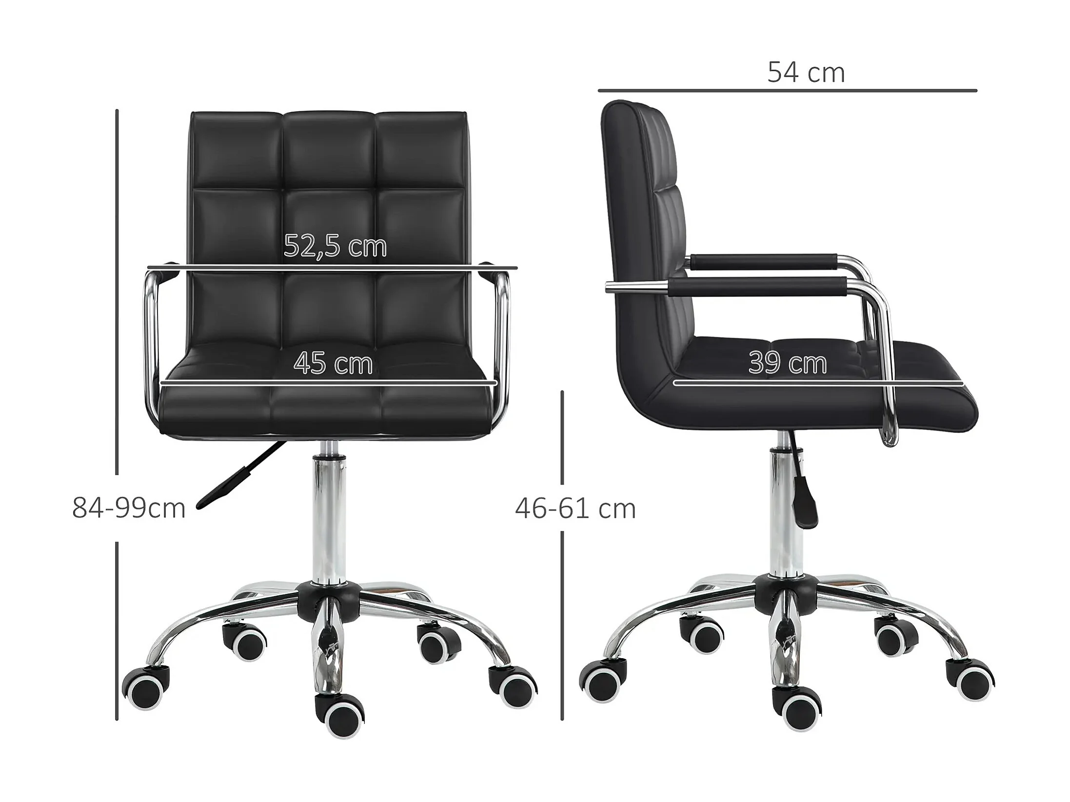 Chaise de bureau ergonomique, réglable en hauteur, avec accoudoirs, PVC, noir (52.5x54x99 cm)