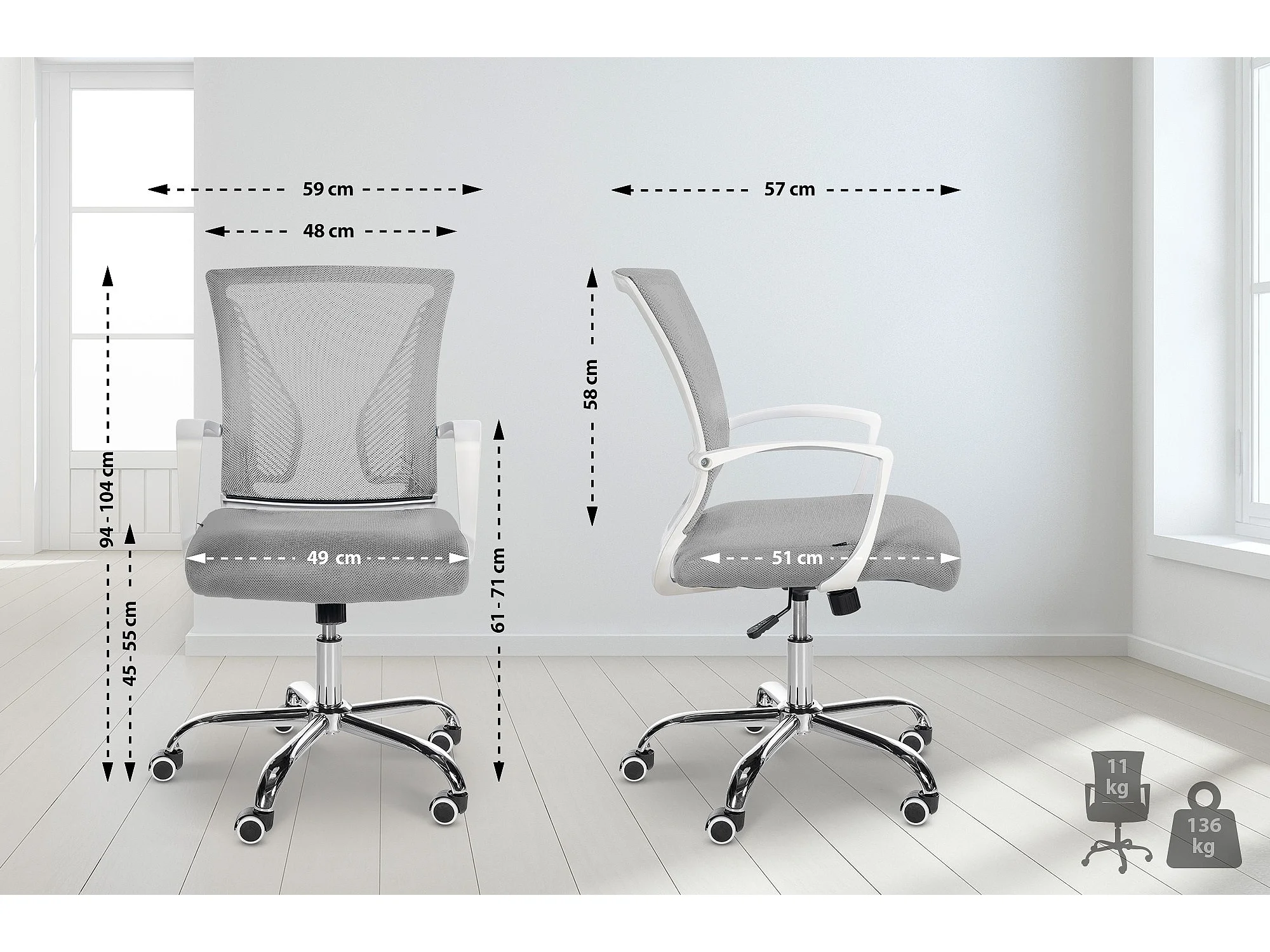 Chaise de bureau ergonomique hauteur réglable pivotante 360° revêtement maille gris