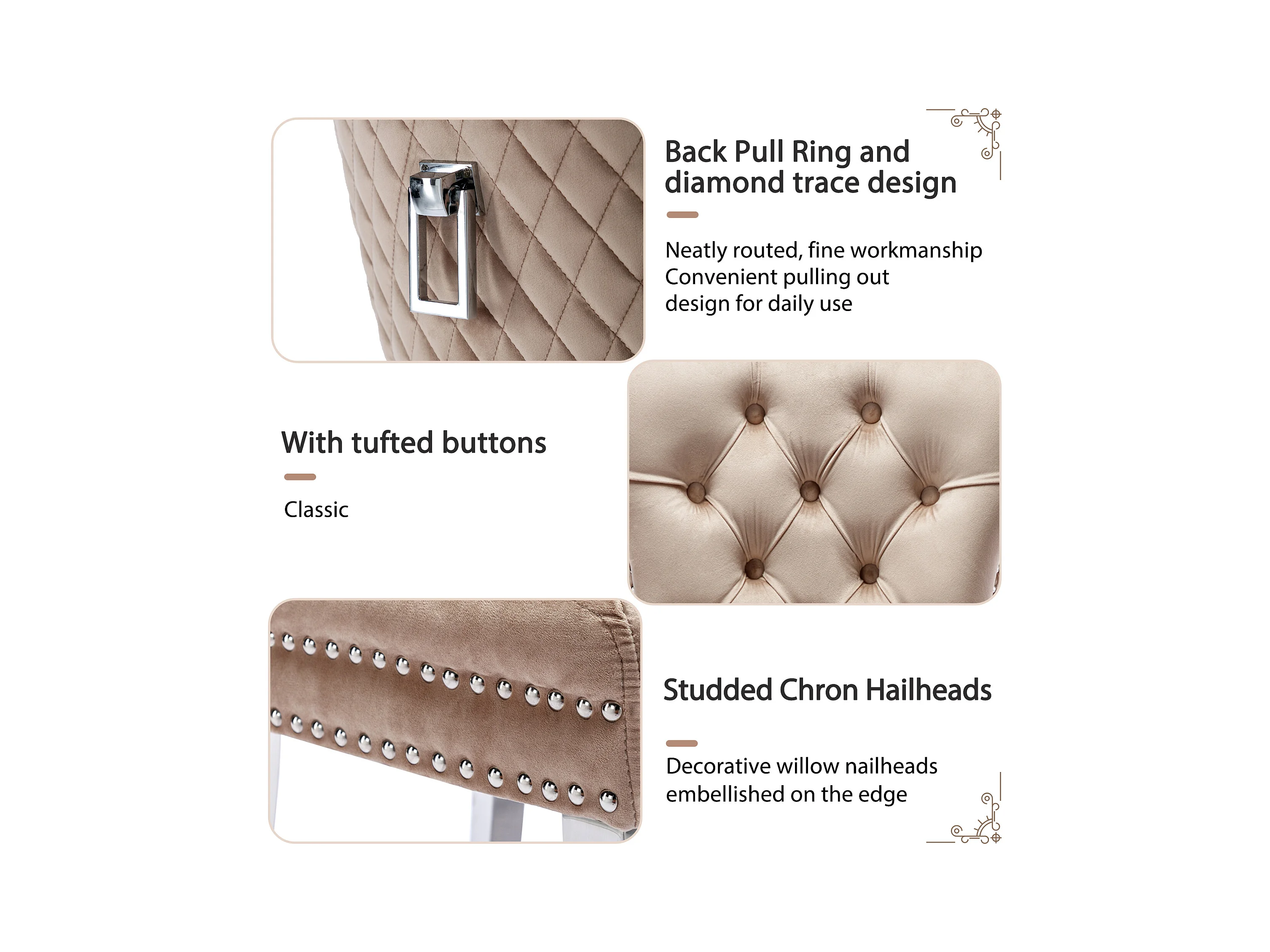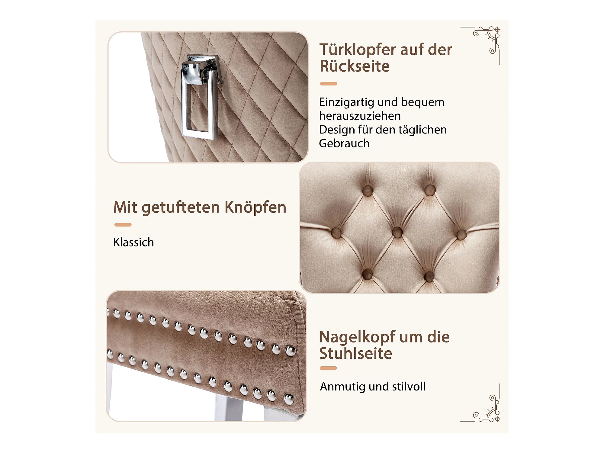 Chaise de salle à manger (6 pièces), fauteuil lounge avec accoudoirs, velours, clous décoratifs, pieds en métal, Beige (53x62.5x94.5 cm)